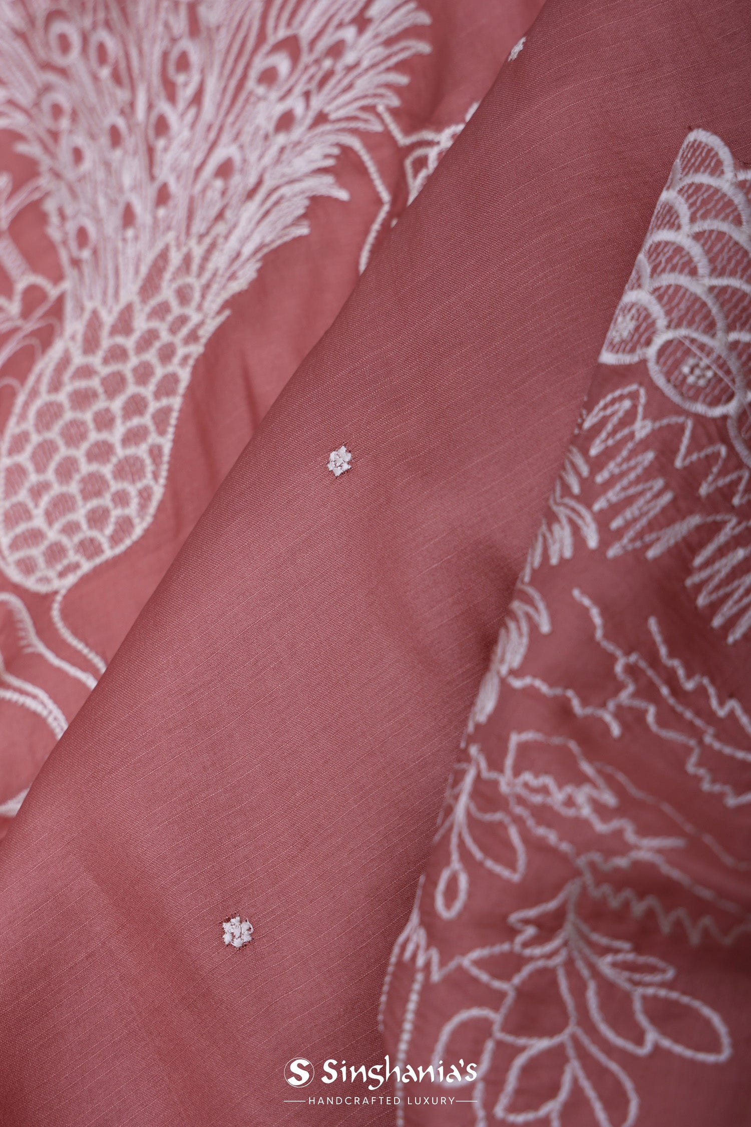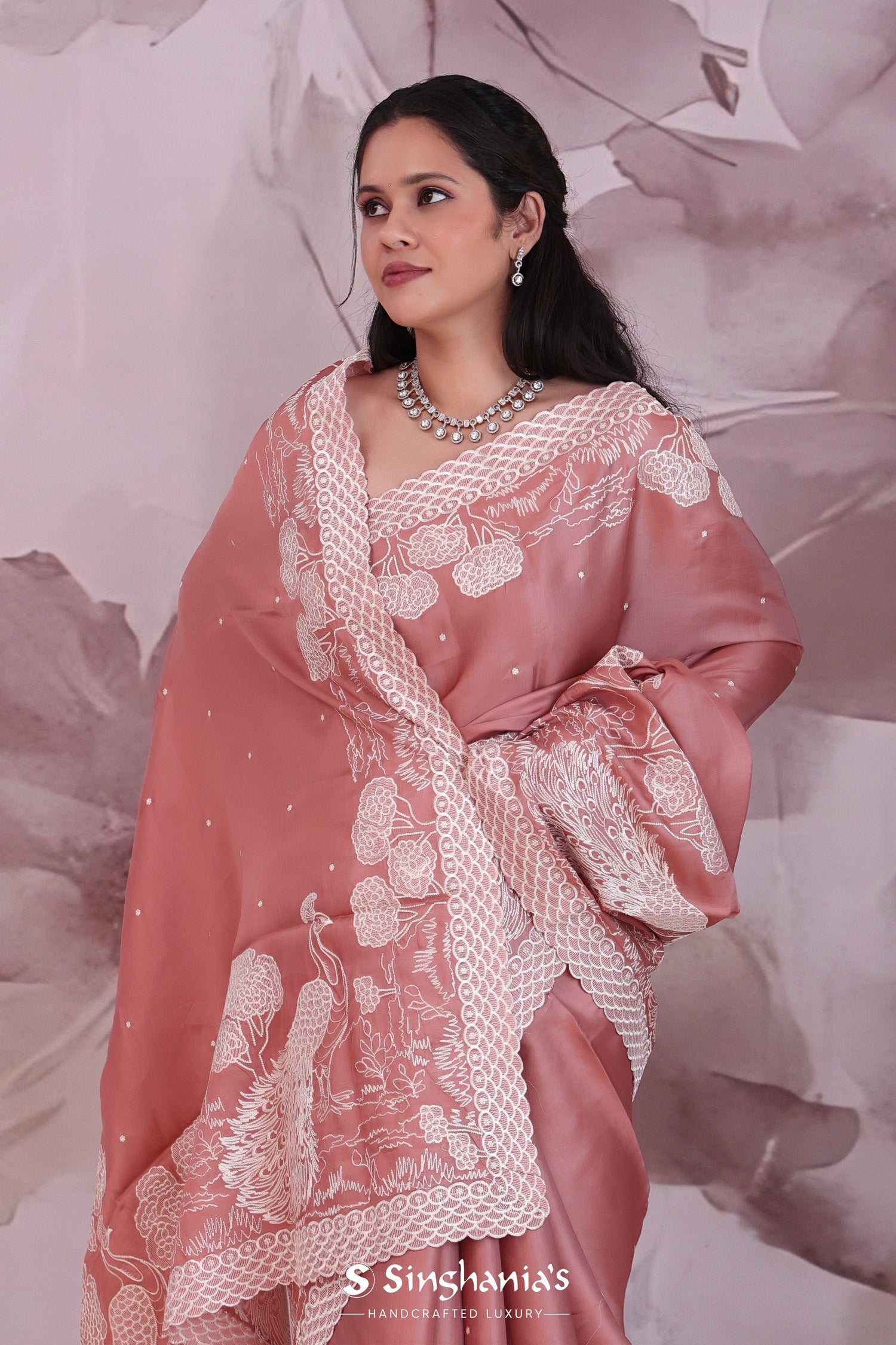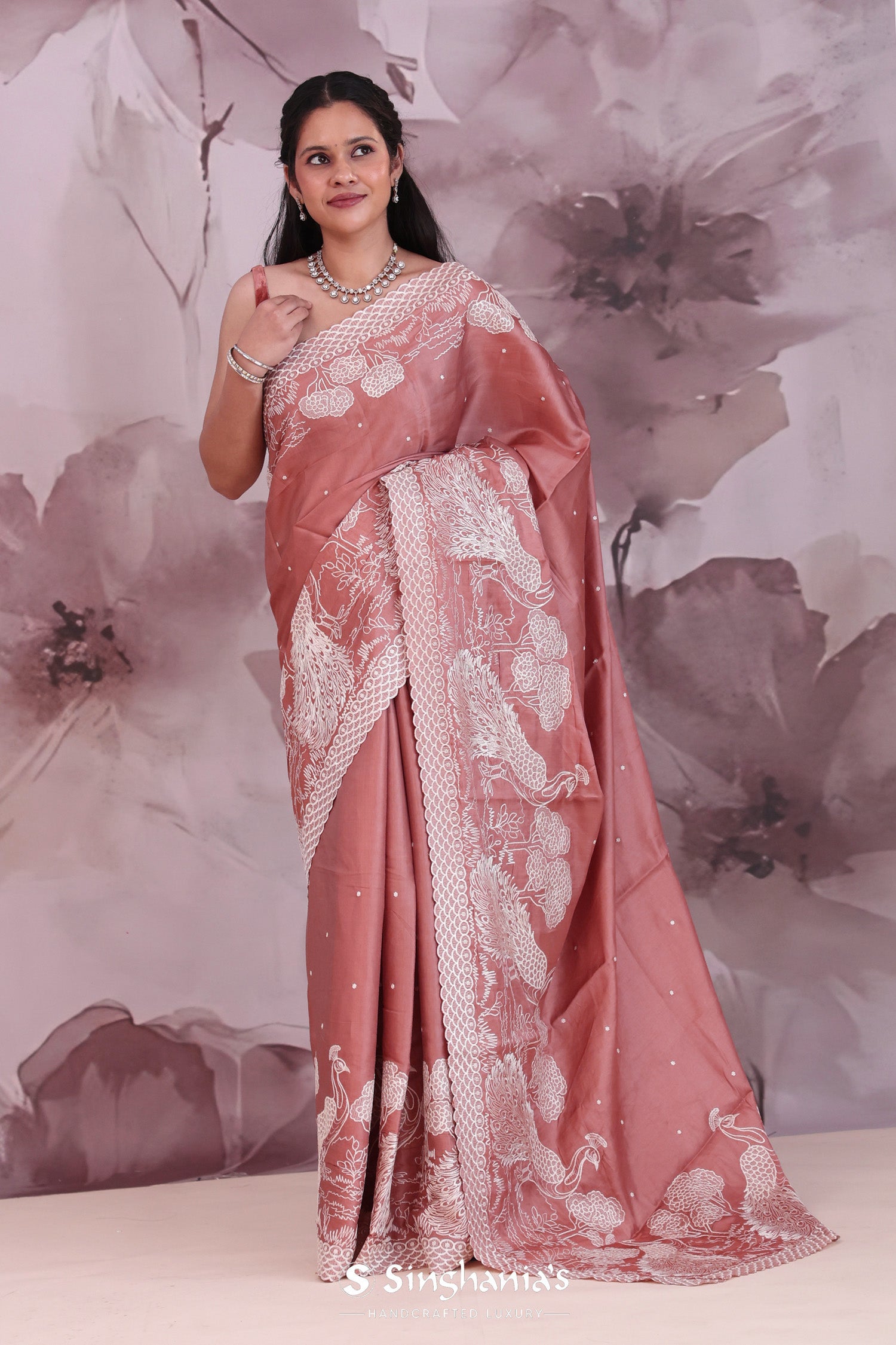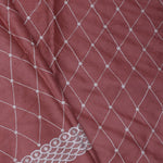 This Rose taupe soft silk saree features scallop border along with embroidery work featuring peacock and trees all along the border in contrast white color which is adding the charm to overall look.