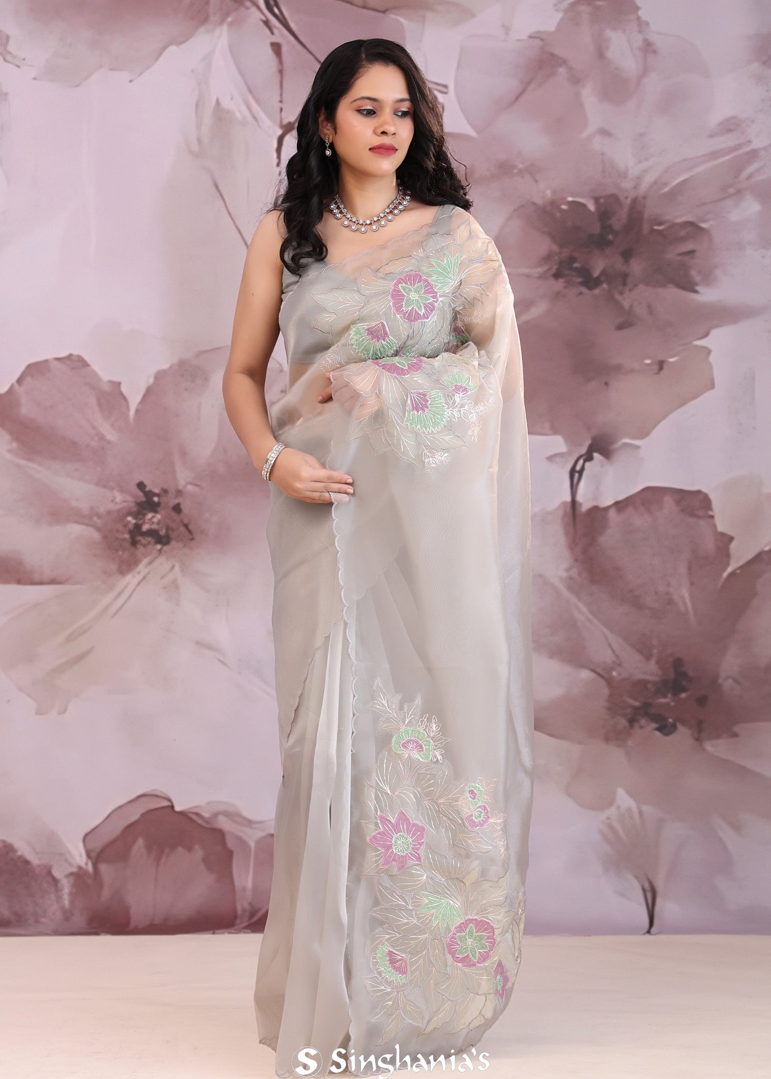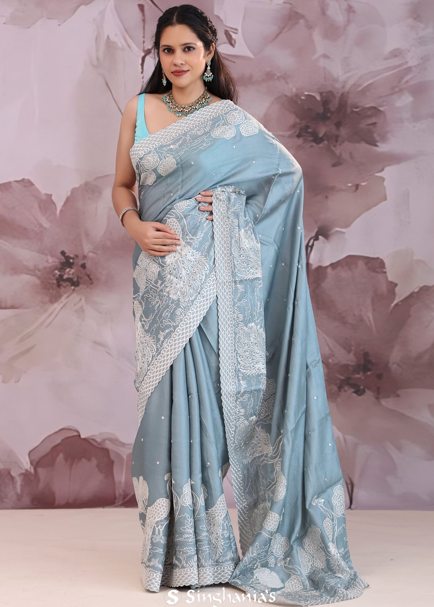 Dark Pastel Blue Organza Tissue Saree With Floral Embroidery