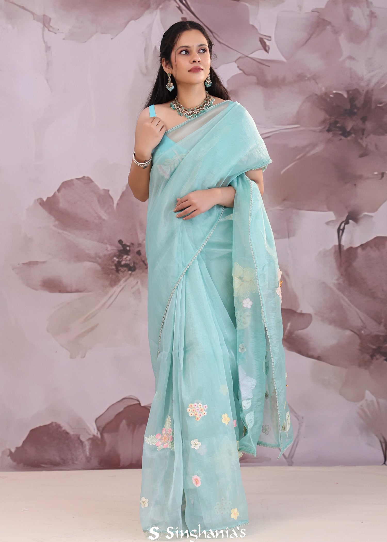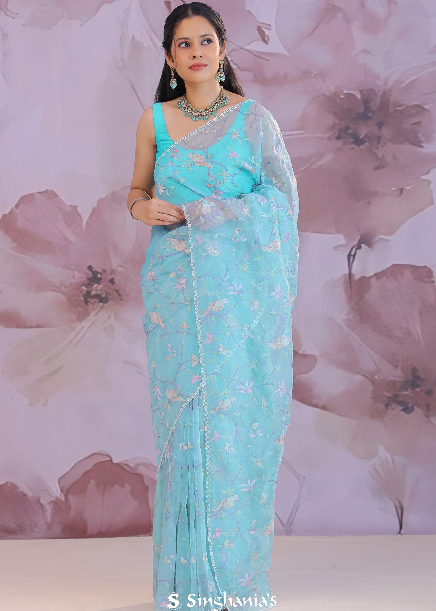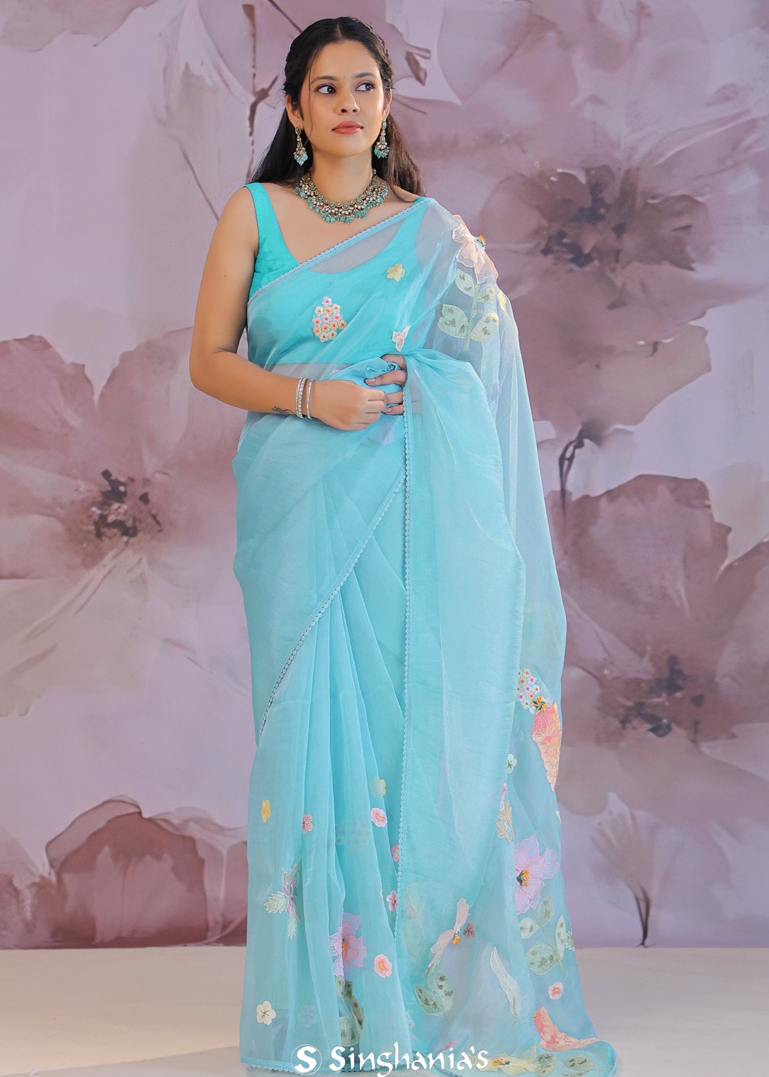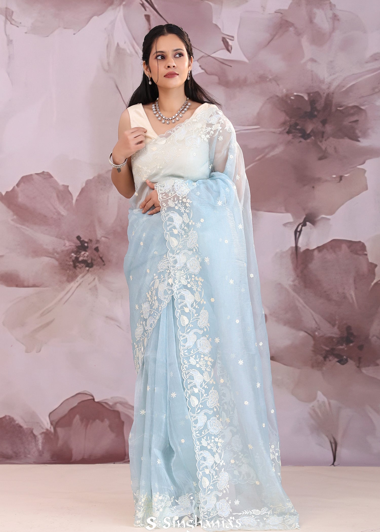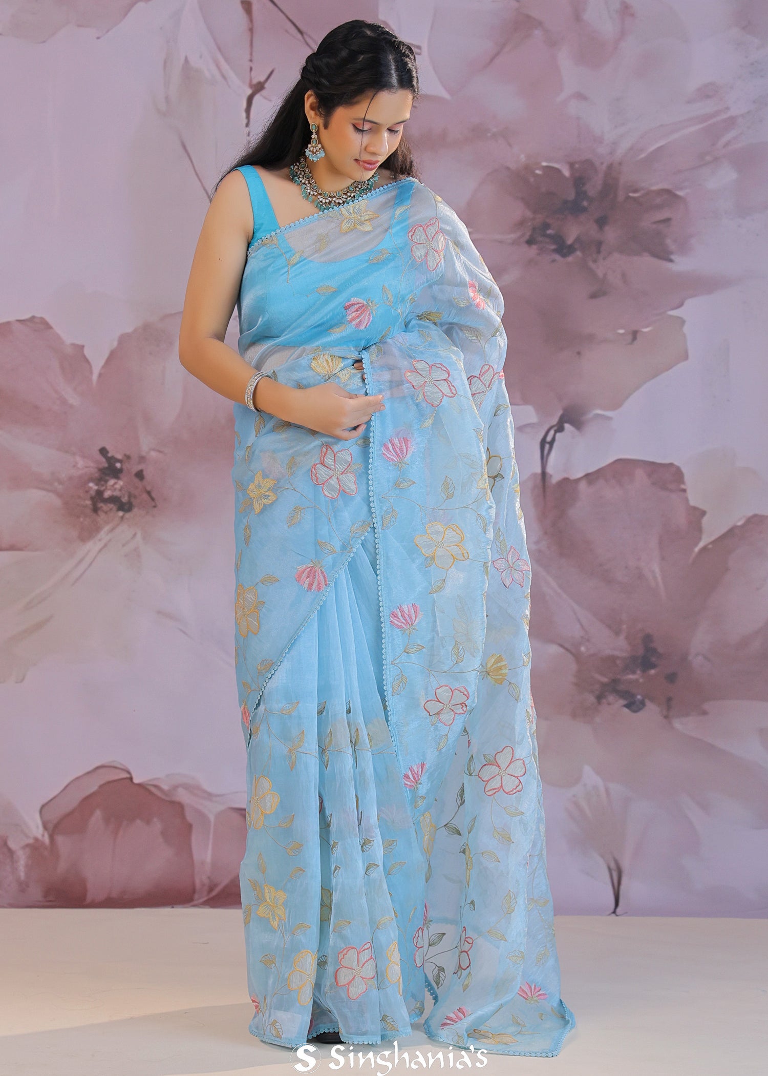 Sky Blue Organza Tissue Saree With Floral Embroidery