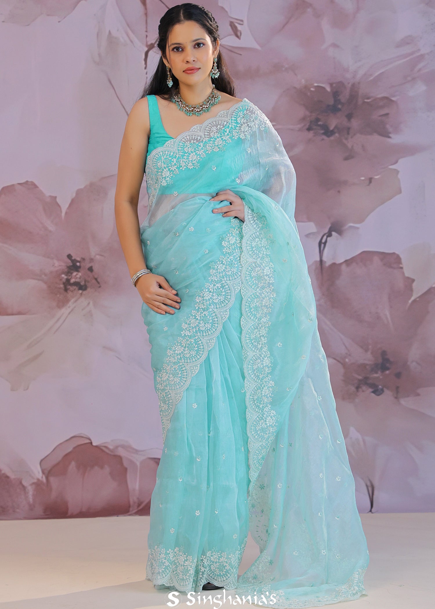 Glacier Blue Organza Tissue Saree With Scallop Border