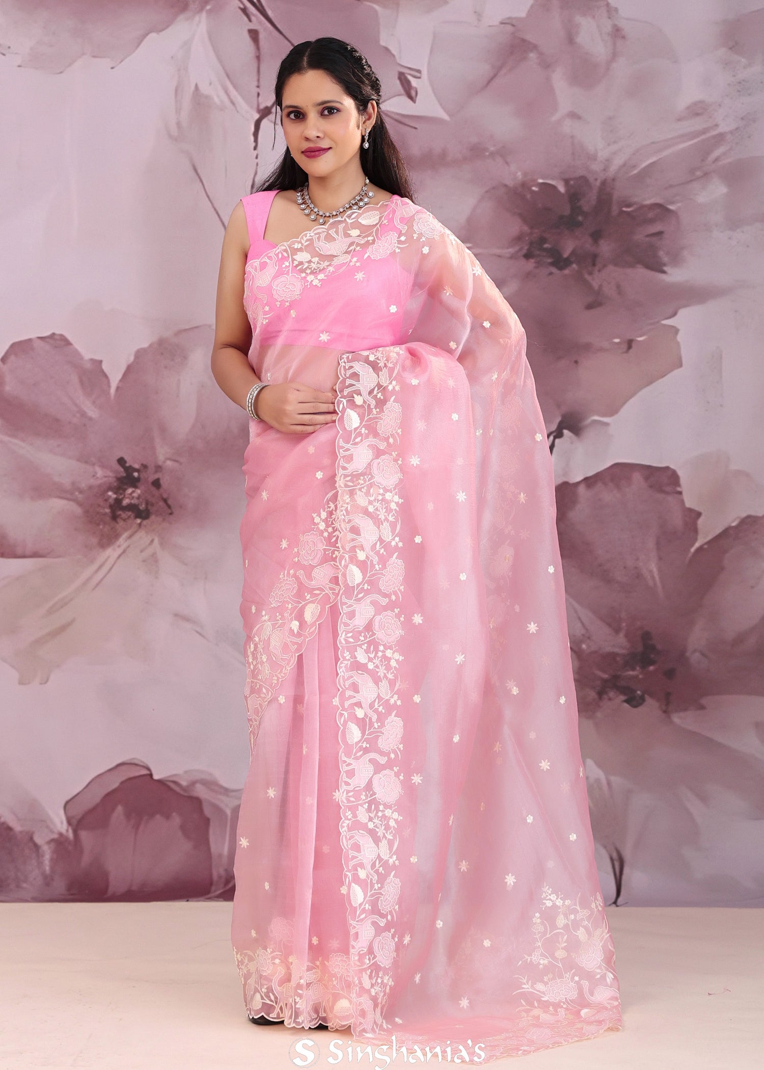 Fuchsia Pink Organza Tissue Saree With Scallop Border