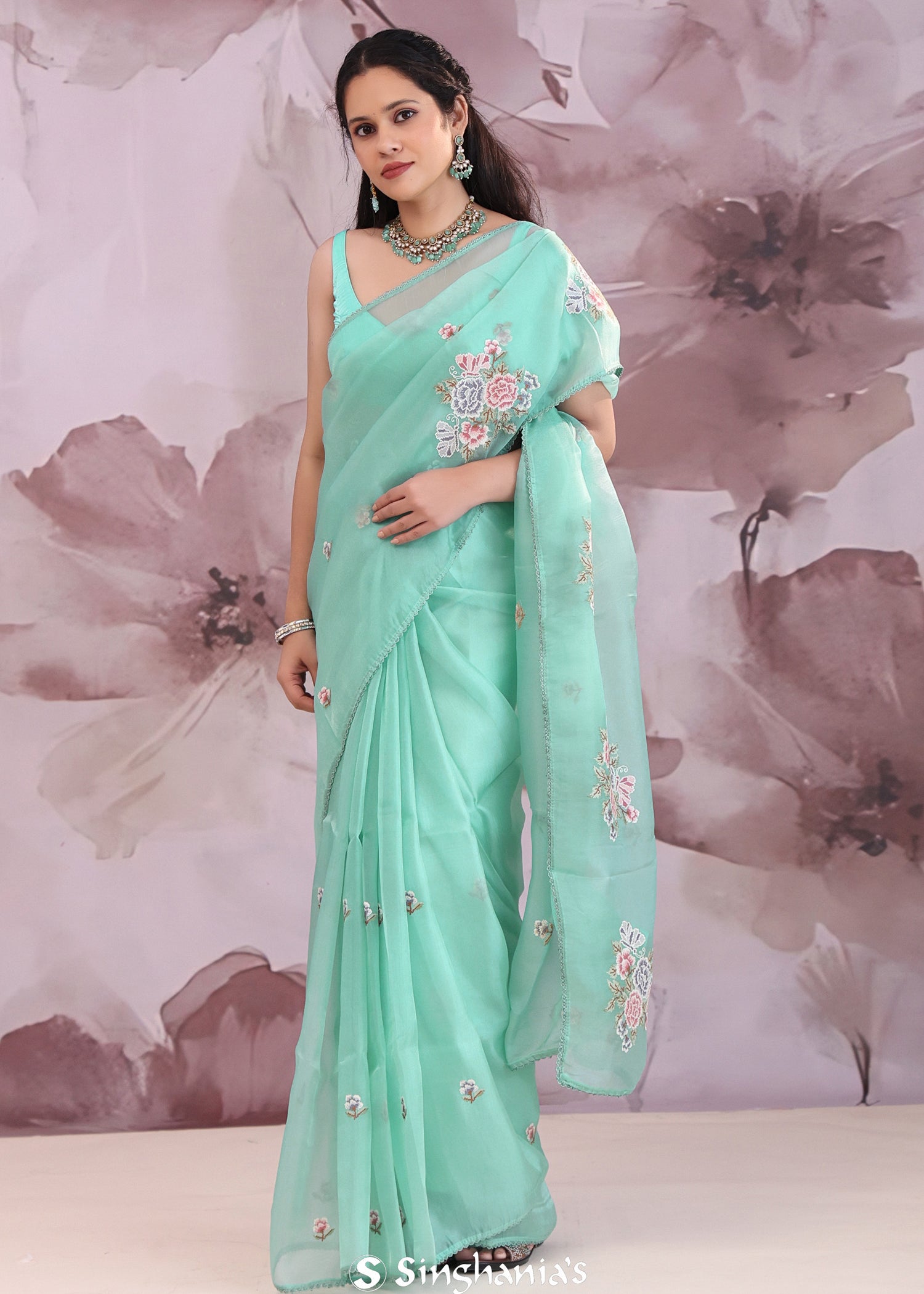 Turquoise Soft Organza Tissue Saree With Petit Point Saree