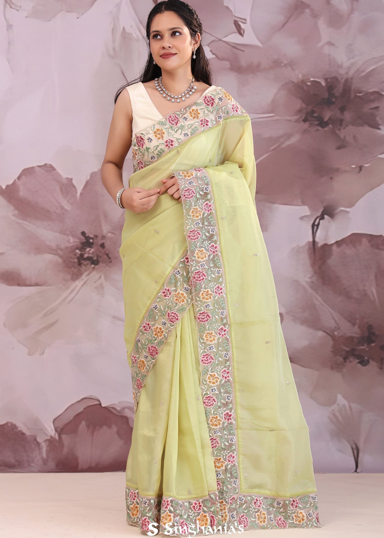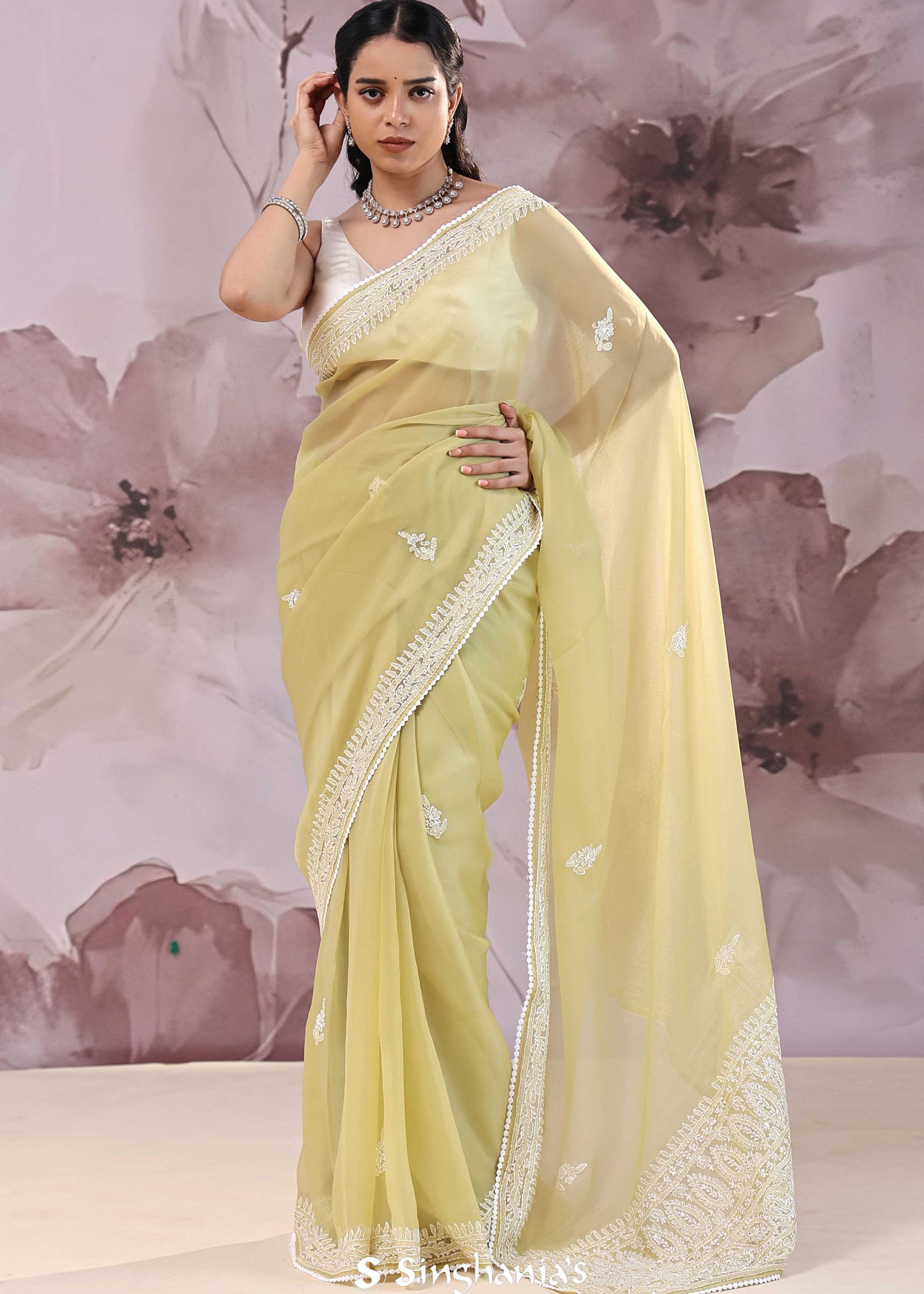 Pale Lime Yellow Organza Saree With Parsi Embroidery