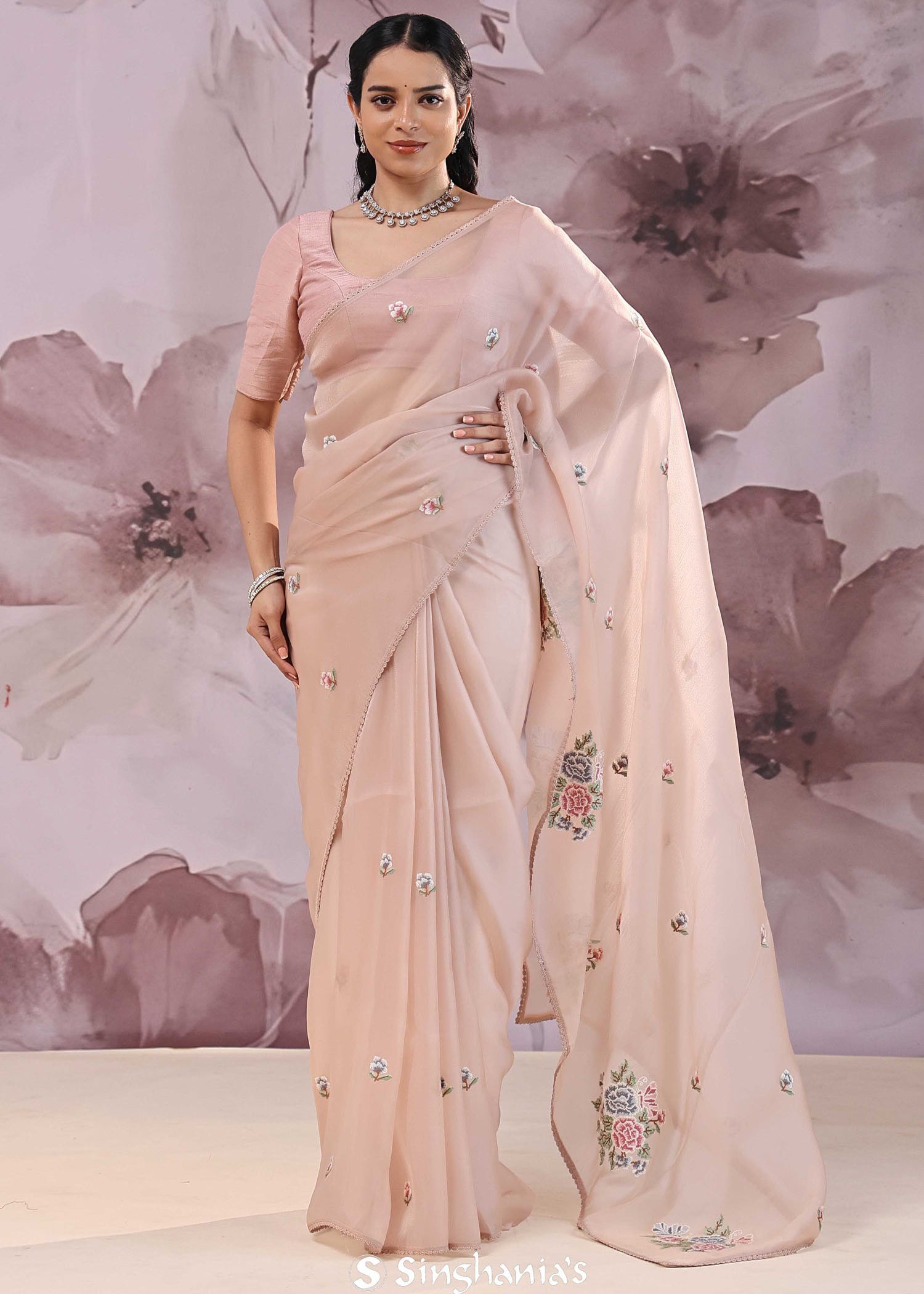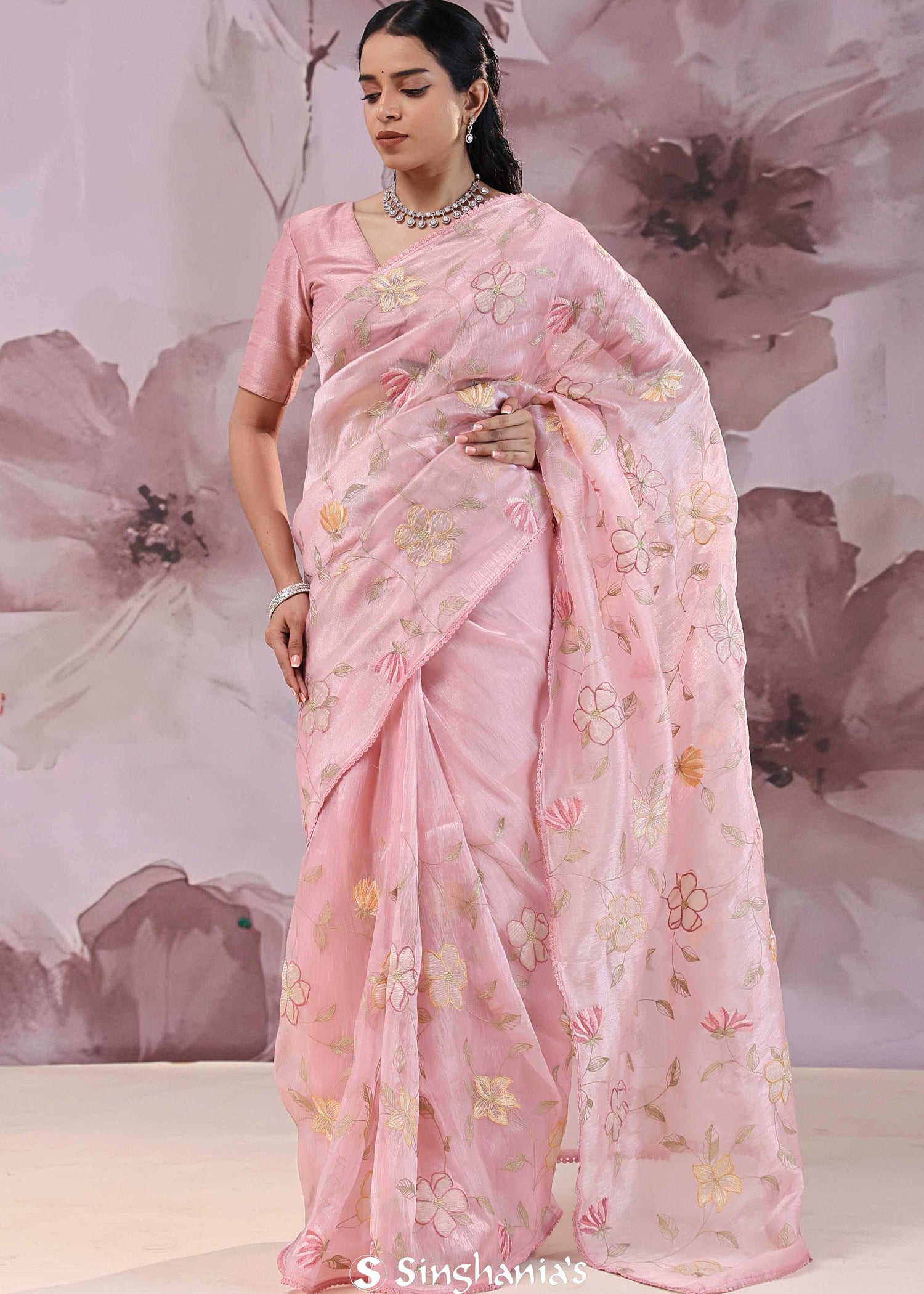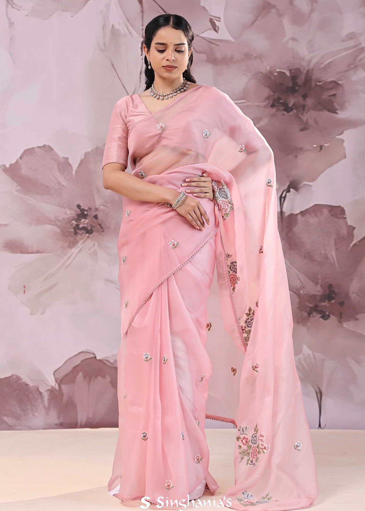 Pearl Pink Organza Saree With Embroidery