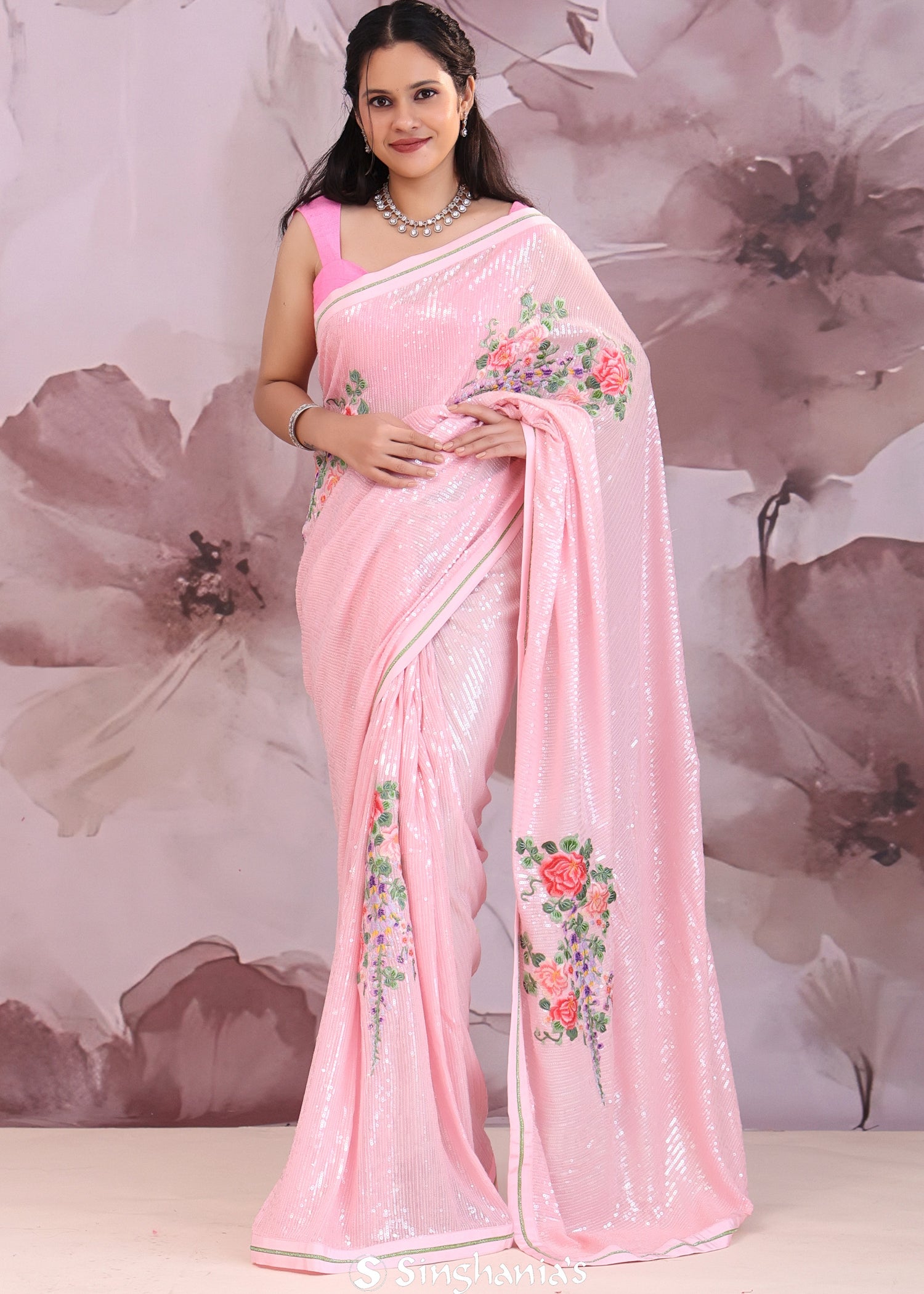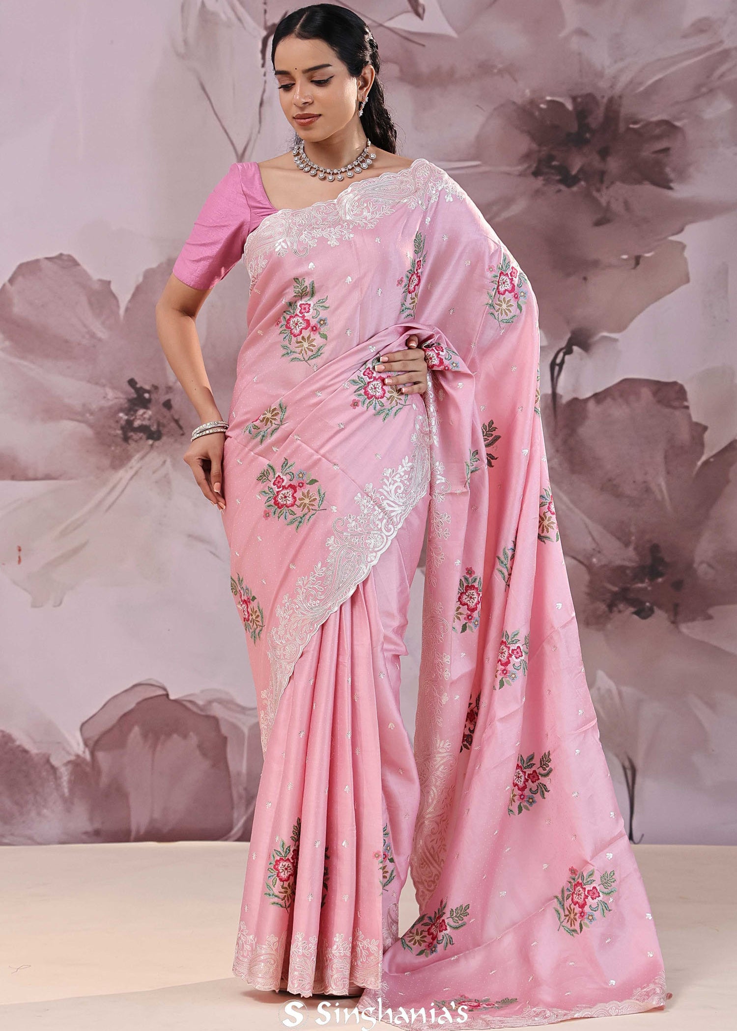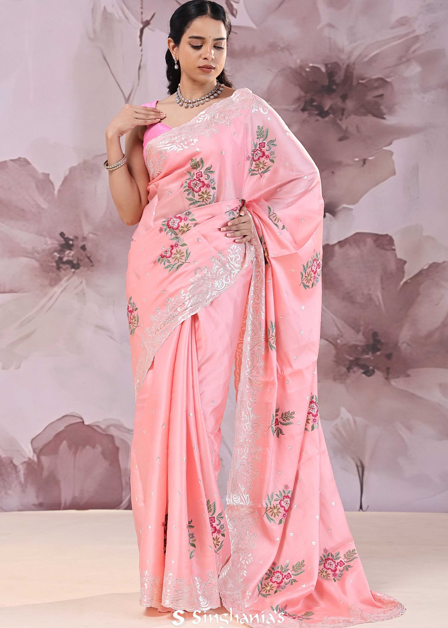 Pearl Pink Organza Saree With Embroidery