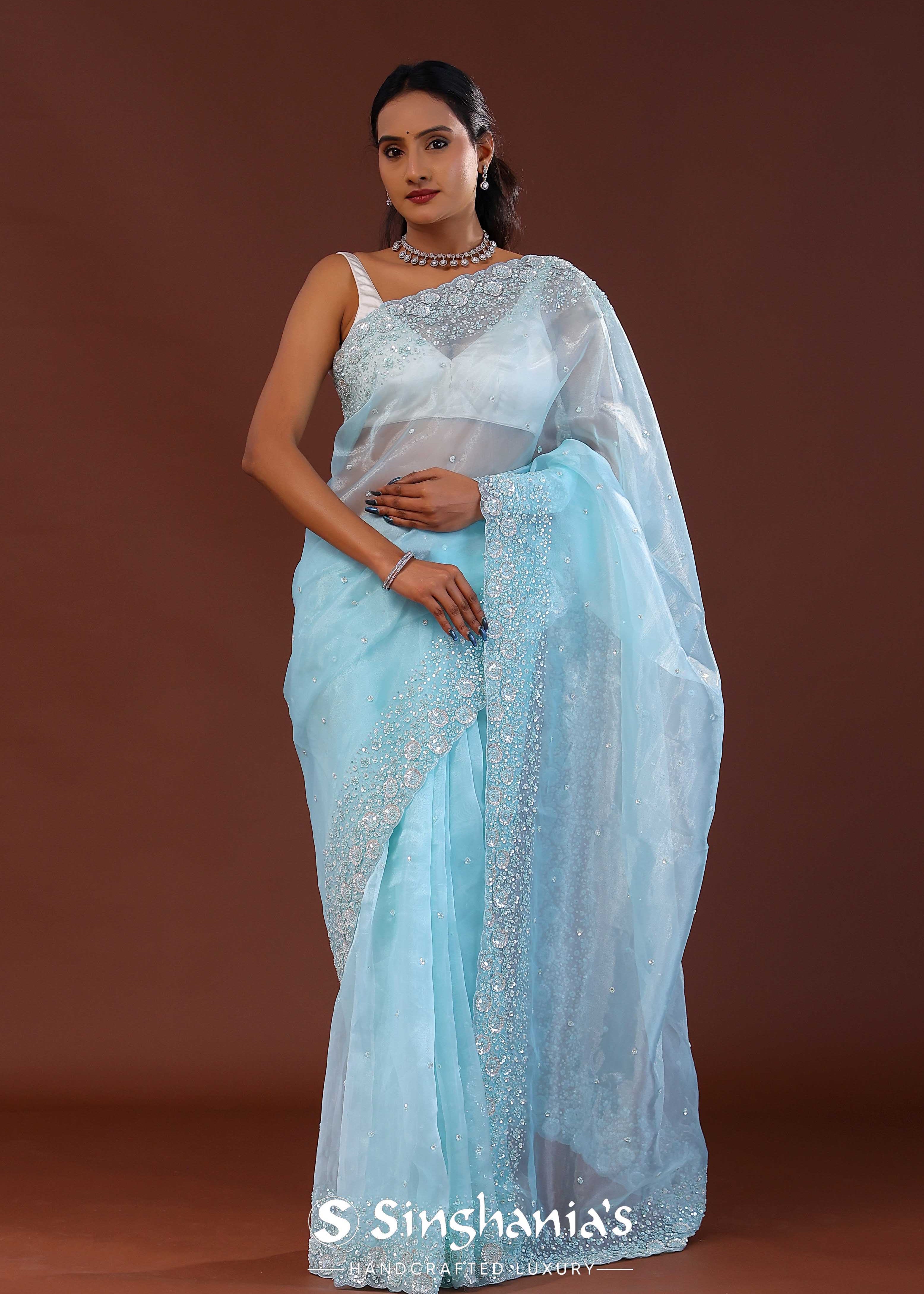 Sky Blue Tissue Organza Saree With Scallop Border