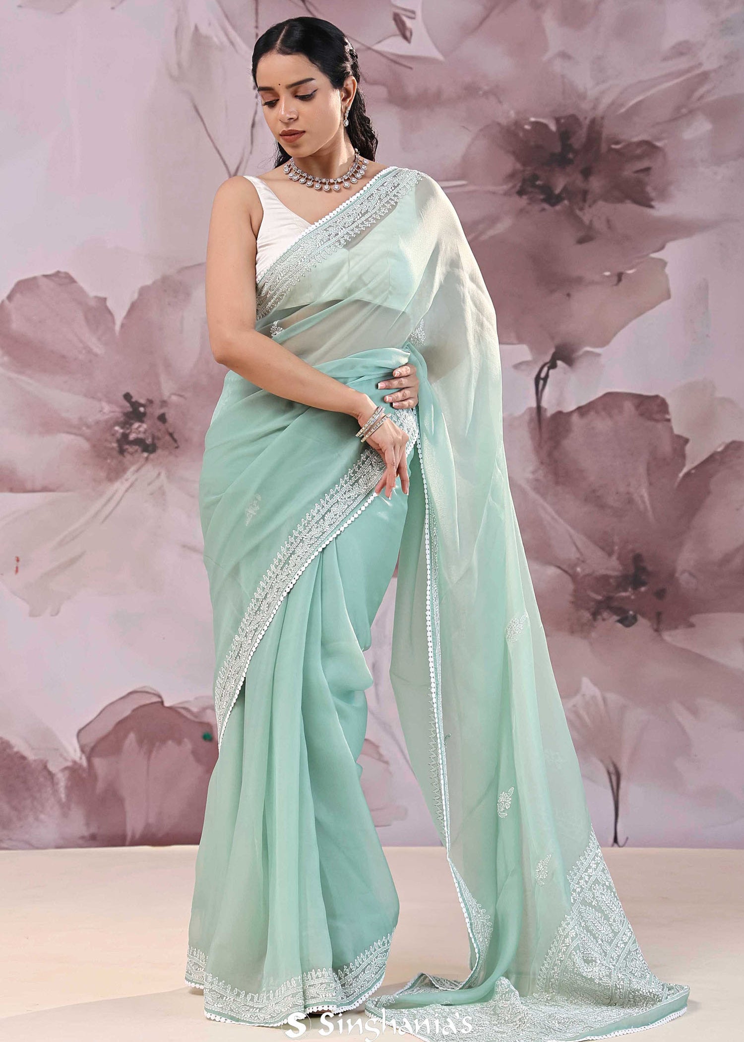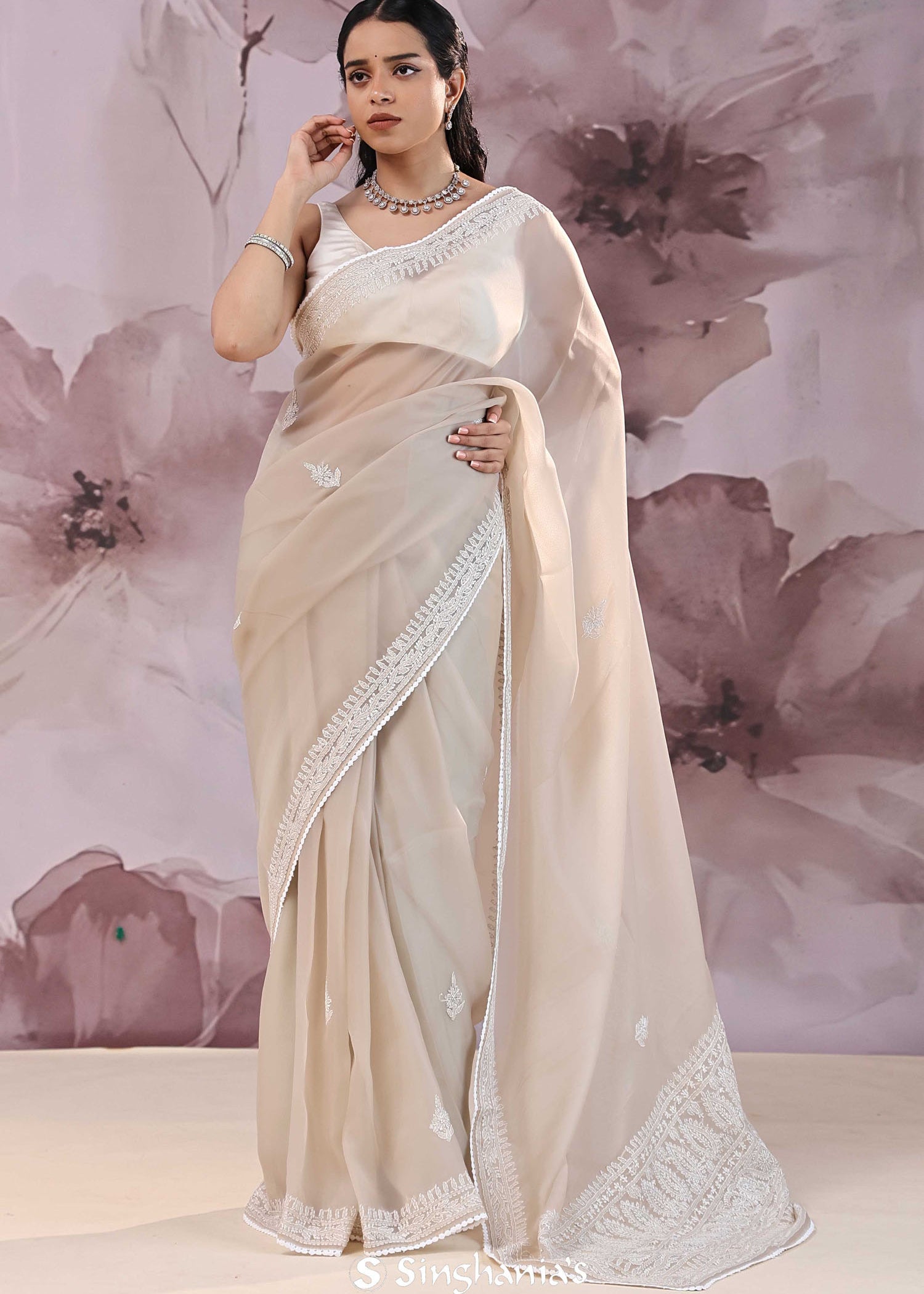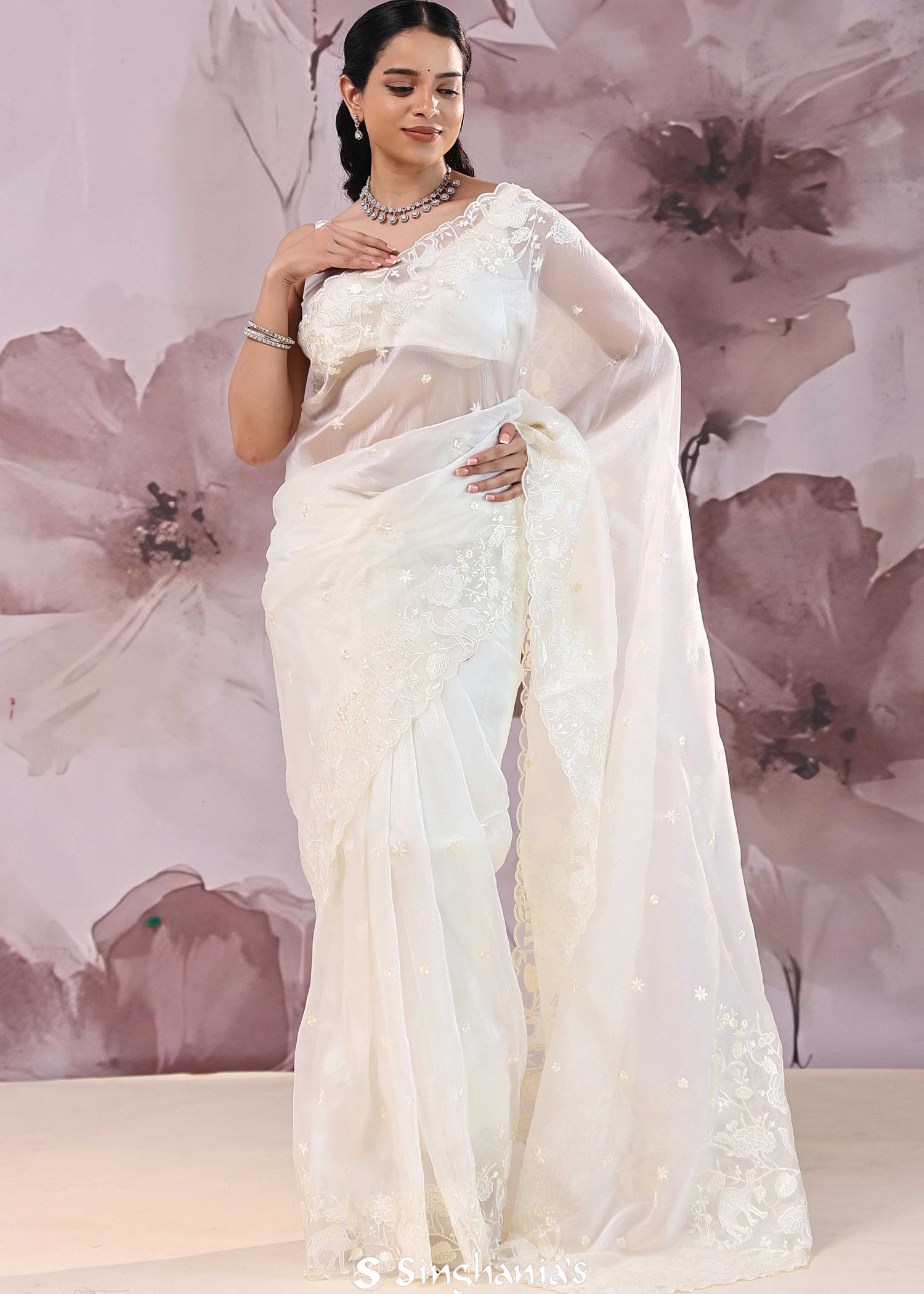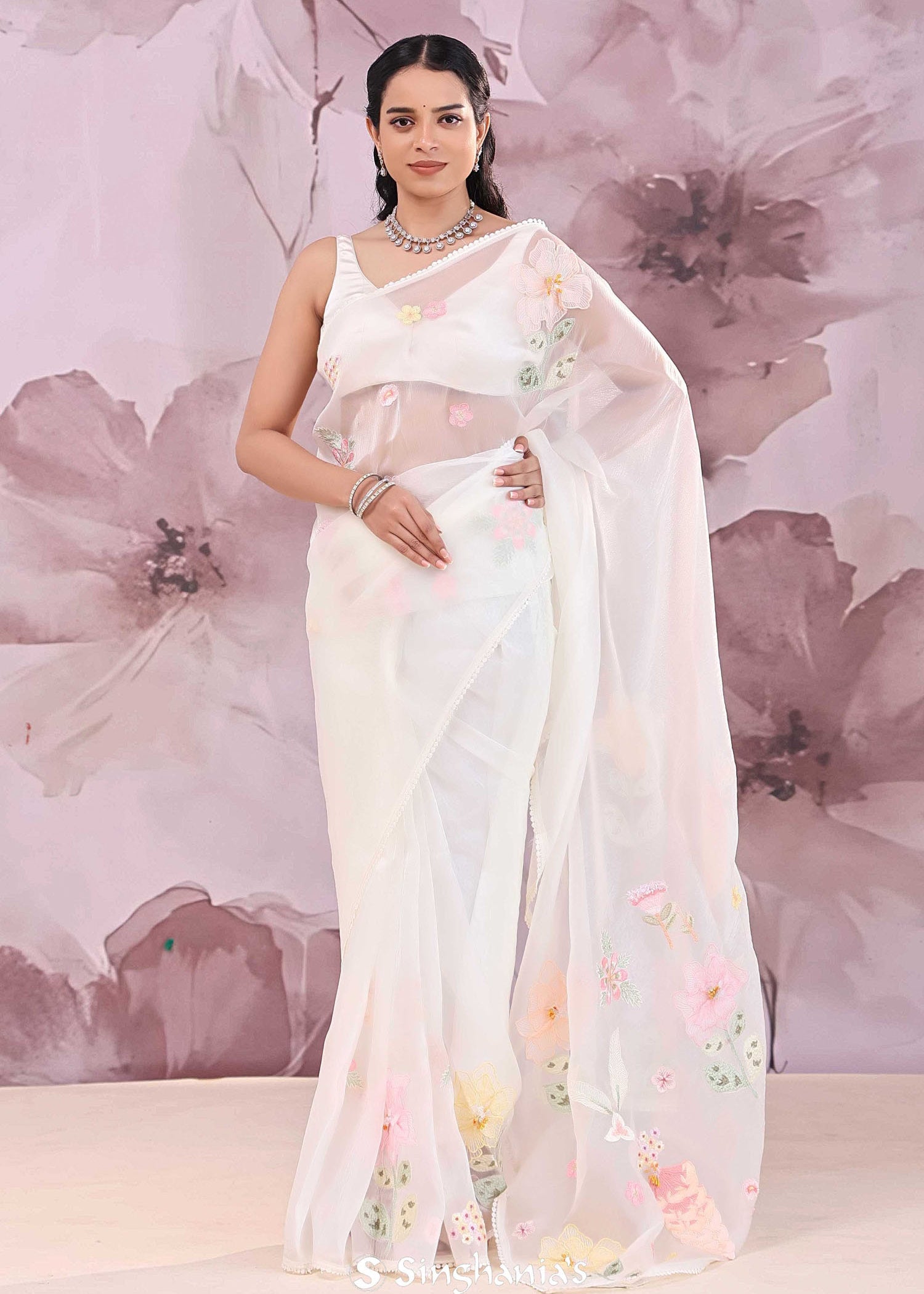 White Organza Saree With Floral Embroidery