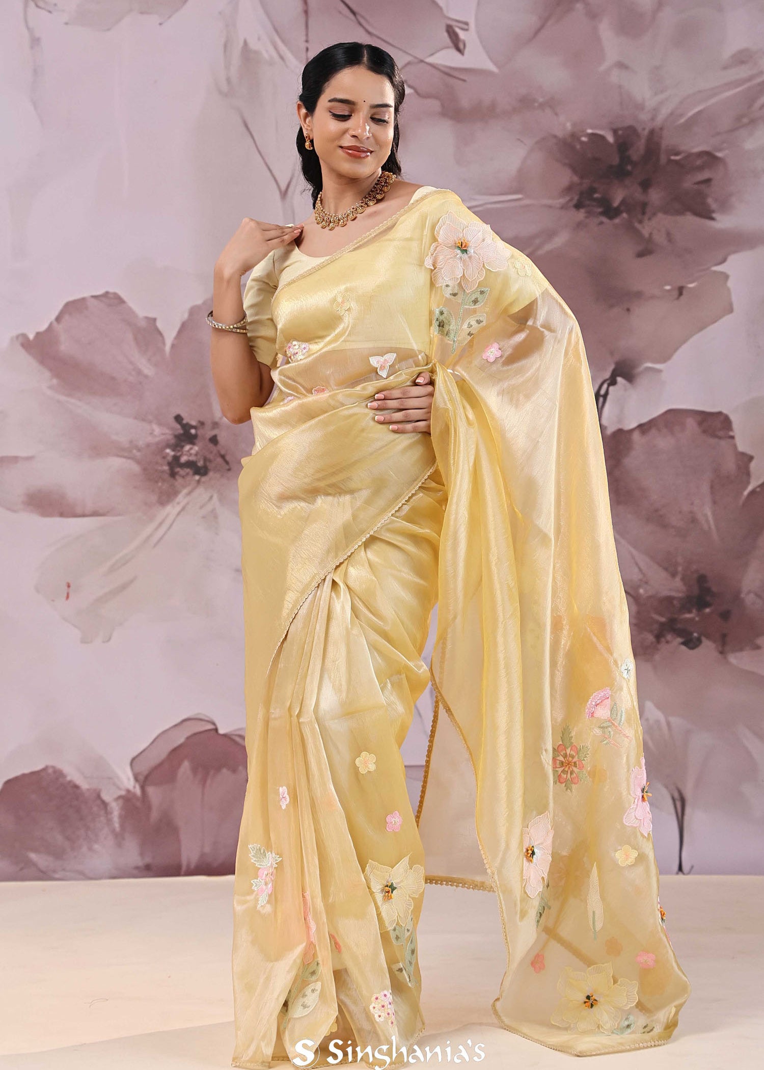 Brass Yellow Organza Saree With Embroidery
