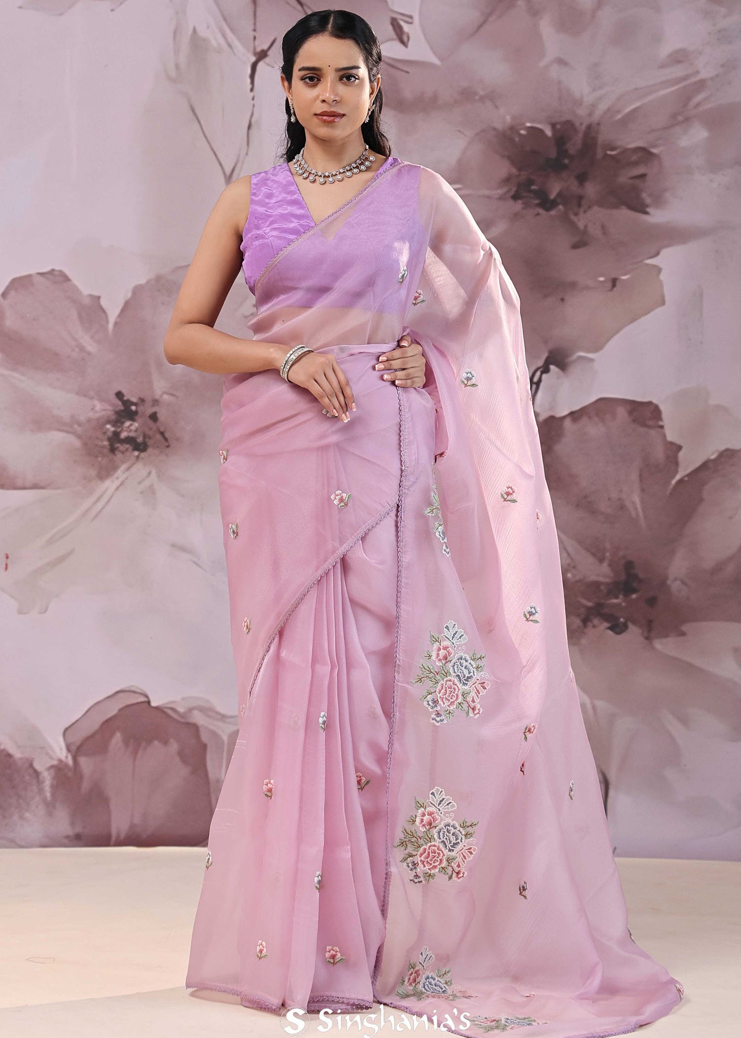 Lavender Pink Organza Saree With Petit Embroidery