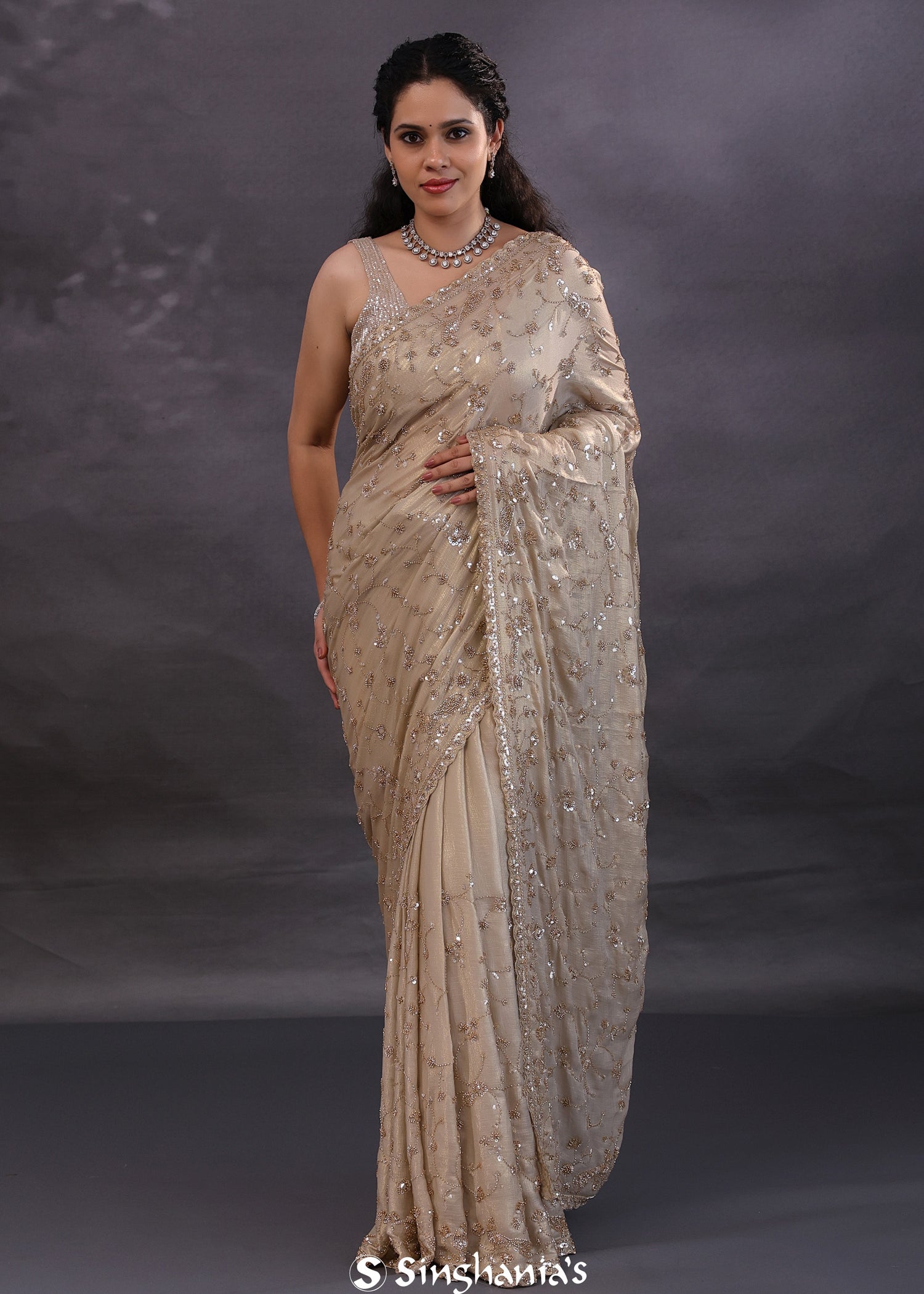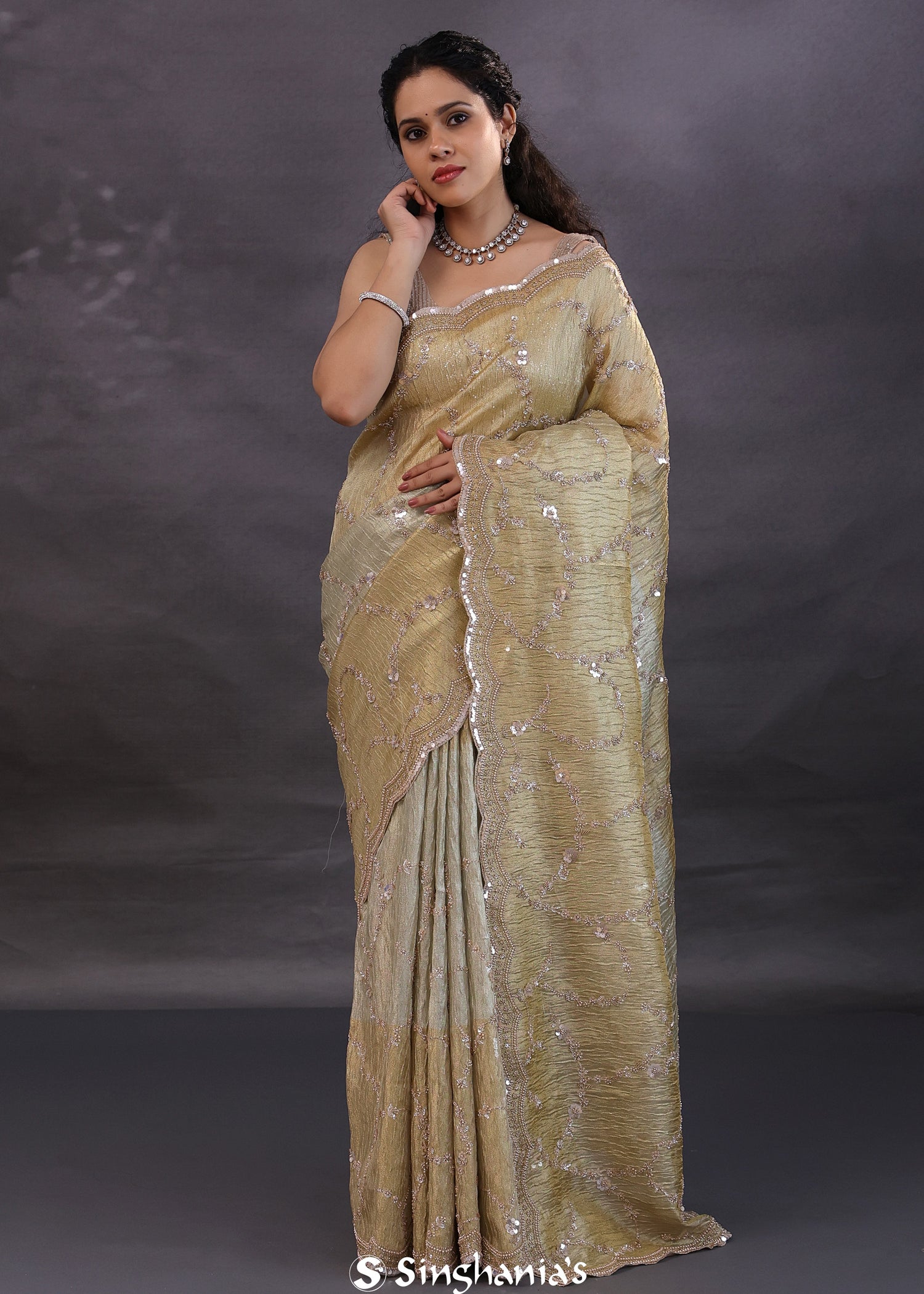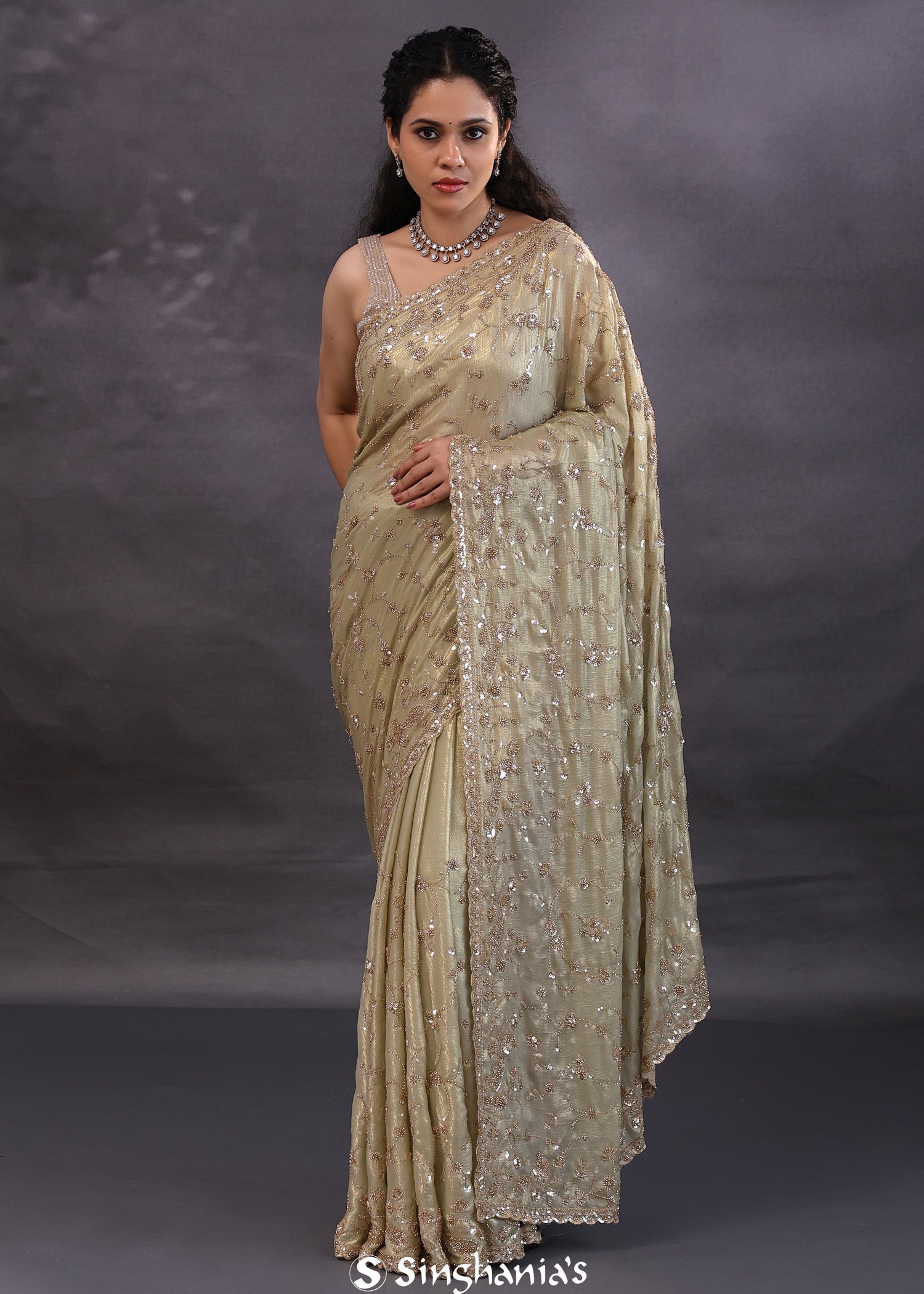 Muted Gold Fancy Tissue Saree With Floral Embroidery