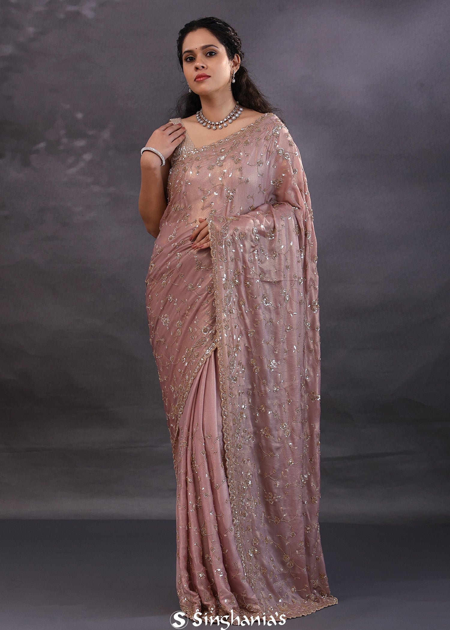 Dusty Lavender Organza Tissue Saree With Embroidery Work