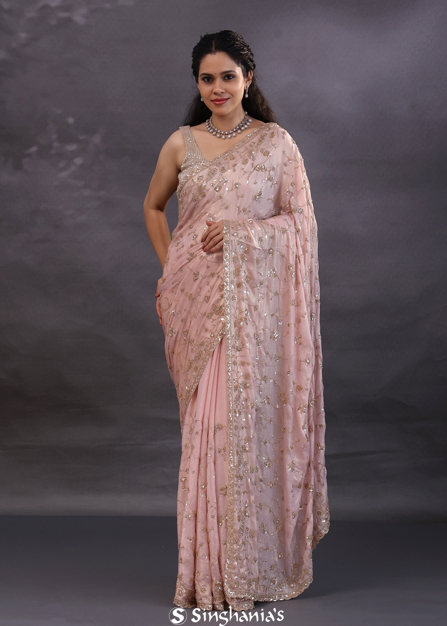 Pastel Pink Fancy Tissue Saree With Floral Embroidery