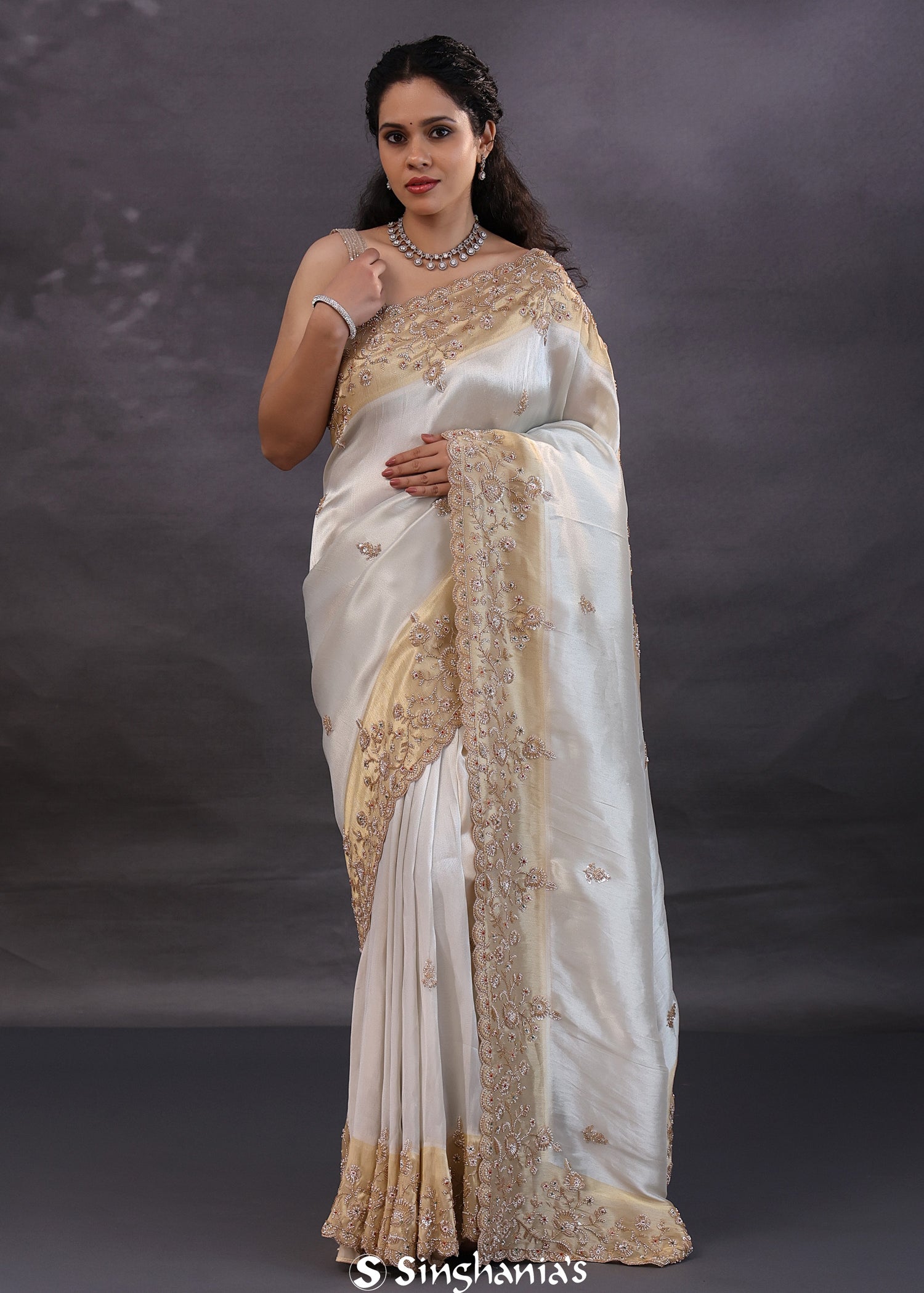 Pastel Gold Fancy Tissue Saree With Floral Embroidery