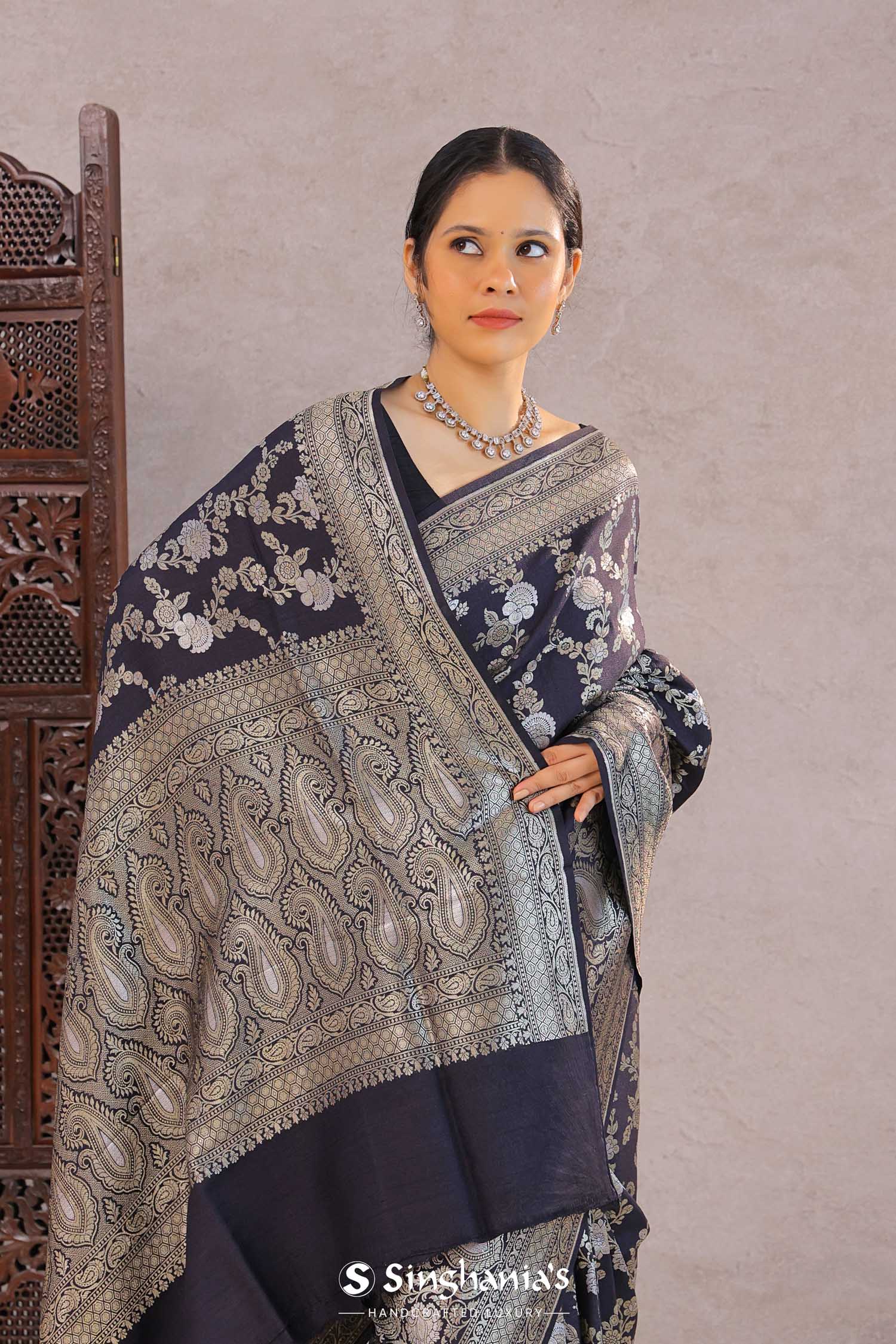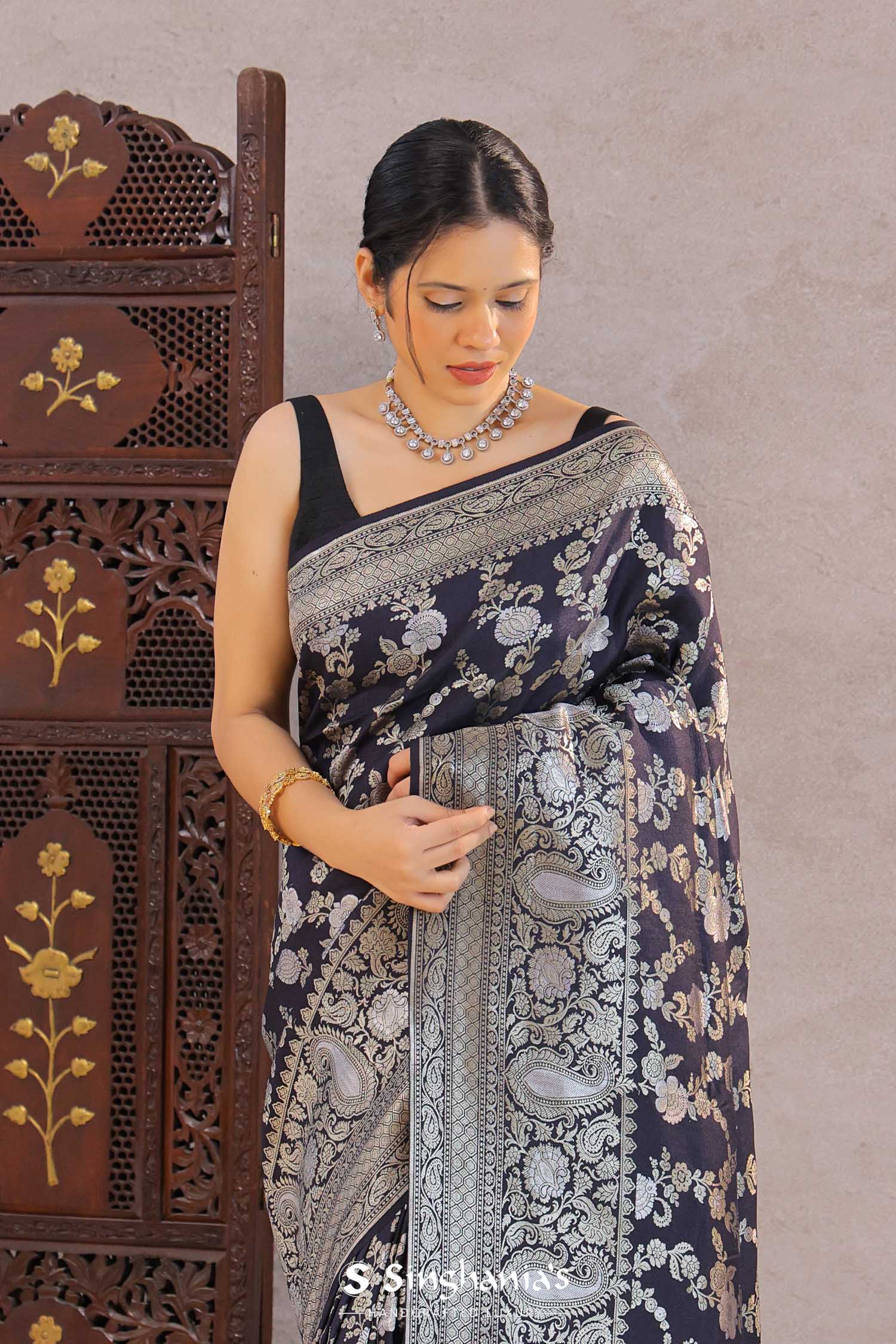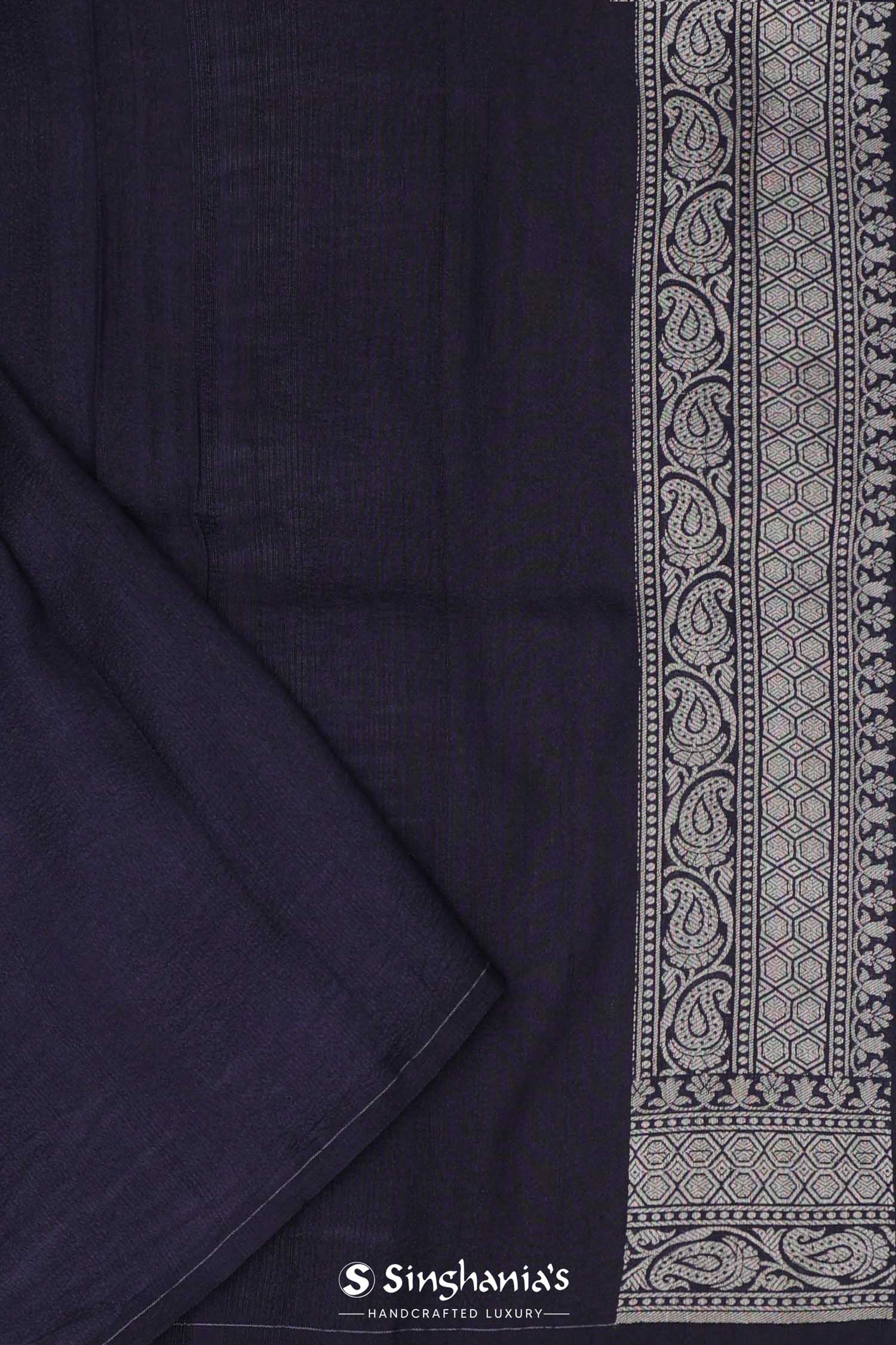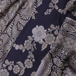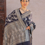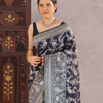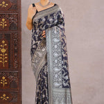 Navy Blue Banarasi Munga Tussar Silk Saree With Floral Jaal