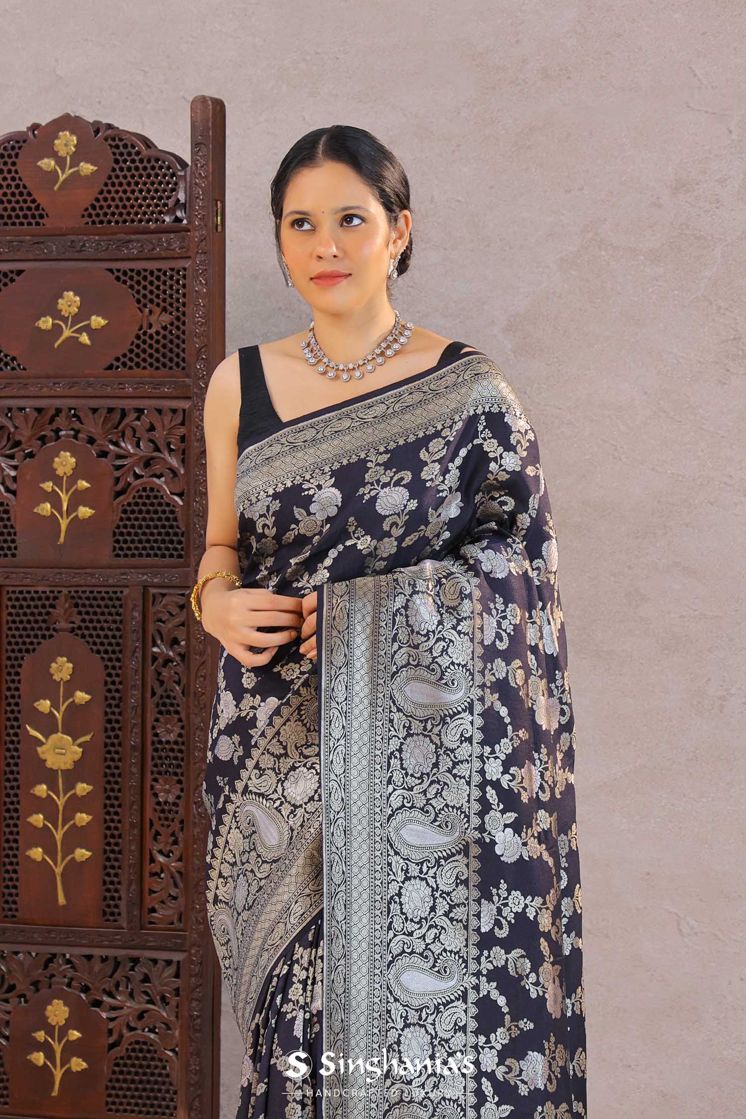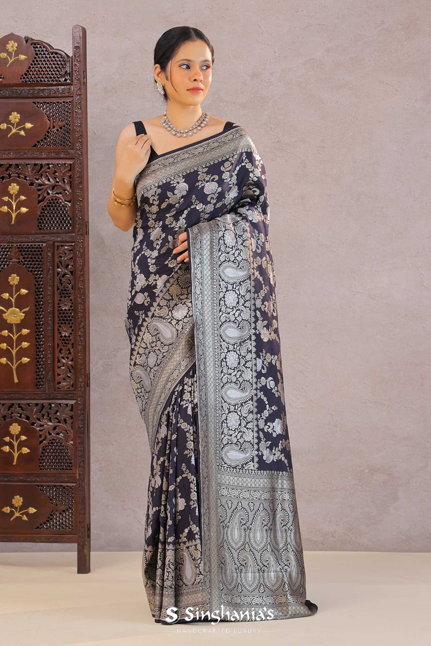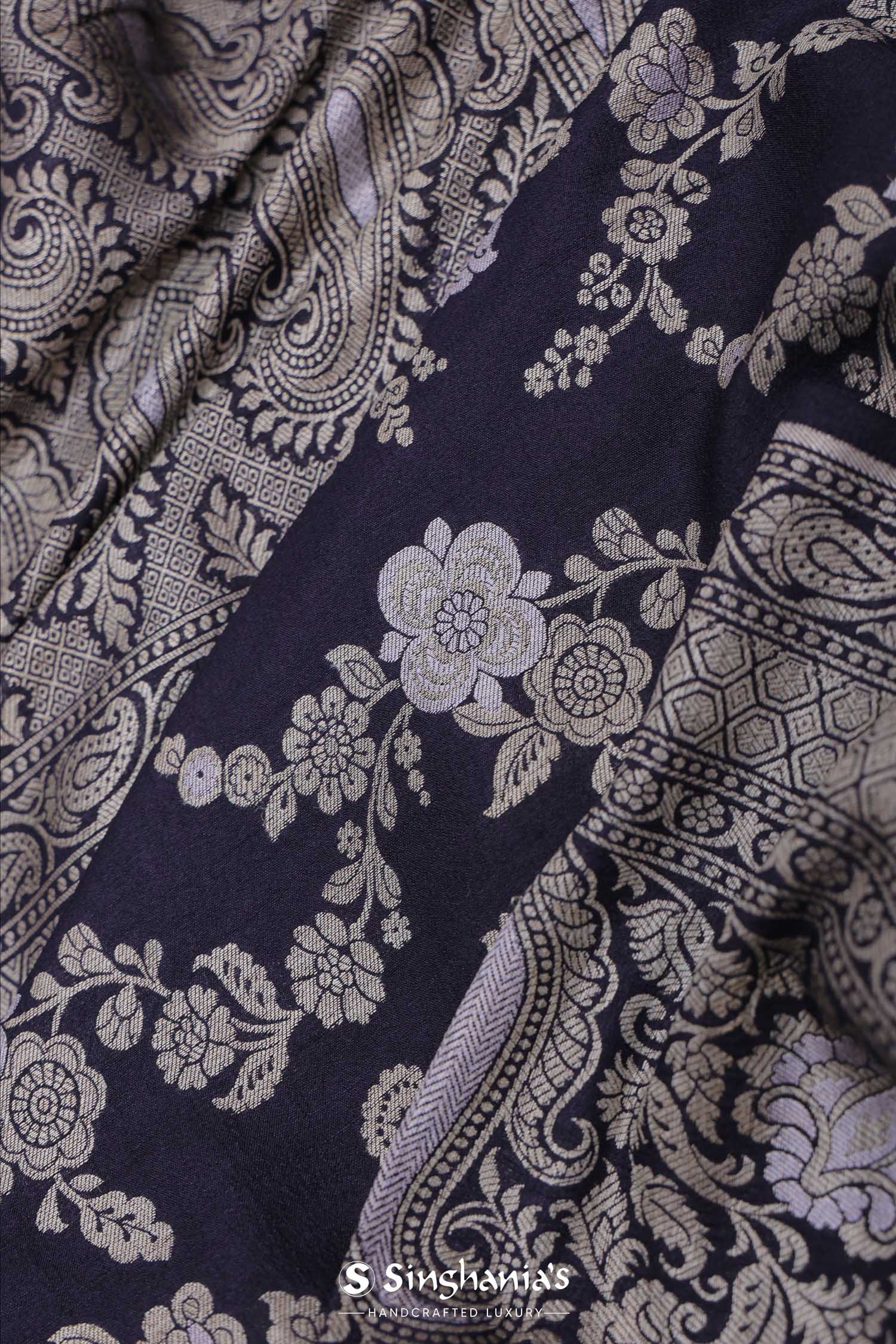 Navy Blue Banarasi Munga Tussar Silk Saree With Floral Jaal