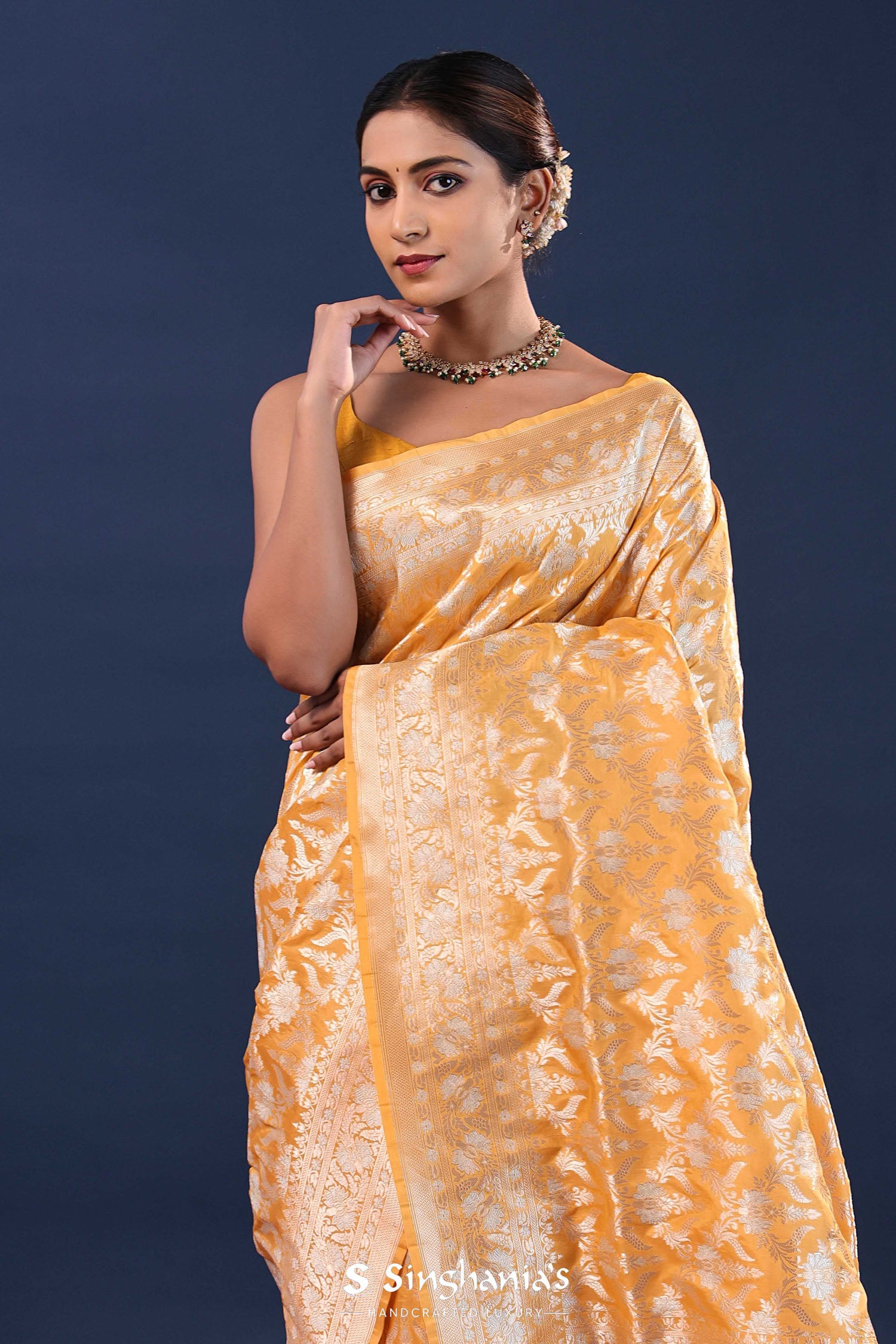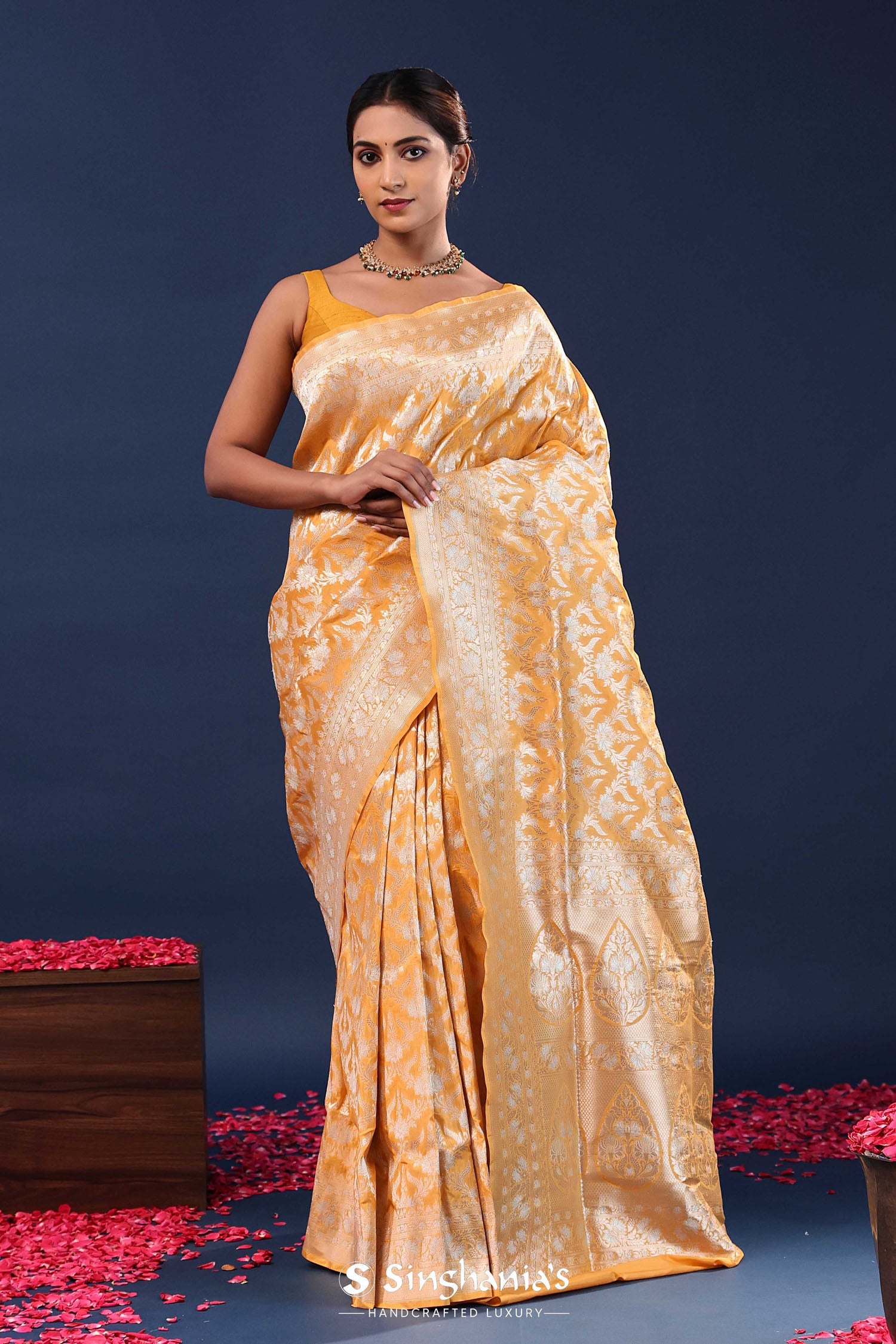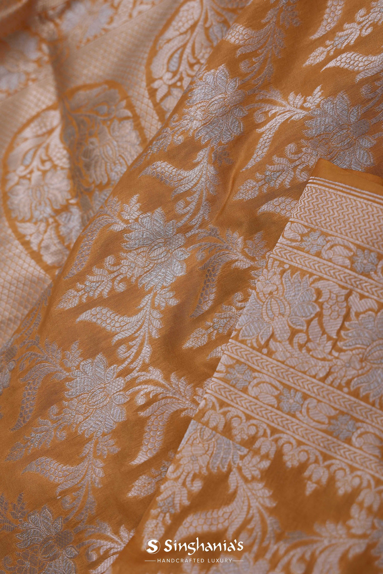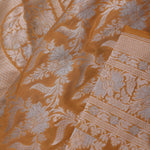 Tiger orange banarasi saree features floral jaal woven with zari spread across the body along with floral self border is a ideal choice for any occasion.Making you satisfy with each drape.
