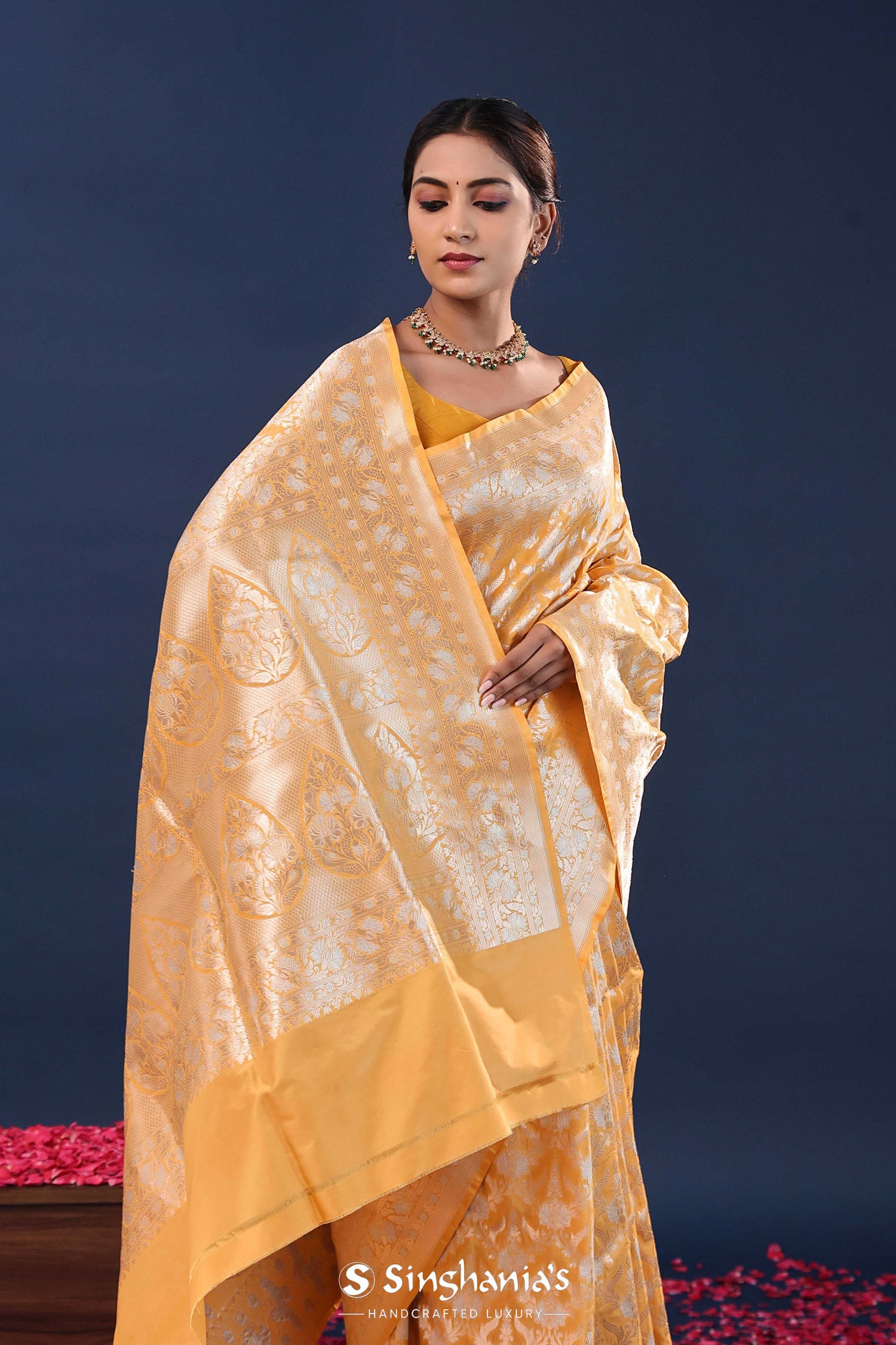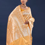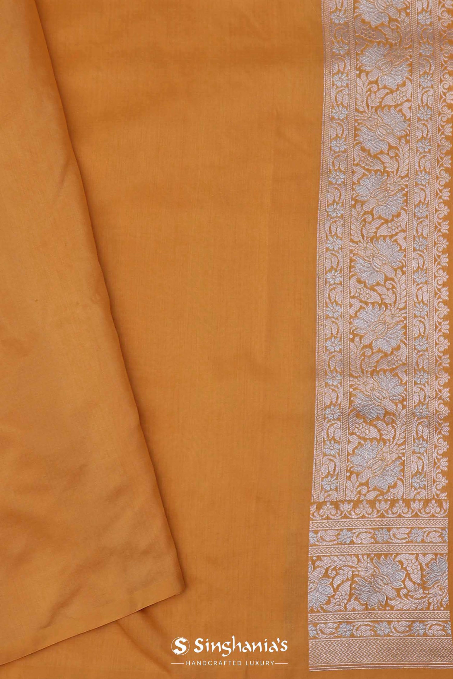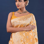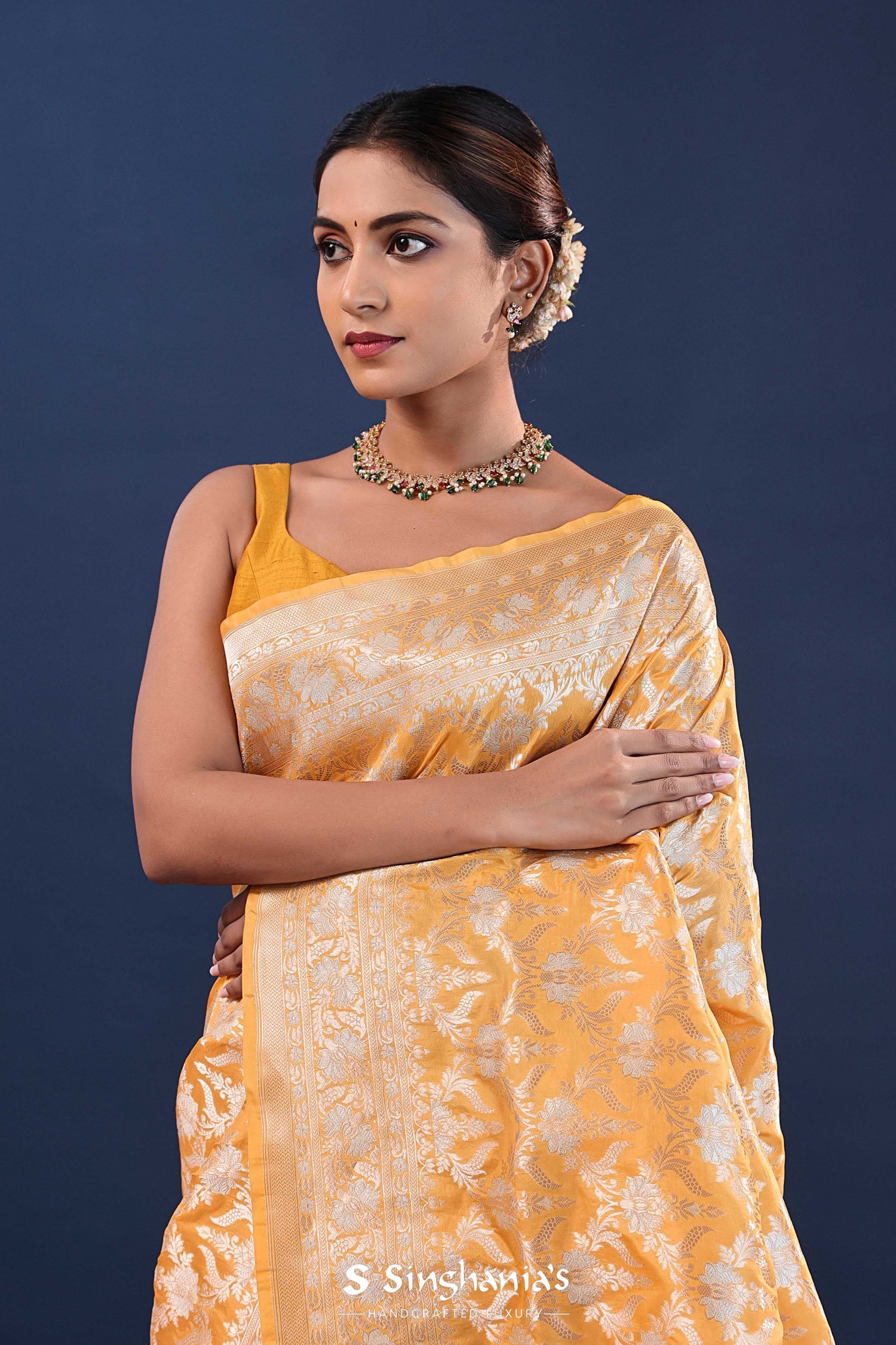 Tiger orange banarasi saree features floral jaal woven with zari spread across the body along with floral self border is a ideal choice for any occasion.Making you satisfy with each drape.