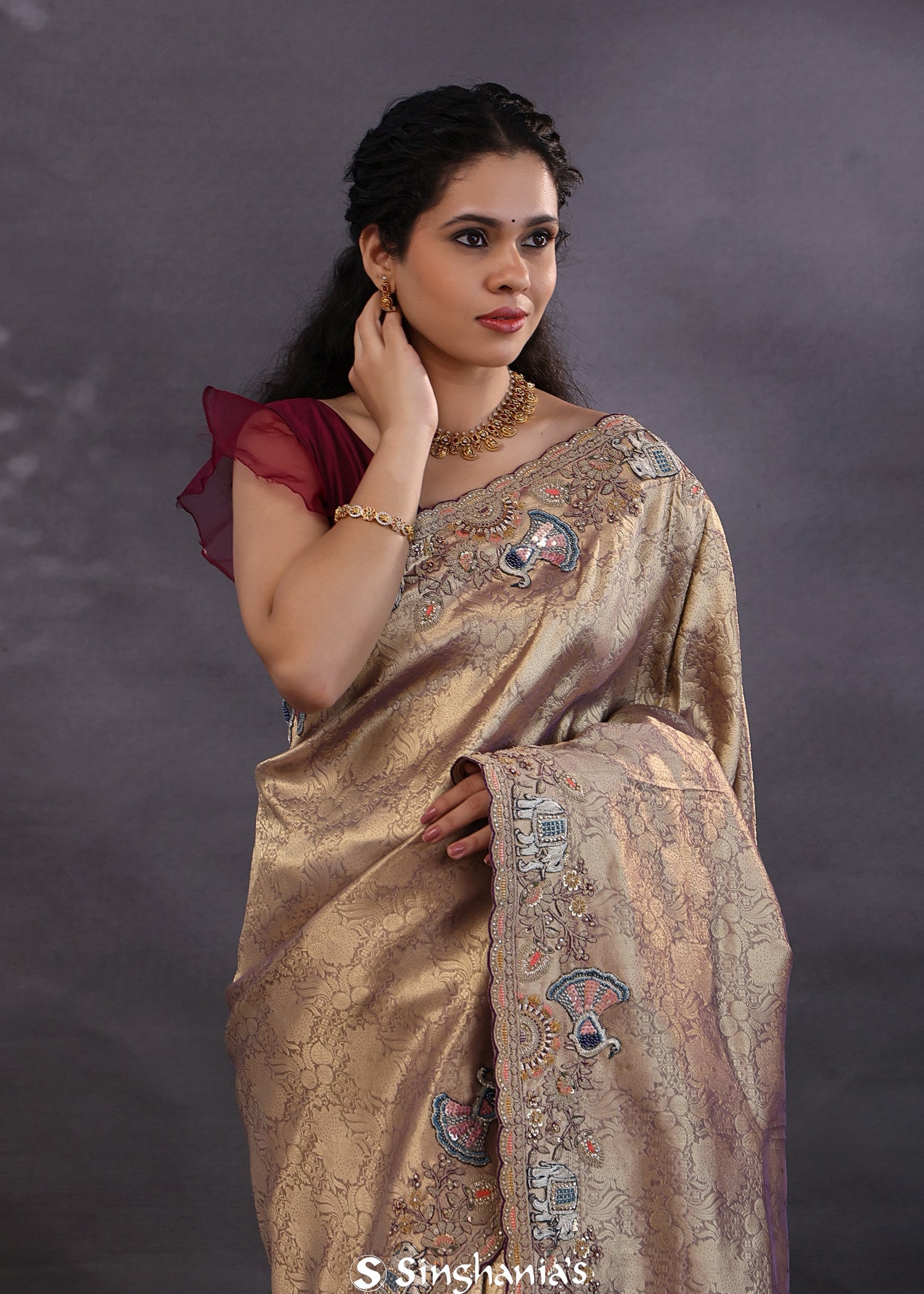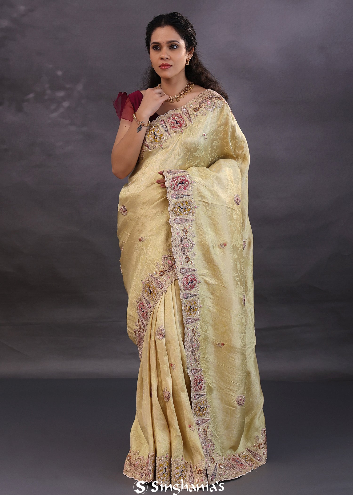 Pastel Gold Banarasi Tissue Saree With Scallop Border