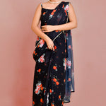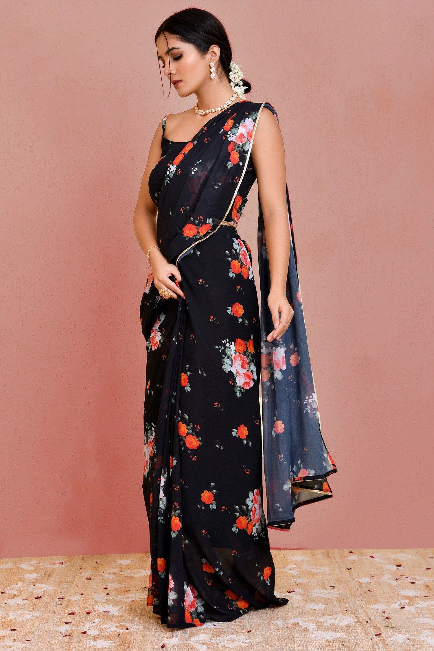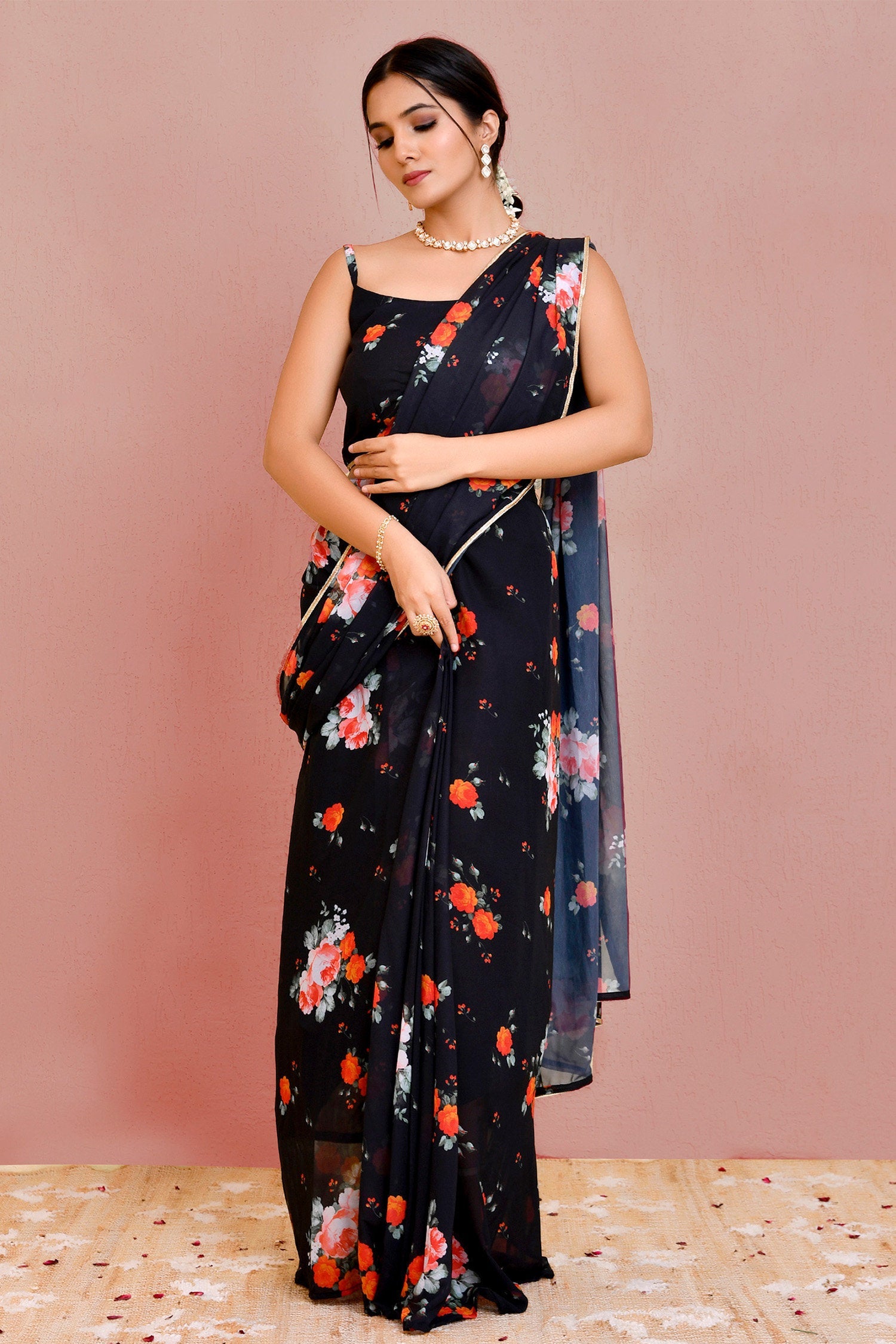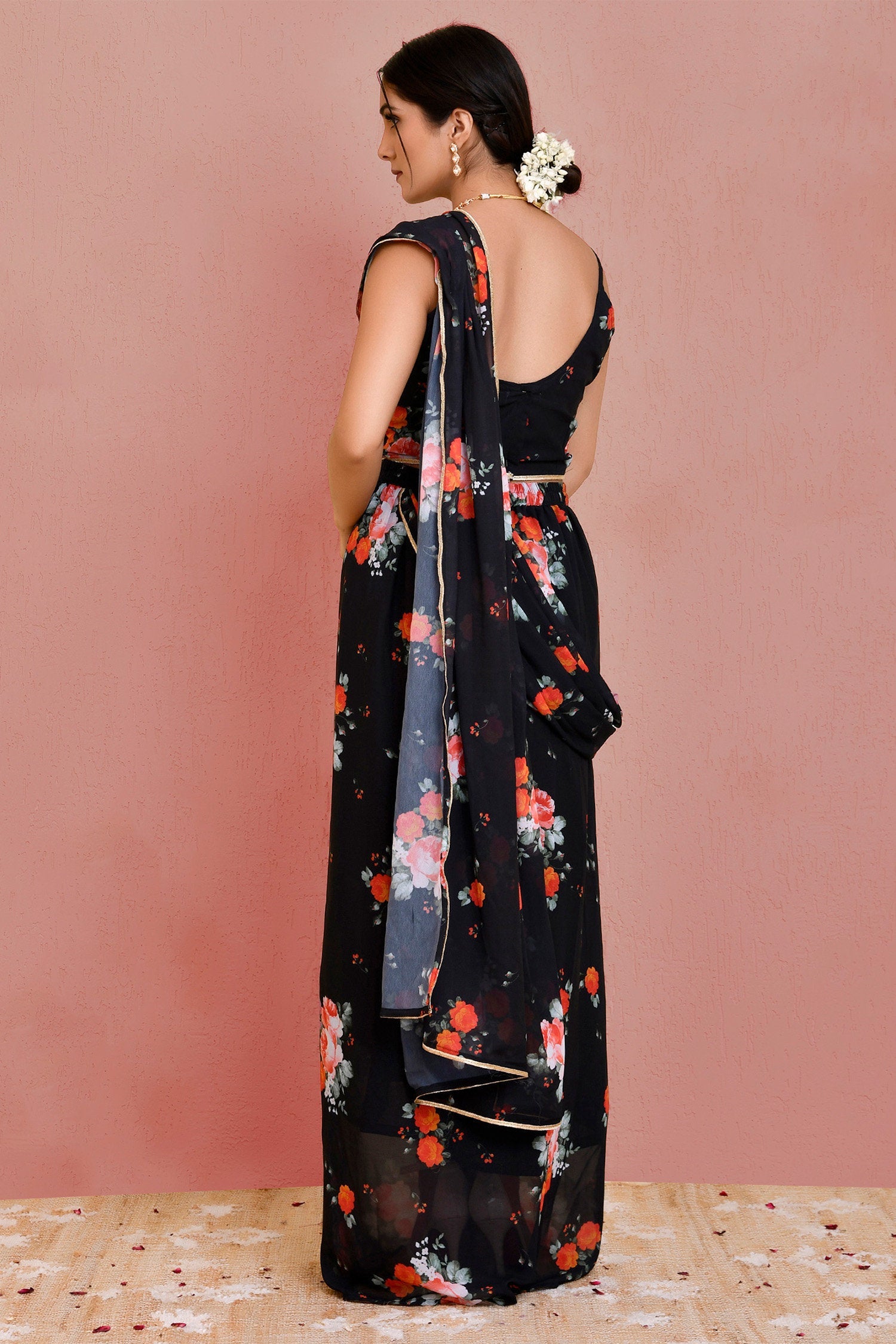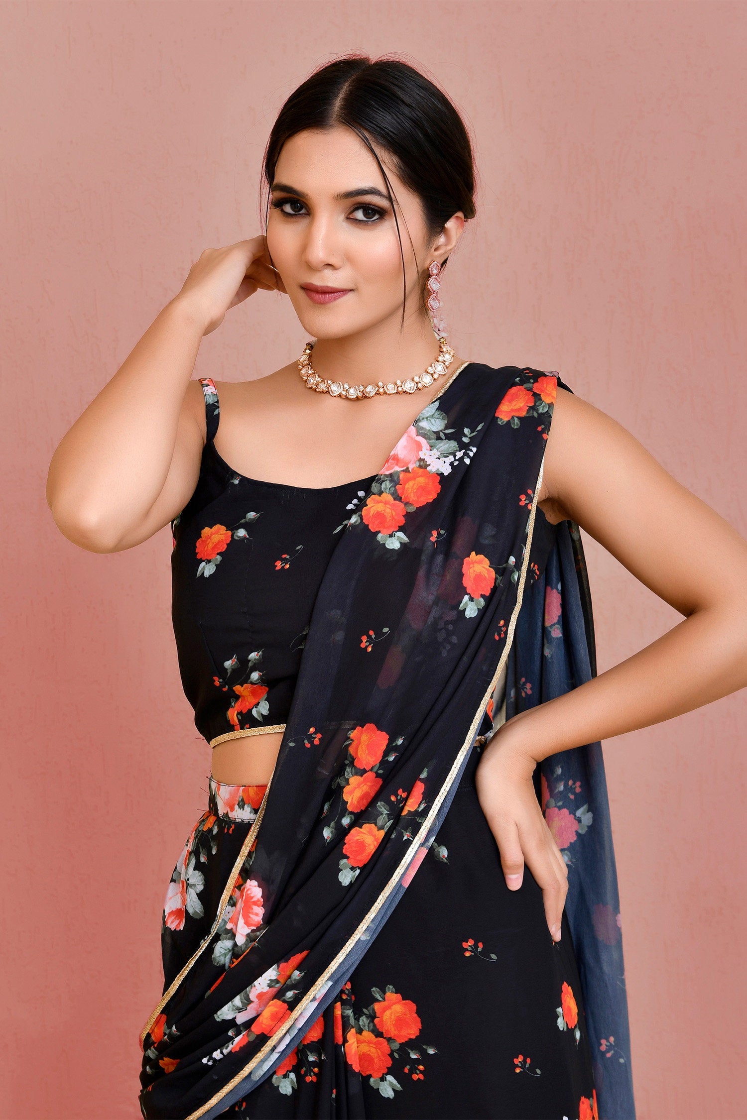 A perfect choice for the fancy events includes Black georgette ready-made saree adorned with elegant bright floral prints along with matching sleeveless blouse adds the finishing touch to the entire garment.