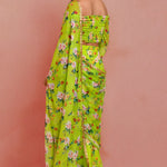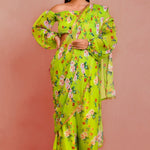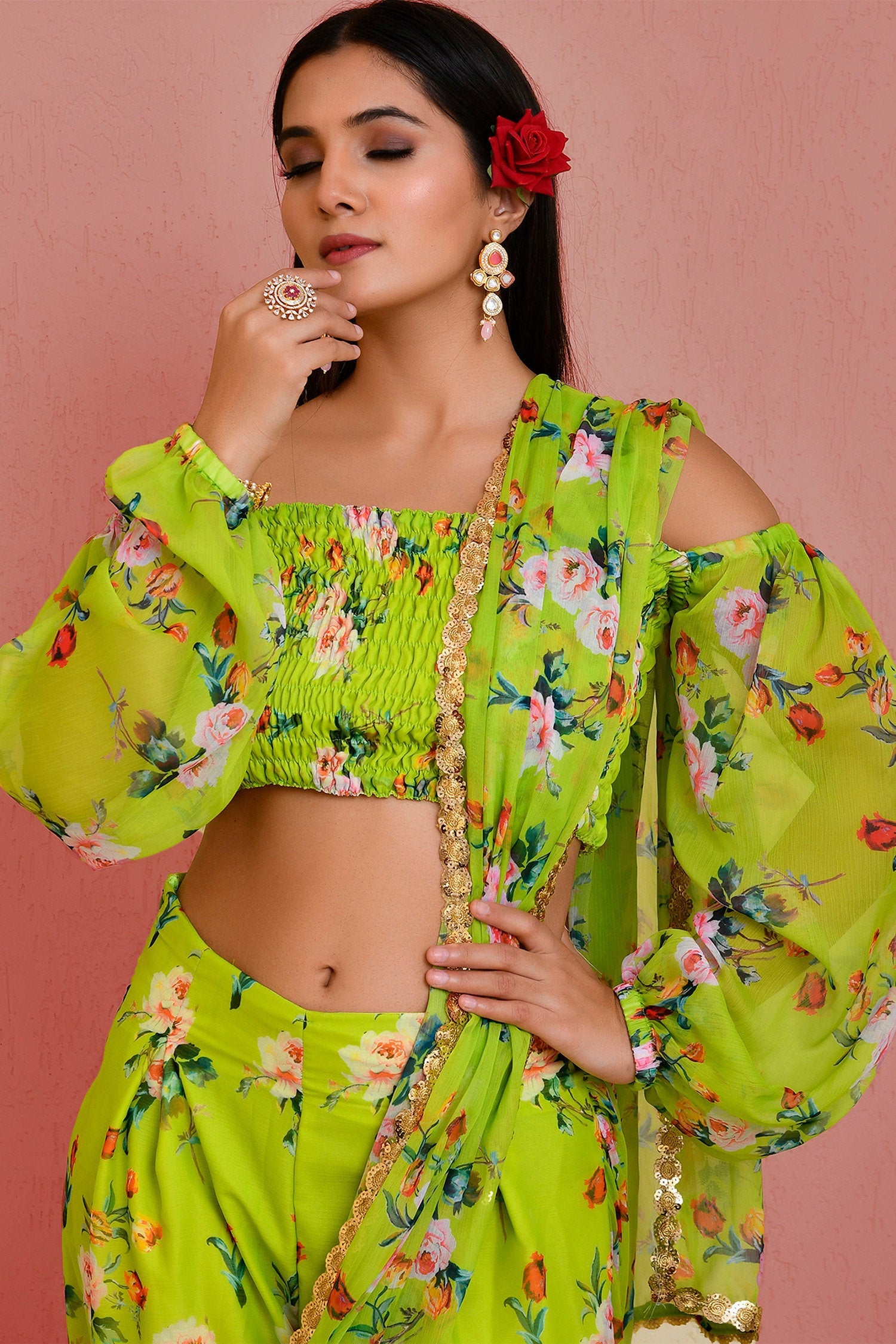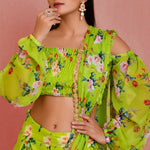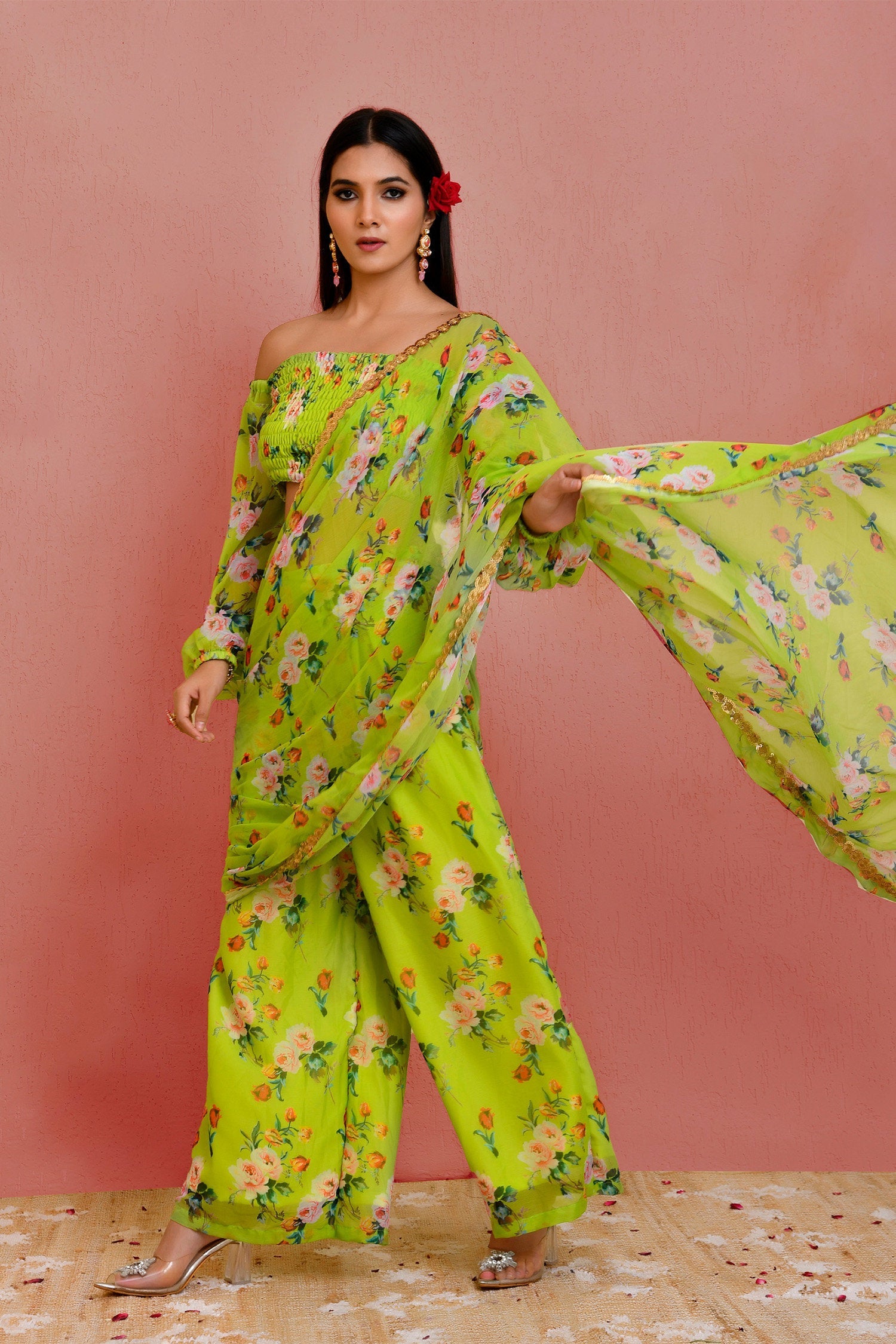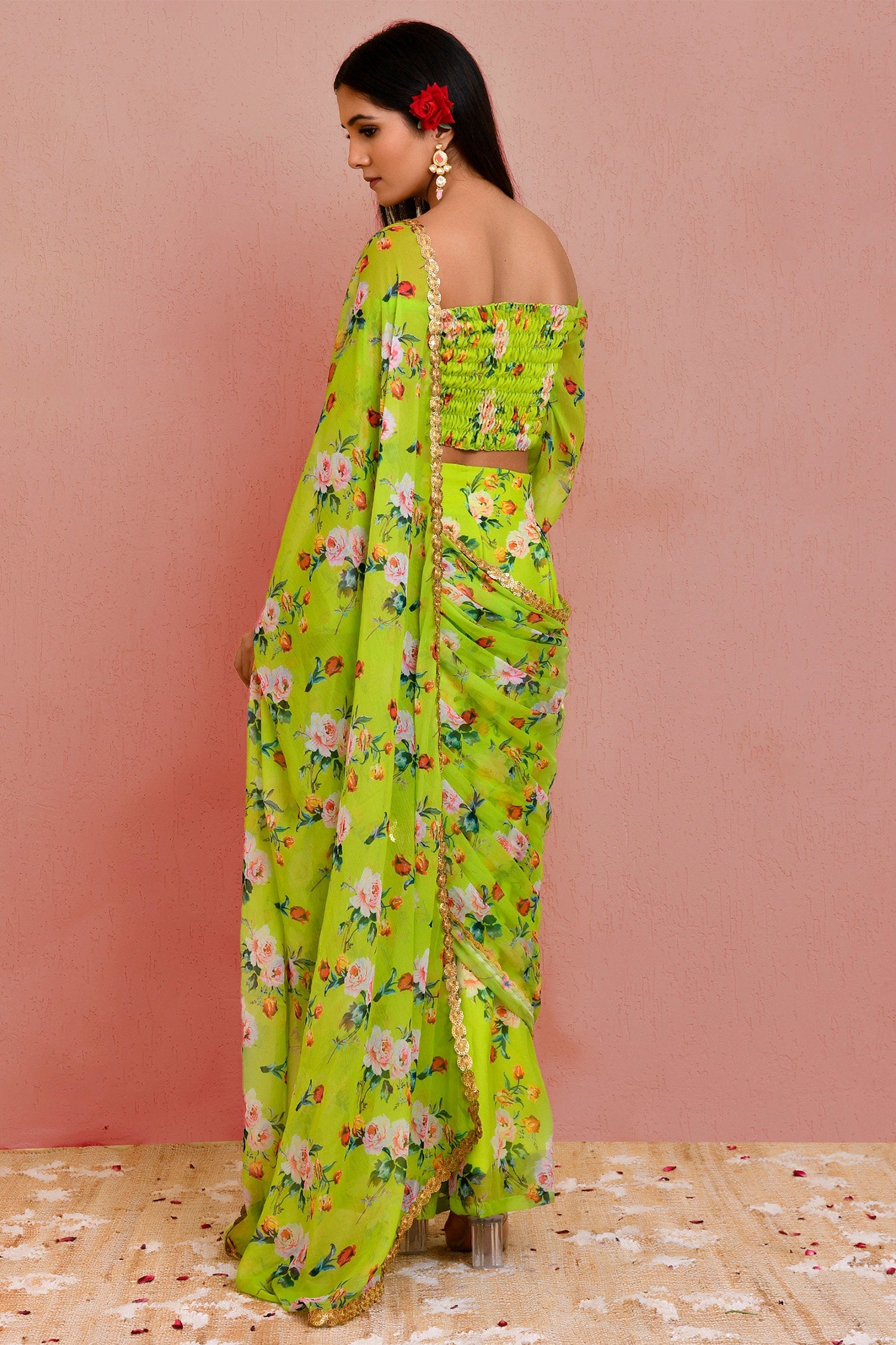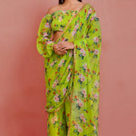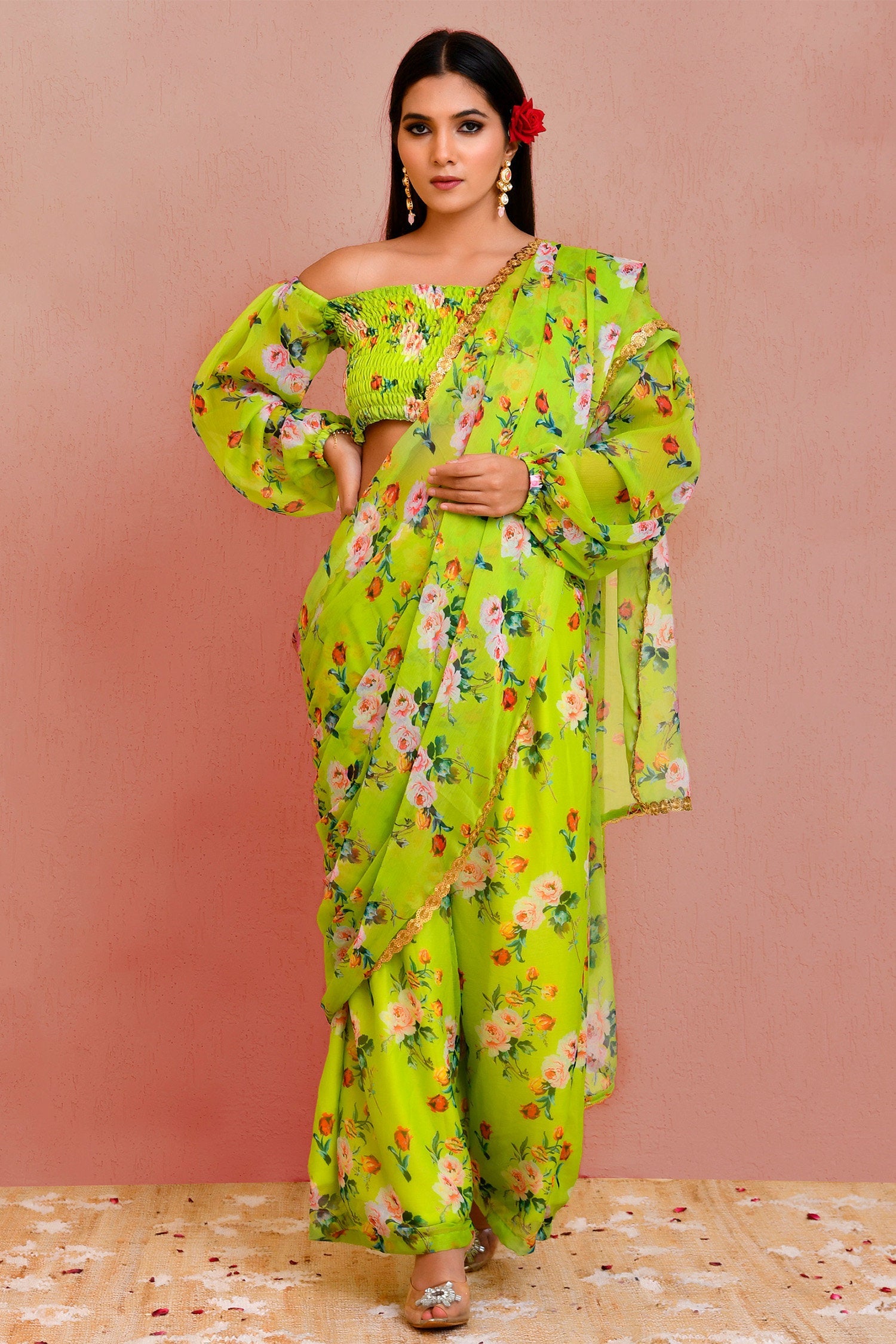 This beautiful Green georgette ready-made saree with detailed floral prints ,accompanied with off-shoulder blouse with full sleeves giving a final touch.