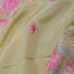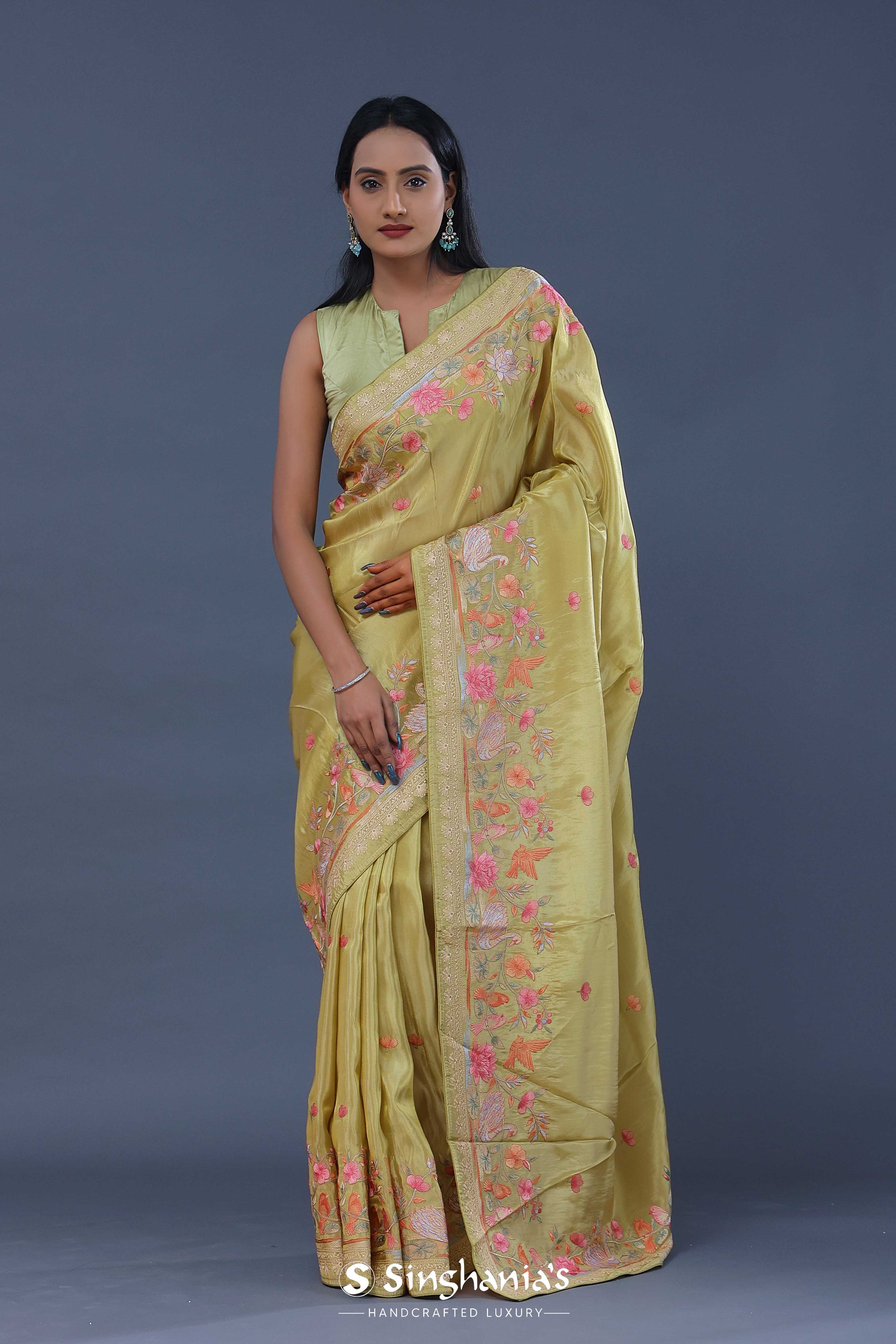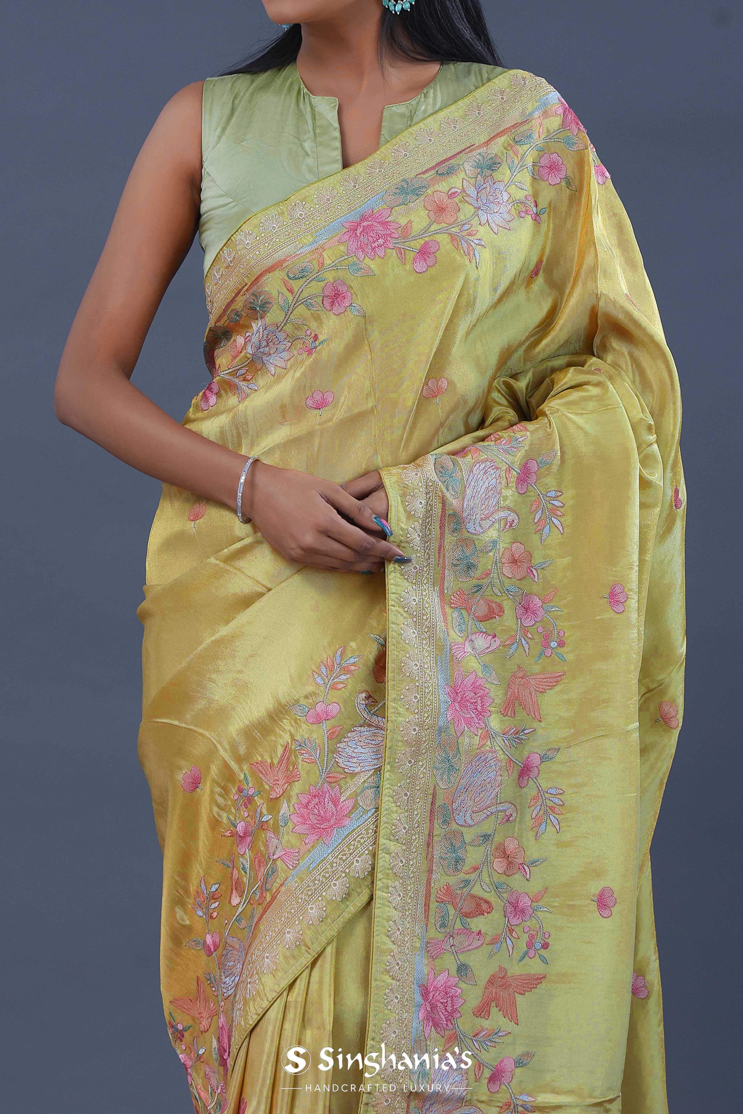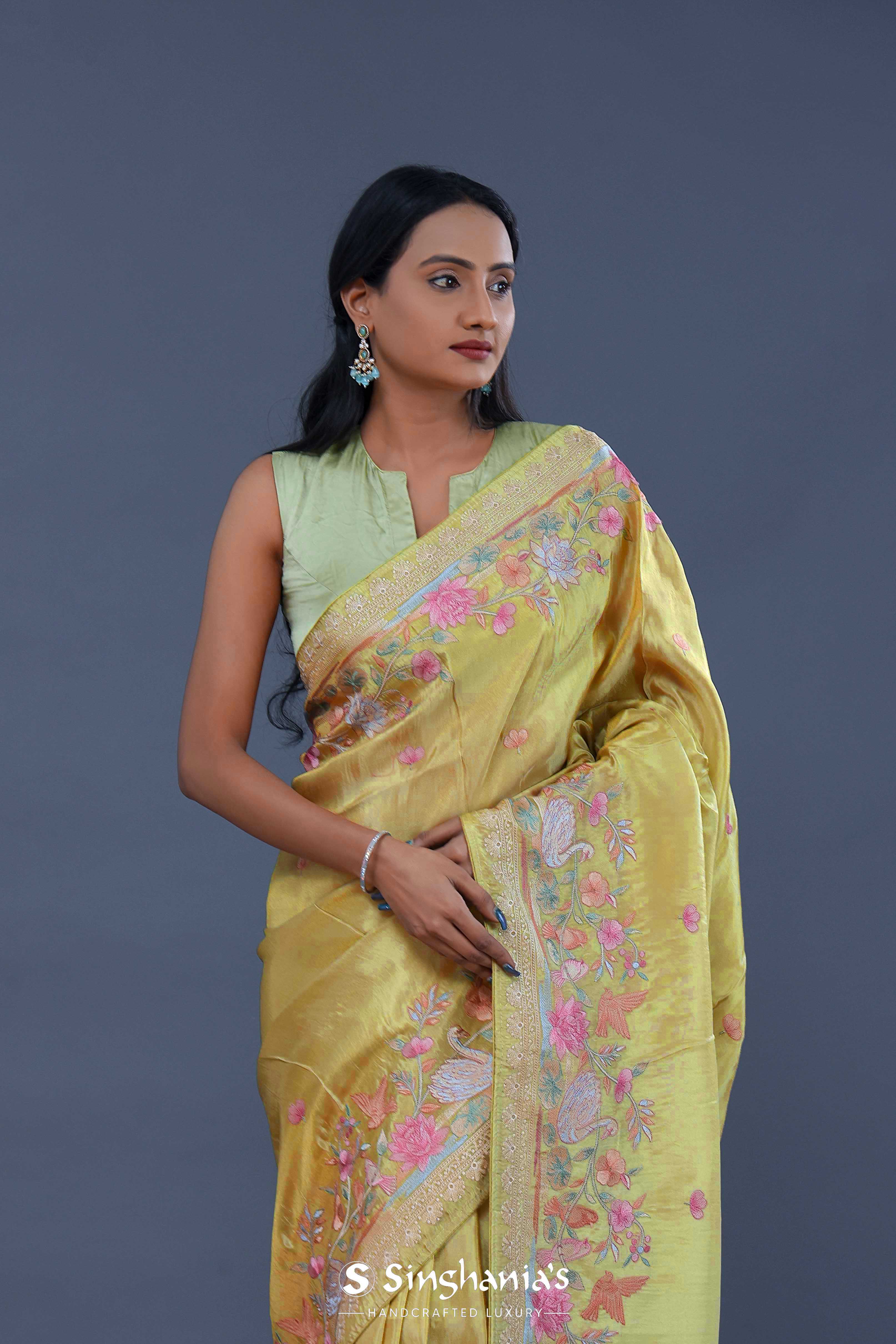 Versatile and flowy drape of this hazel wood yellow georgette tissue saree adorned with embroidery of beautiful lotus ,duck and other flowers on border and small flowers as butti's spread all across the body of the saree making it ideal choice for any fancy parties