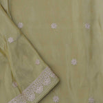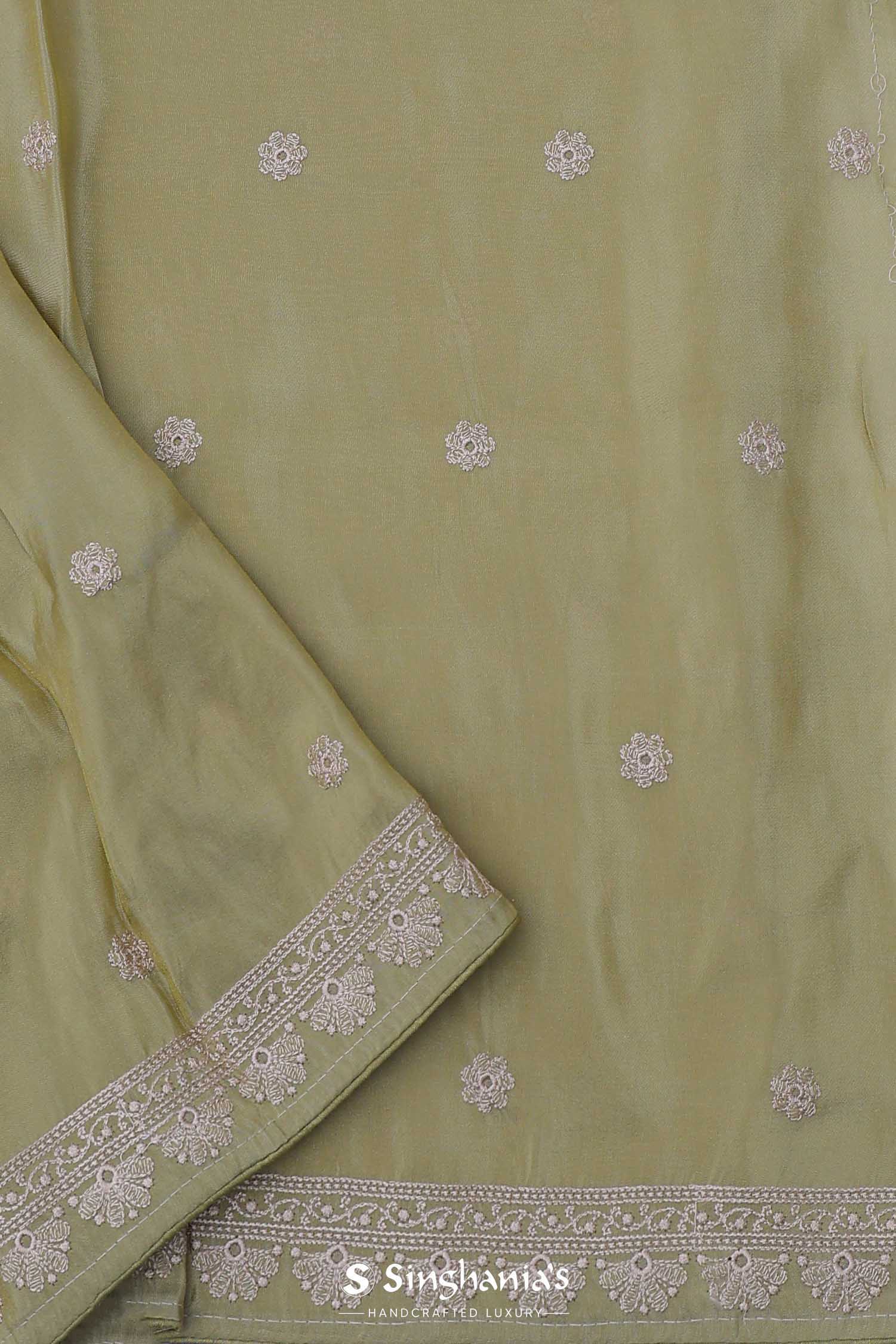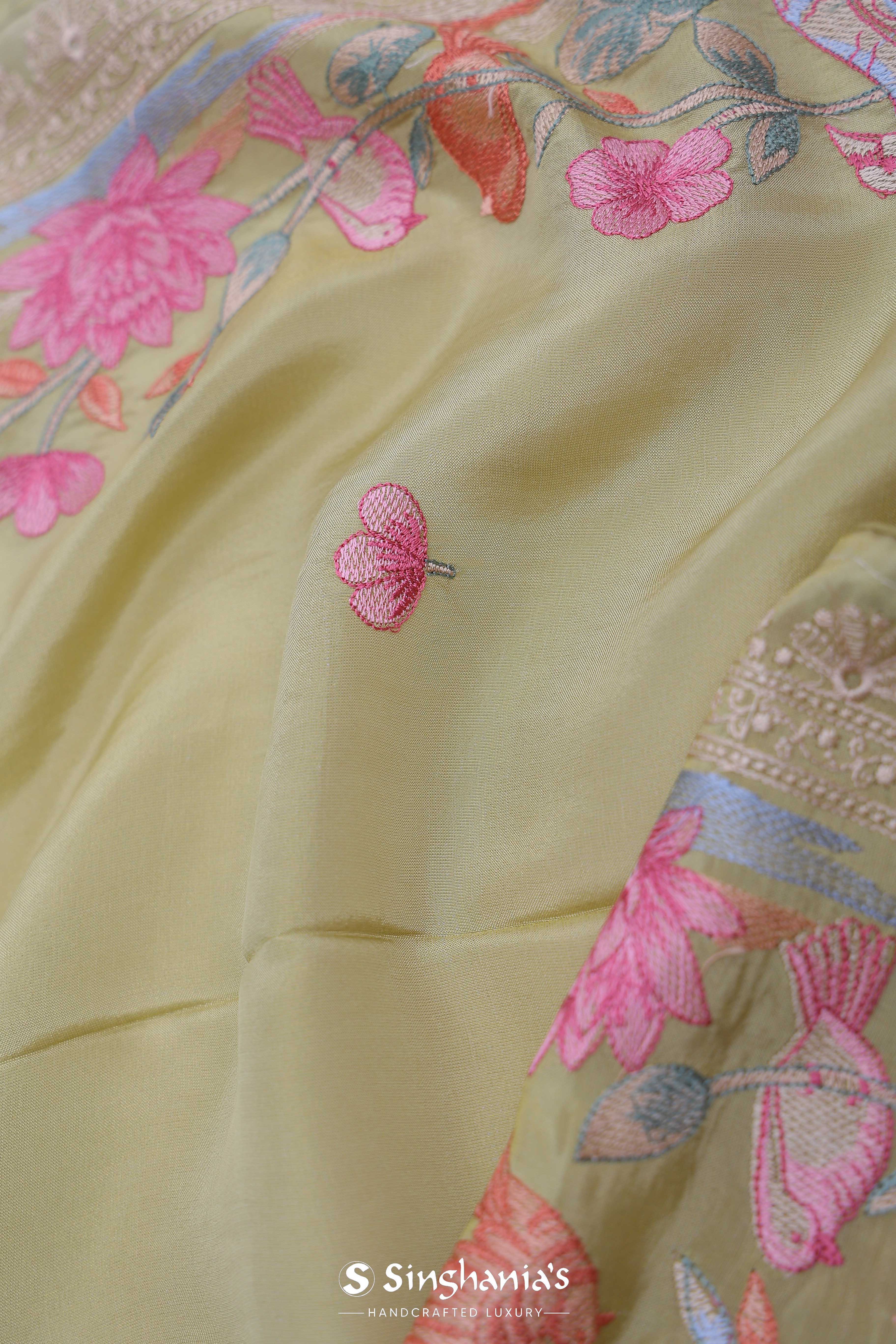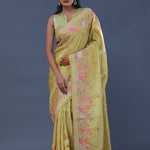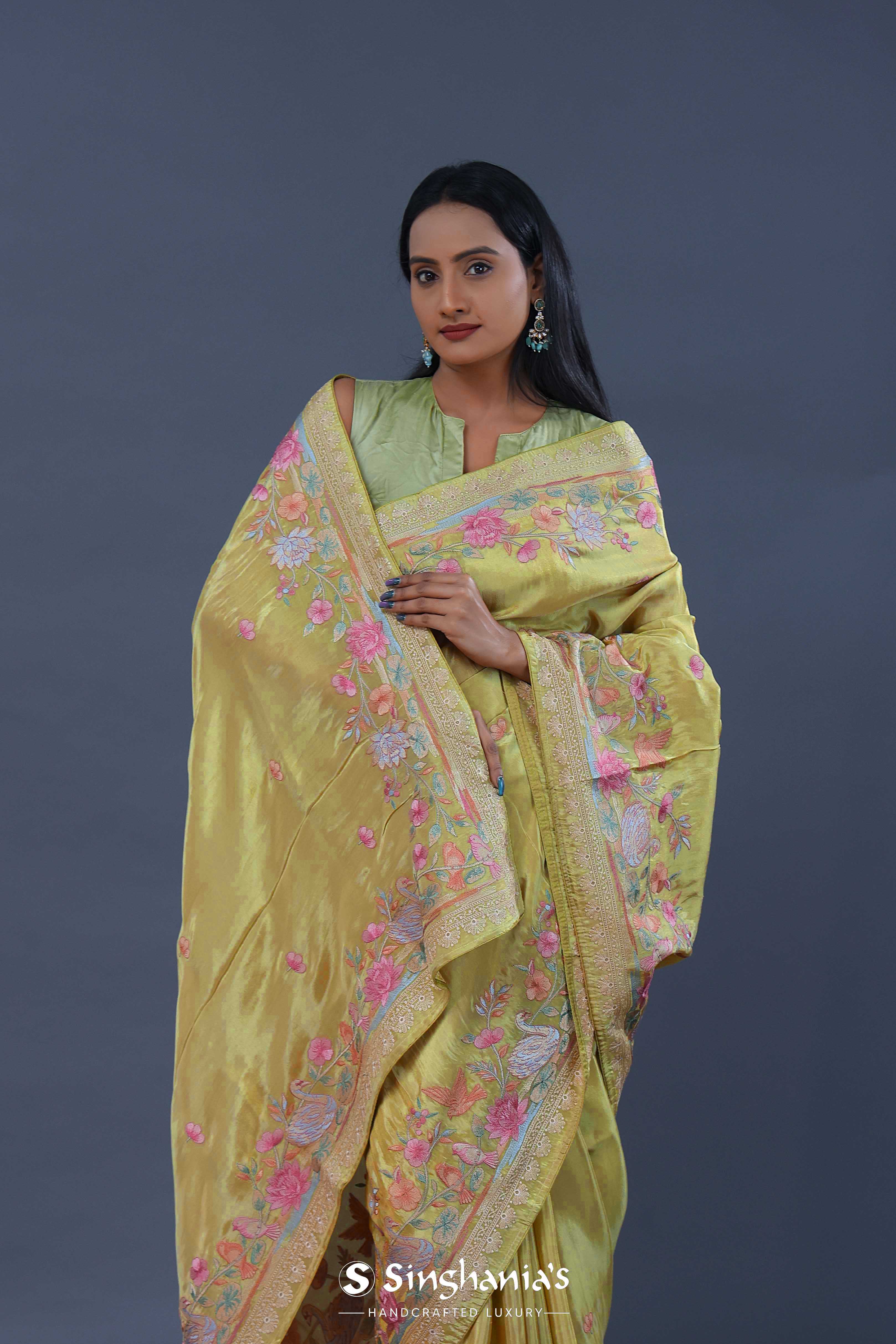 Versatile and flowy drape of this hazel wood yellow georgette tissue saree adorned with embroidery of beautiful lotus ,duck and other flowers on border and small flowers as butti's spread all across the body of the saree making it ideal choice for any fancy parties