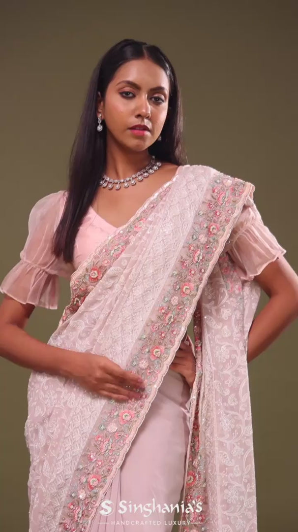 Delicate floral and leaf jaal embroidery in white thread creates an beautiful design throughout the body of this soft pink georgette saree. A hint of texture and richness is added by the bead and floral embroidery that garnishs the scalloped border.