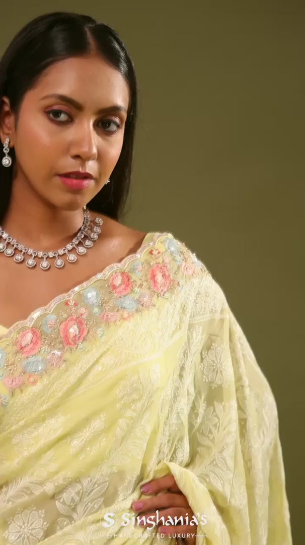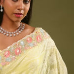 Delicate floral and leaf jaal embroidery in white thread creates an amazing design throughout the body of this soft yellow georgette saree. A hint of texture and richness is added by the bead and floral embroidery that adorns the scalloped border.