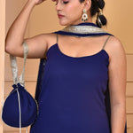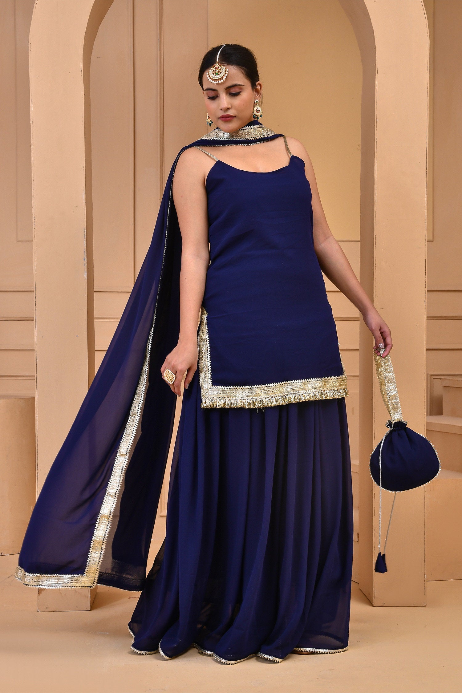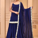 Berry blue georgette sharara set is adorned with lace on sleeveless top , dupatta and sharara bottom reflects elegance which is making it perfect choice for fancy parties