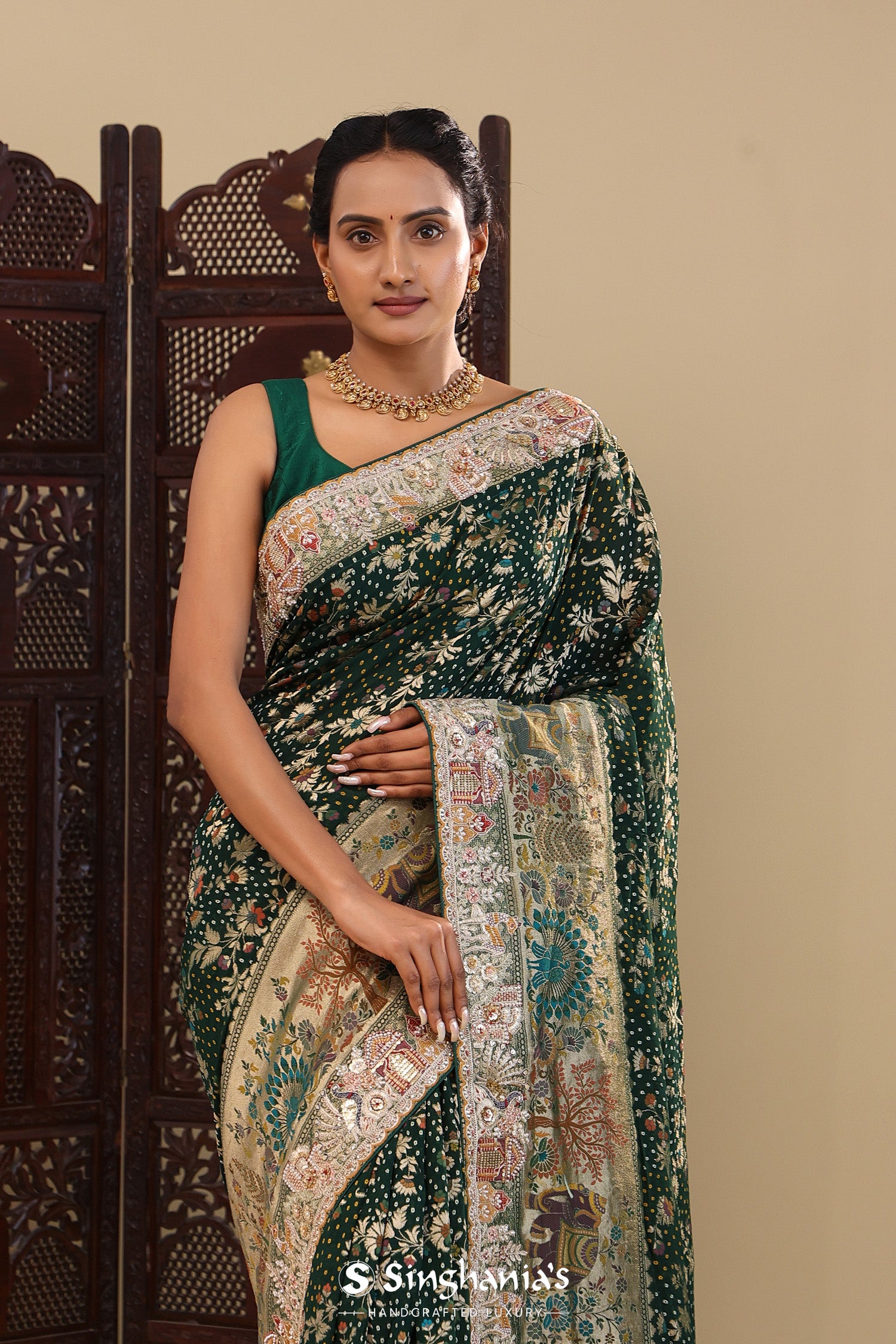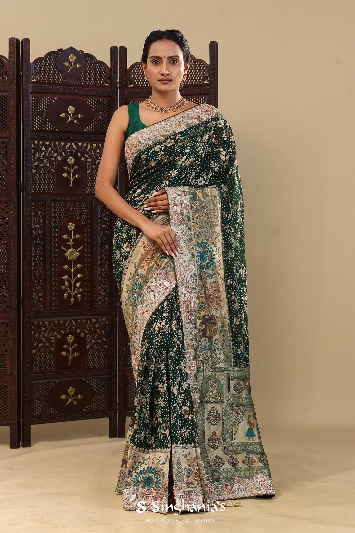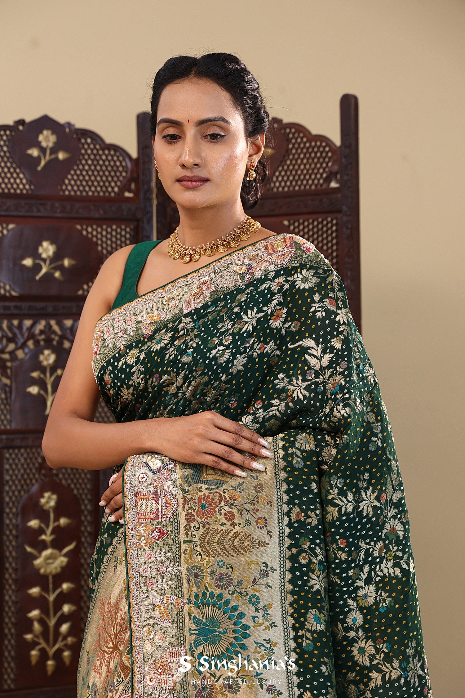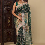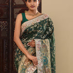 This floral pattern woven with gold zari spread all across the body of saree complemented with fancy designer border adorned with zari embroidery