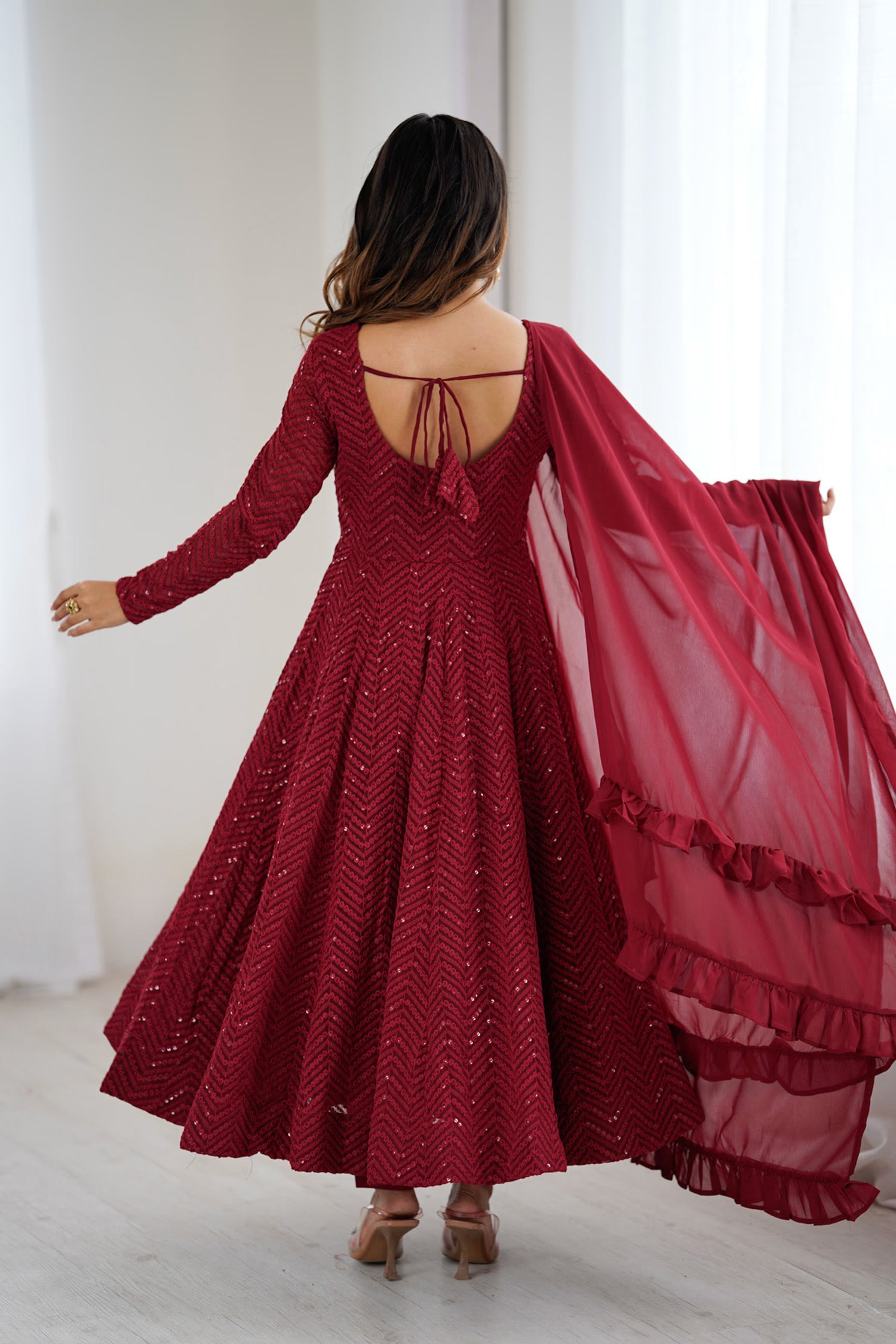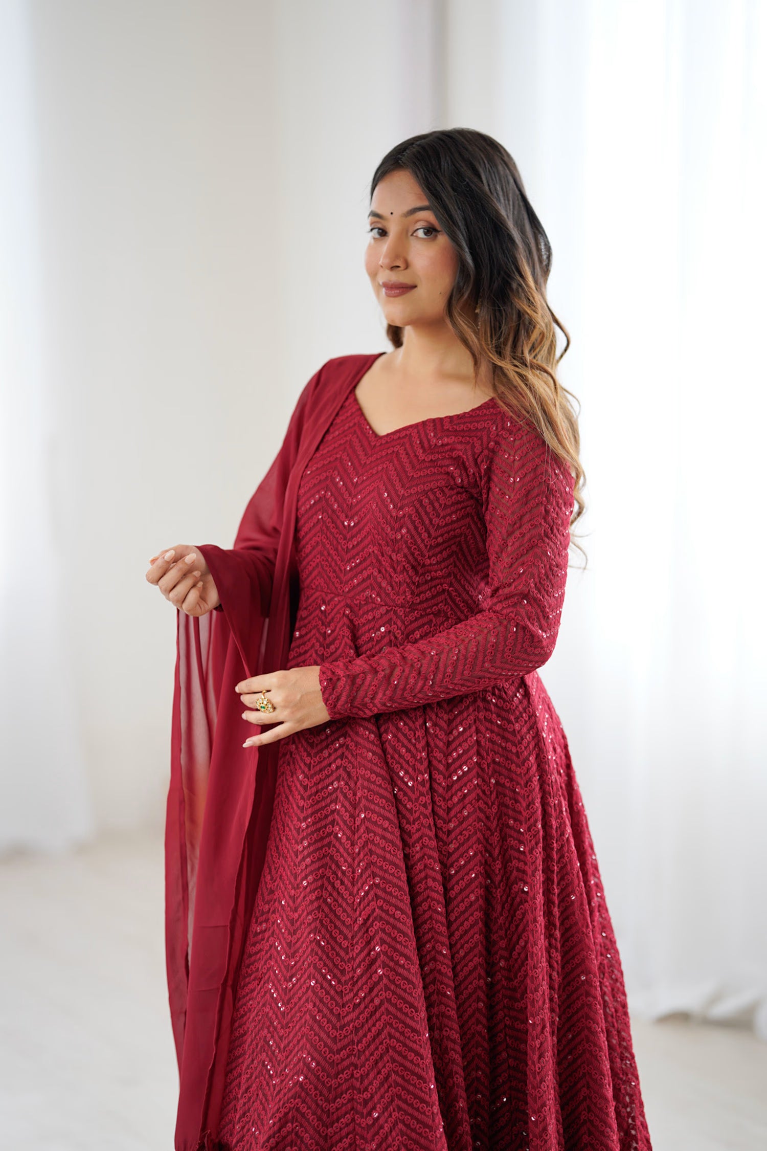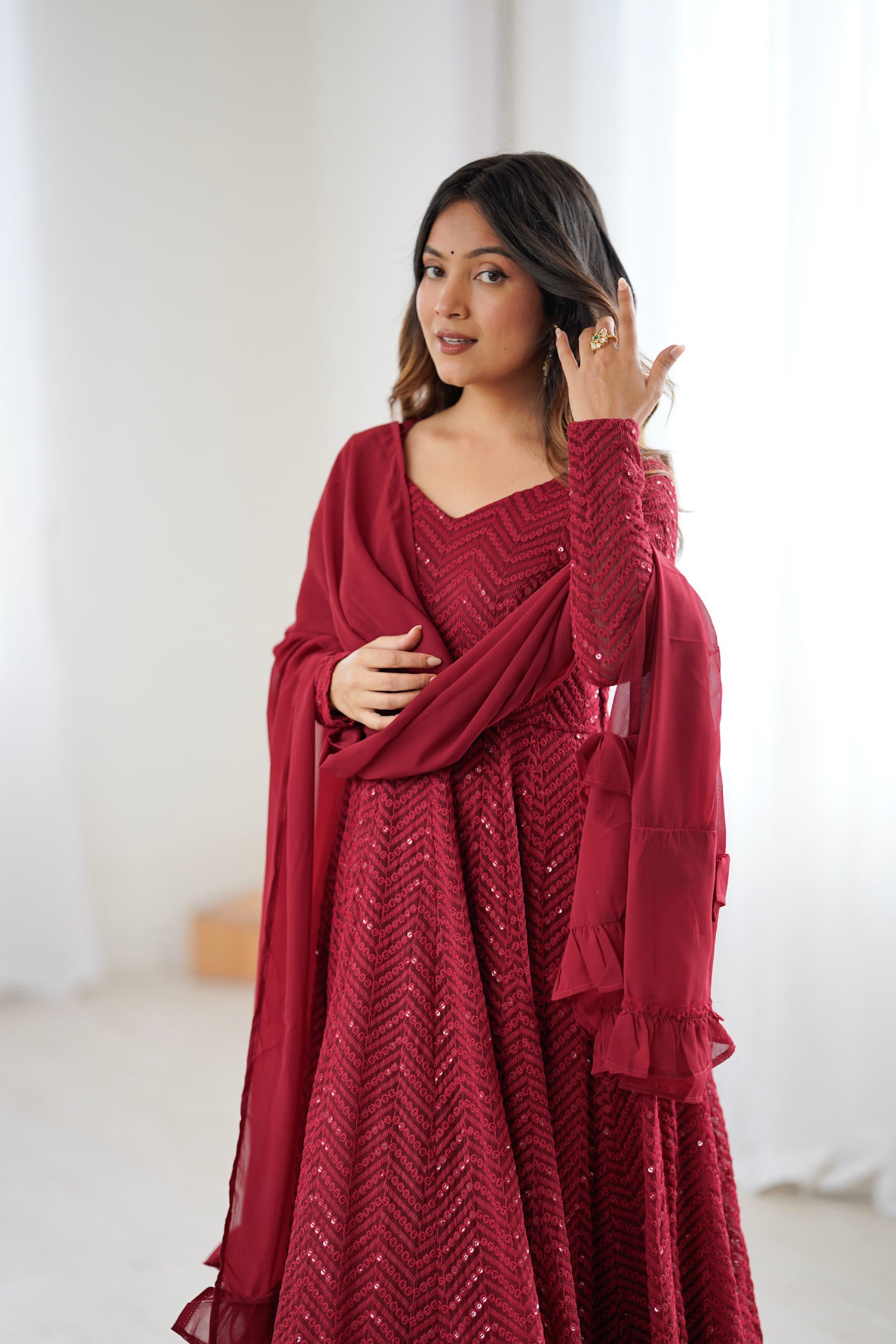 The v neckline and full sleeve length of bright maroon anarkali set with threadwork and sequin work making it unique and perfect for every festive occasions