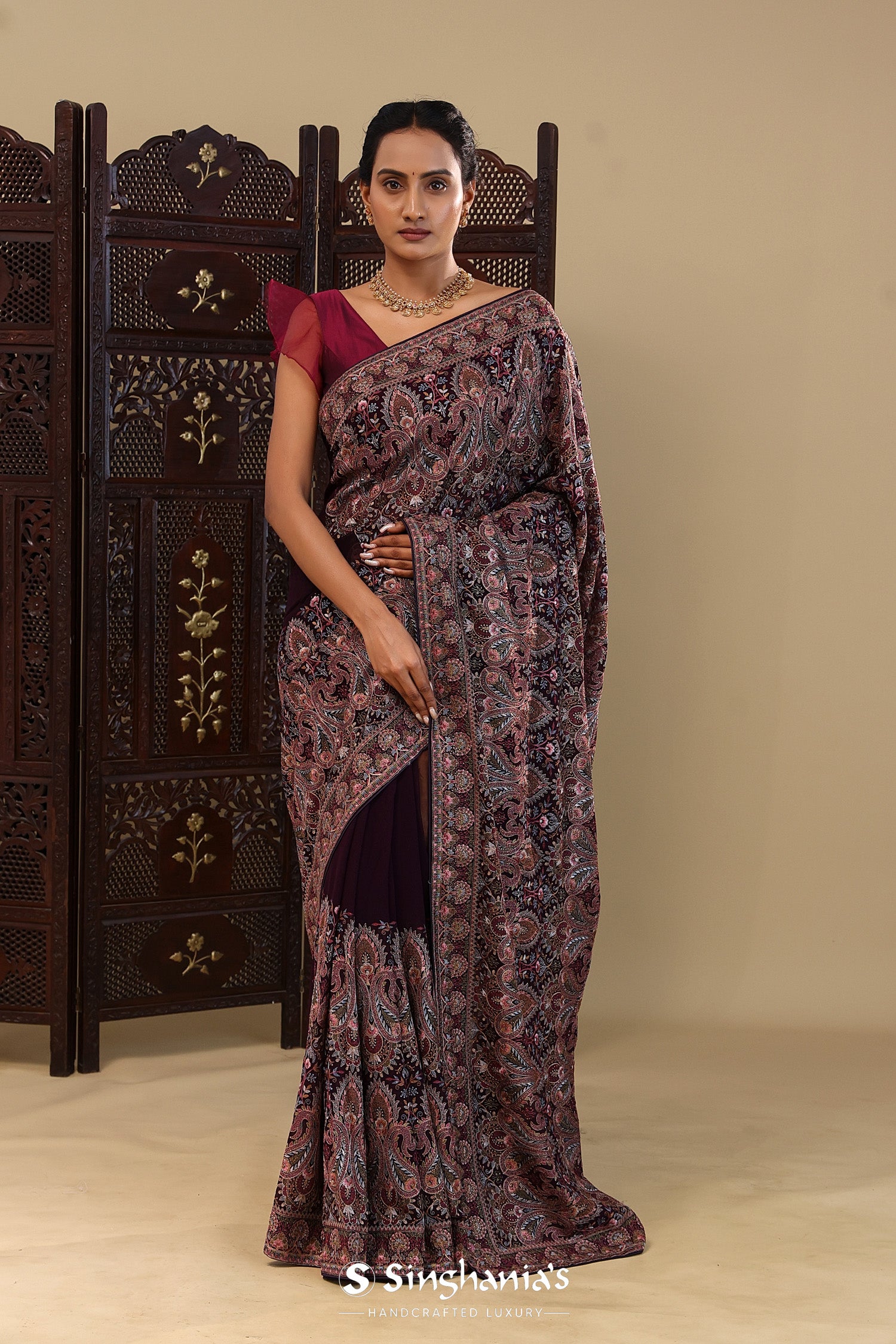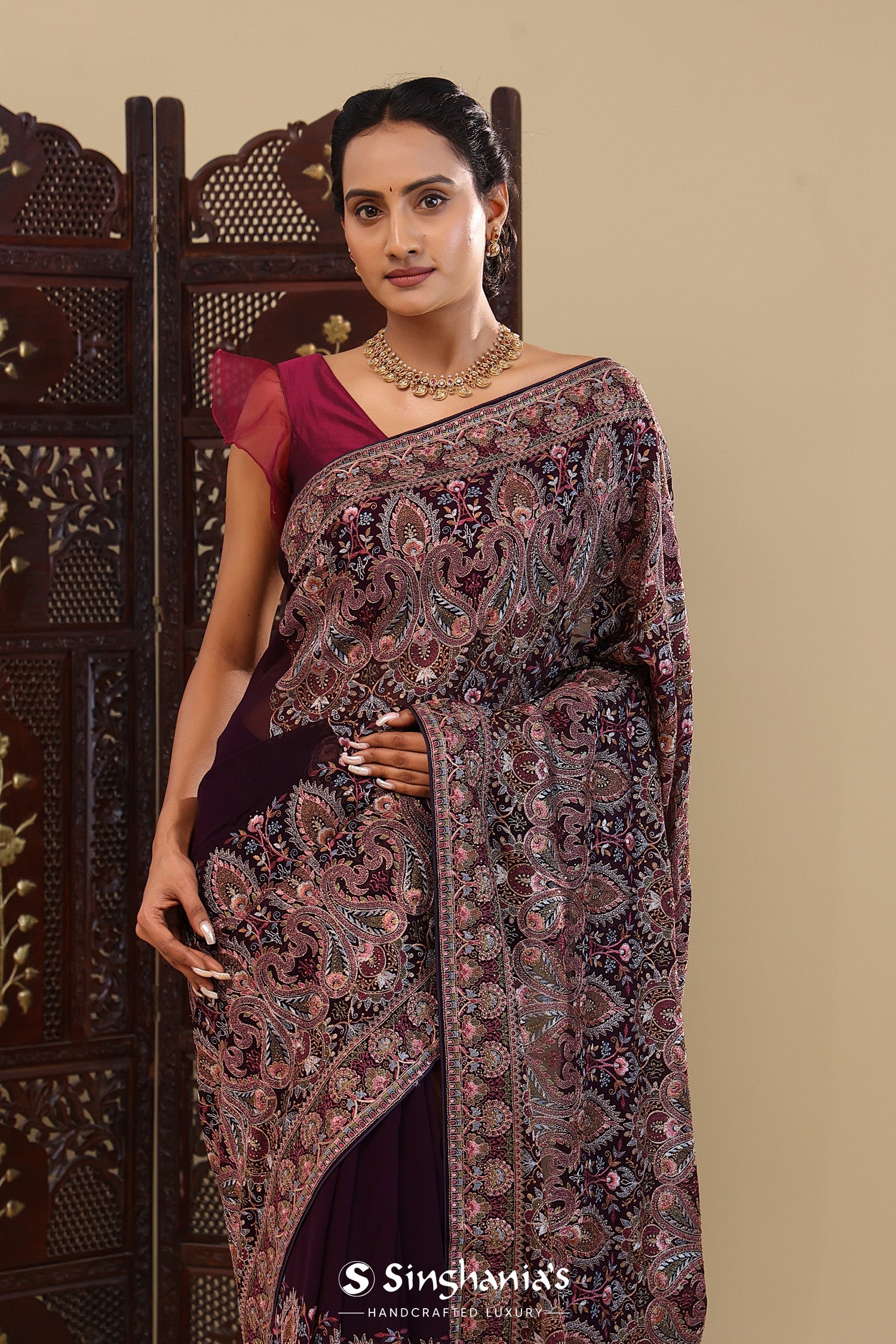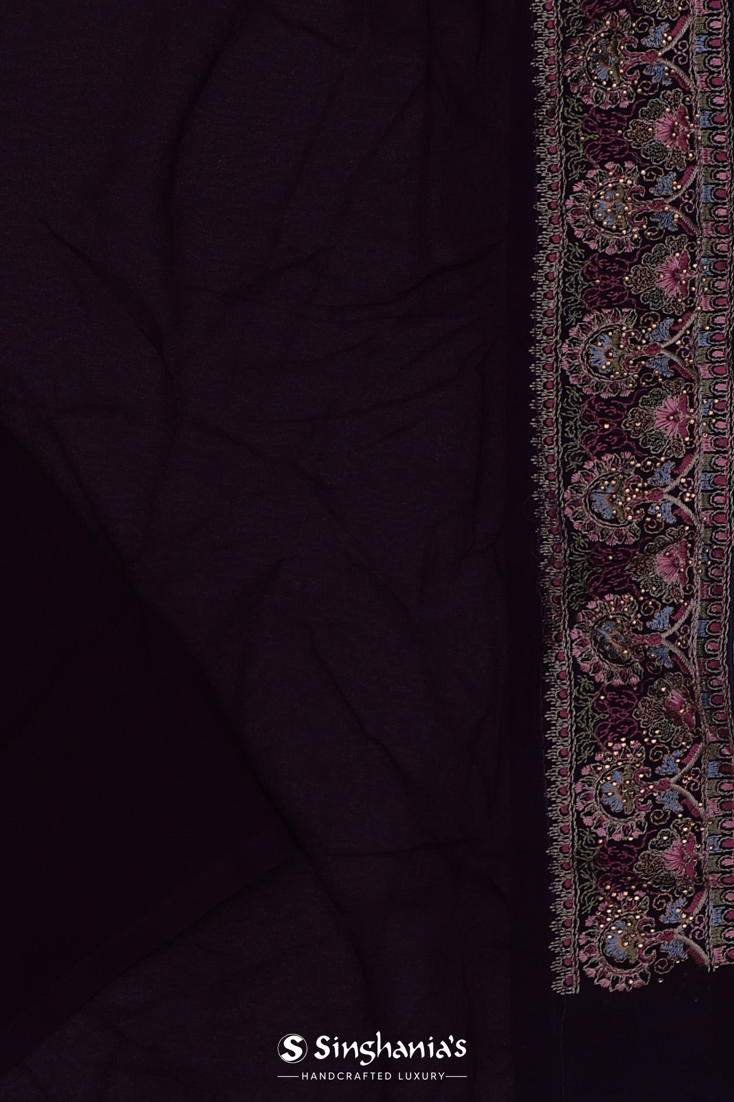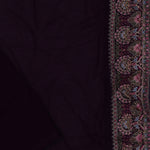 This intricate thread work forming paisley and floral designs spread all across the body of Dark purple georgette saree with self border