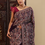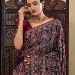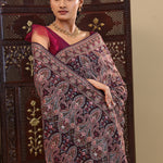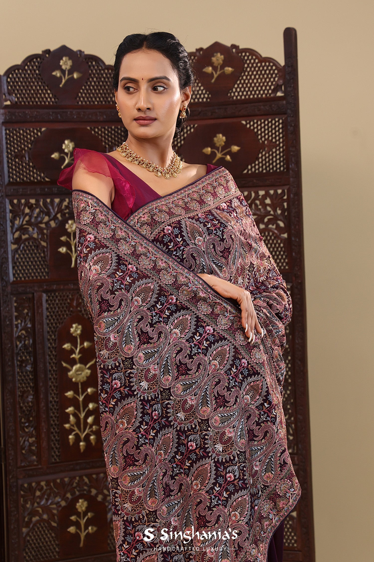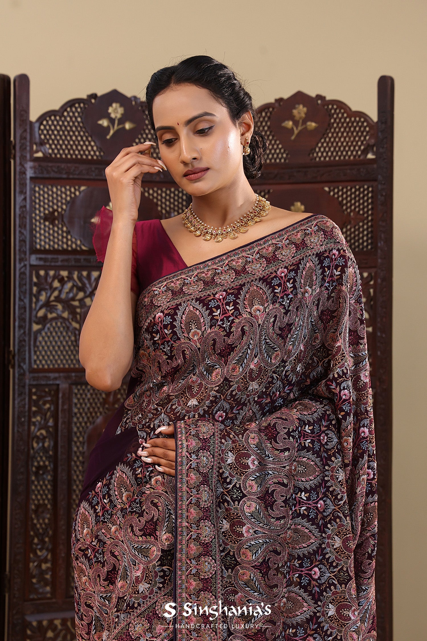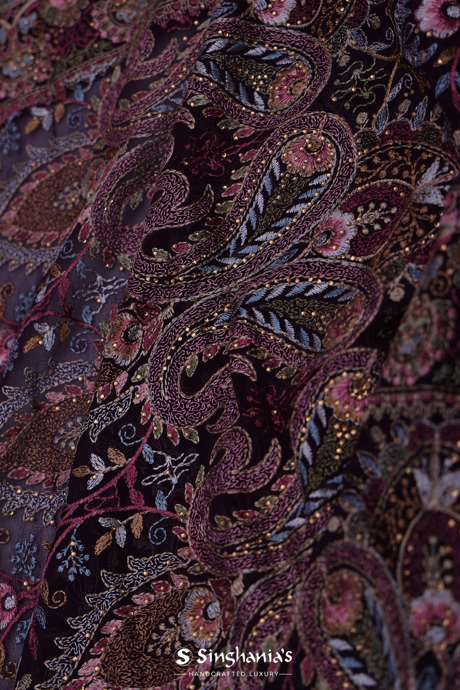 This intricate thread work forming paisley and floral designs spread all across the body of Dark purple georgette saree with self border