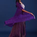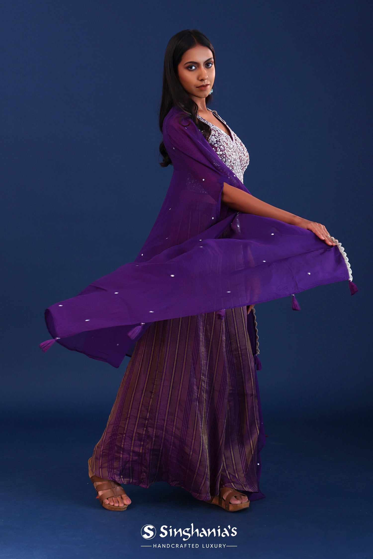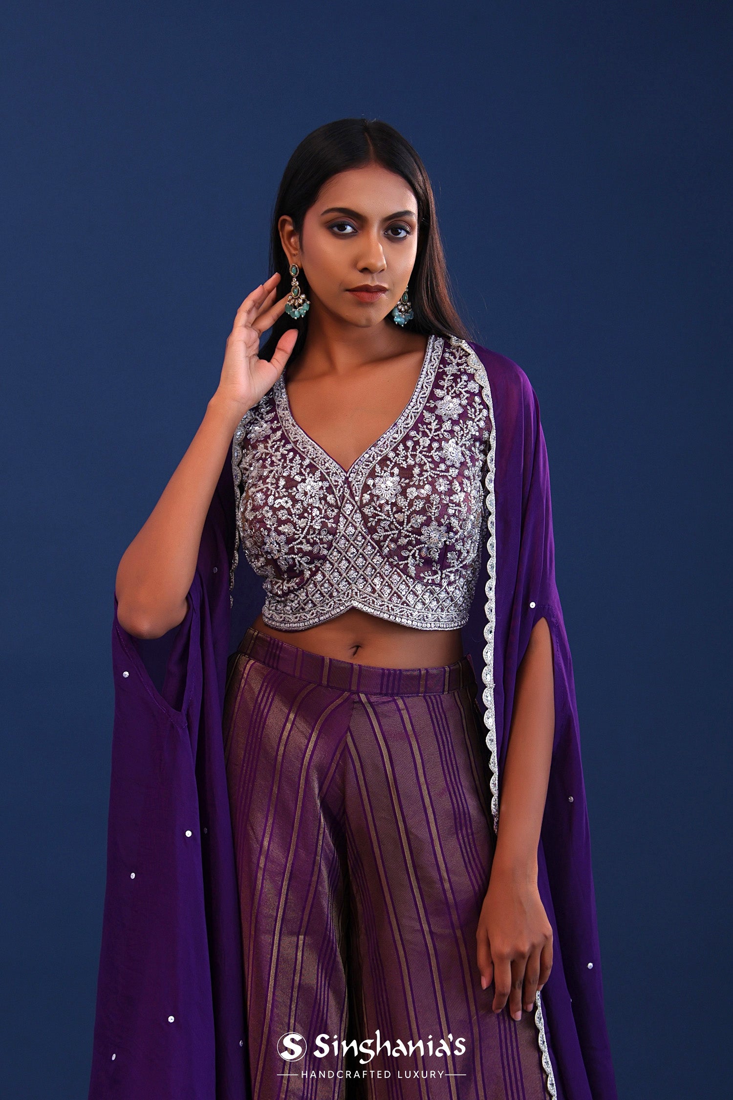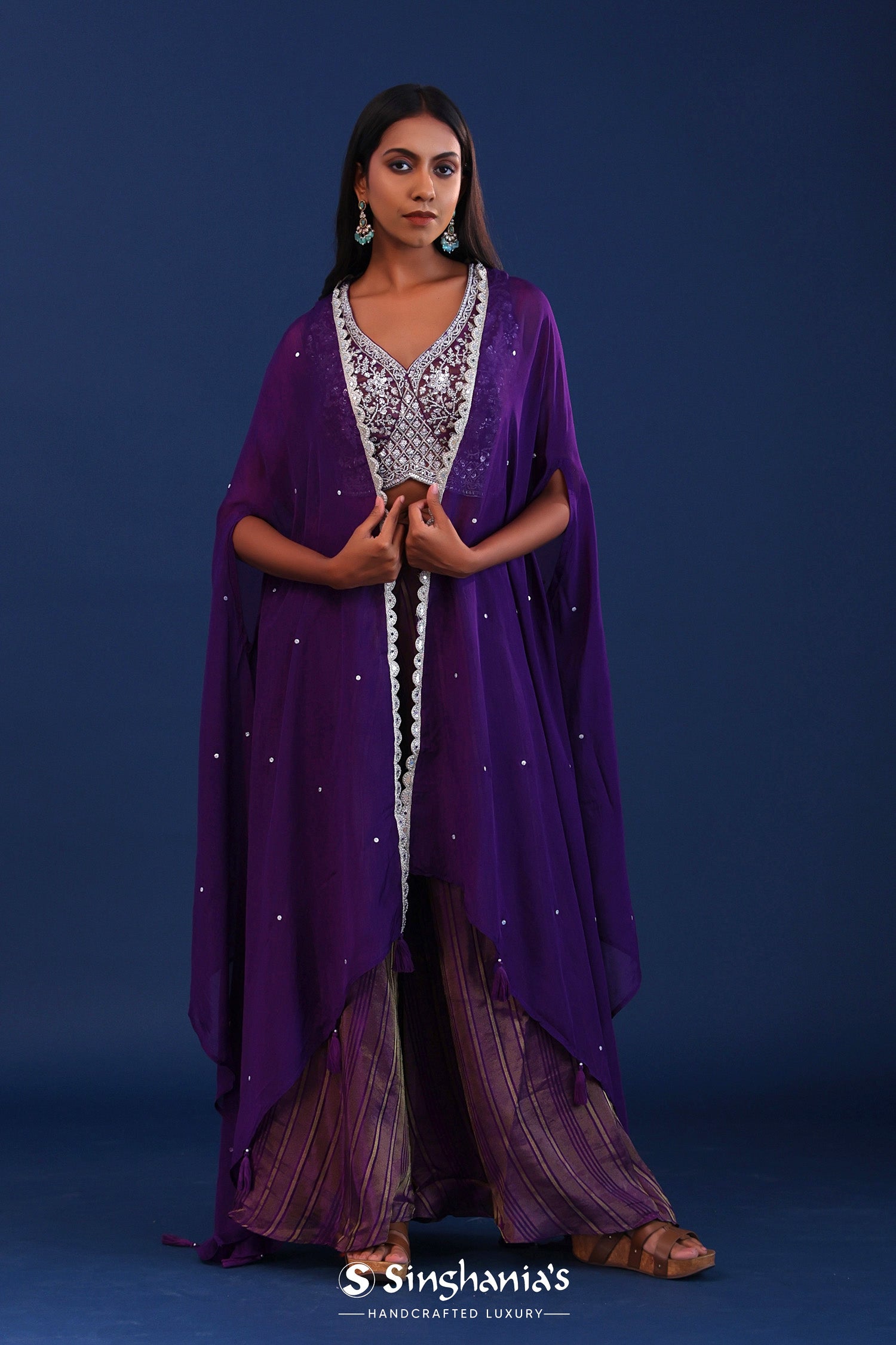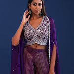 The deep purple georgette indo western choli set with crepe silk cape jacket and sequin work for a perfect blend of style and tradition.