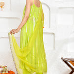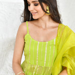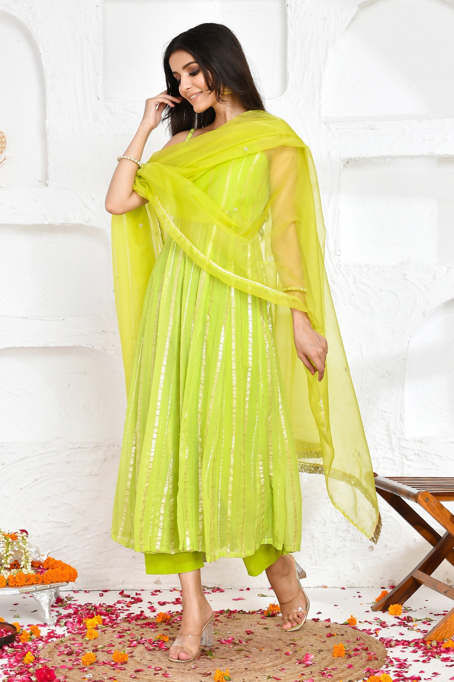 Electric lime green georgette lurex suit set with magnificent aari embroidery and lace work paired with matching pants .An organza plain dupatta adds the finishing touch for a modern look.