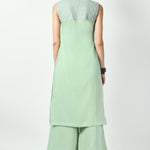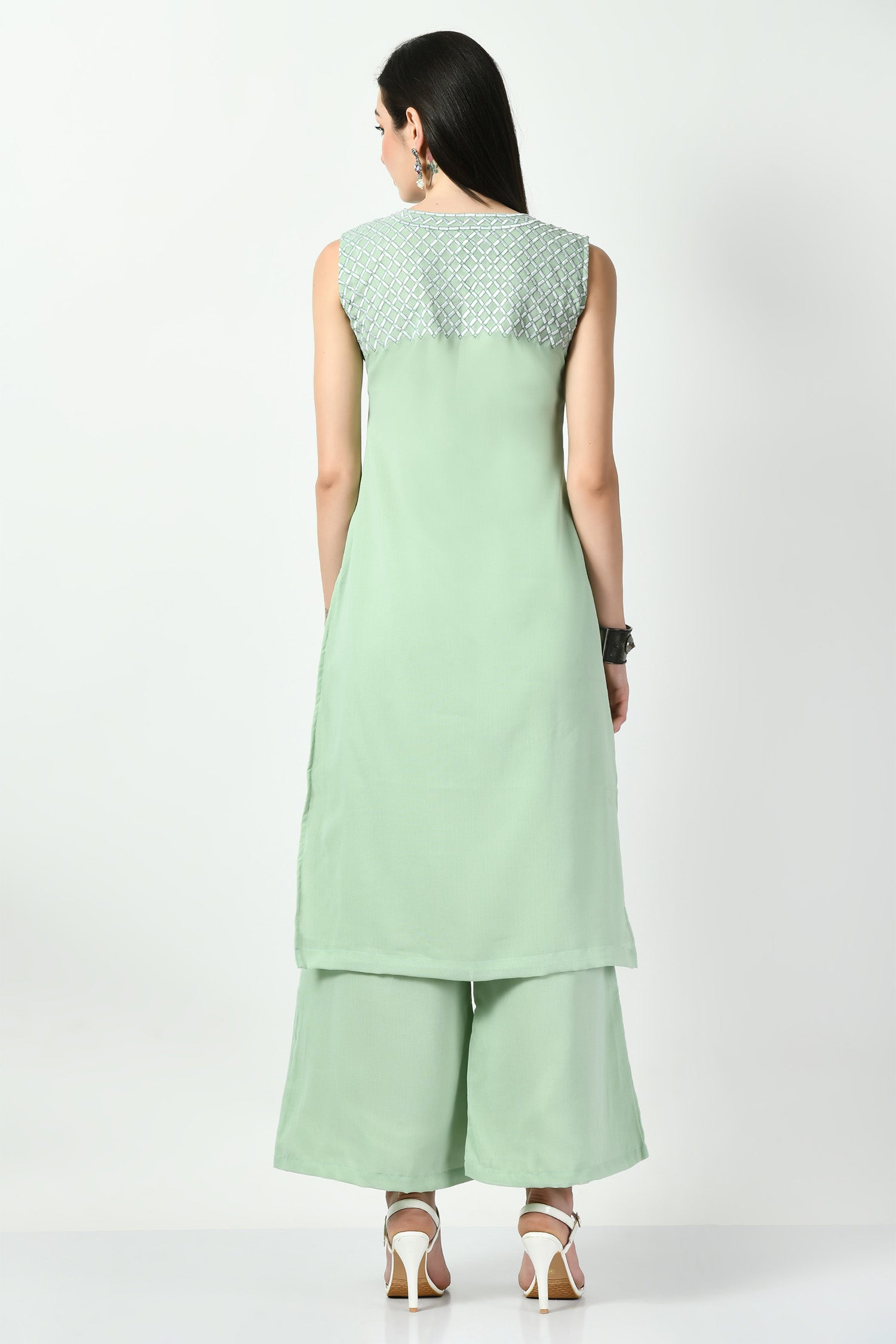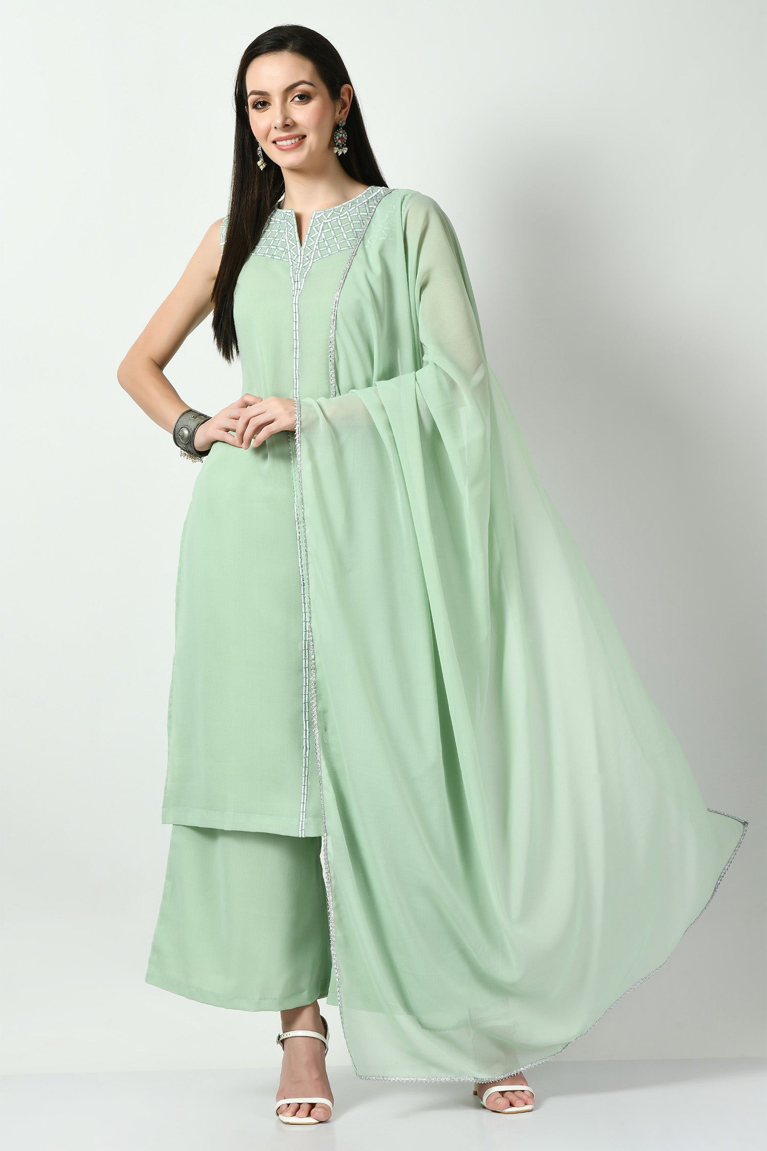 The light mint green georgette solid kurti set with subtle gota work for a neat and decent finish and charming look.