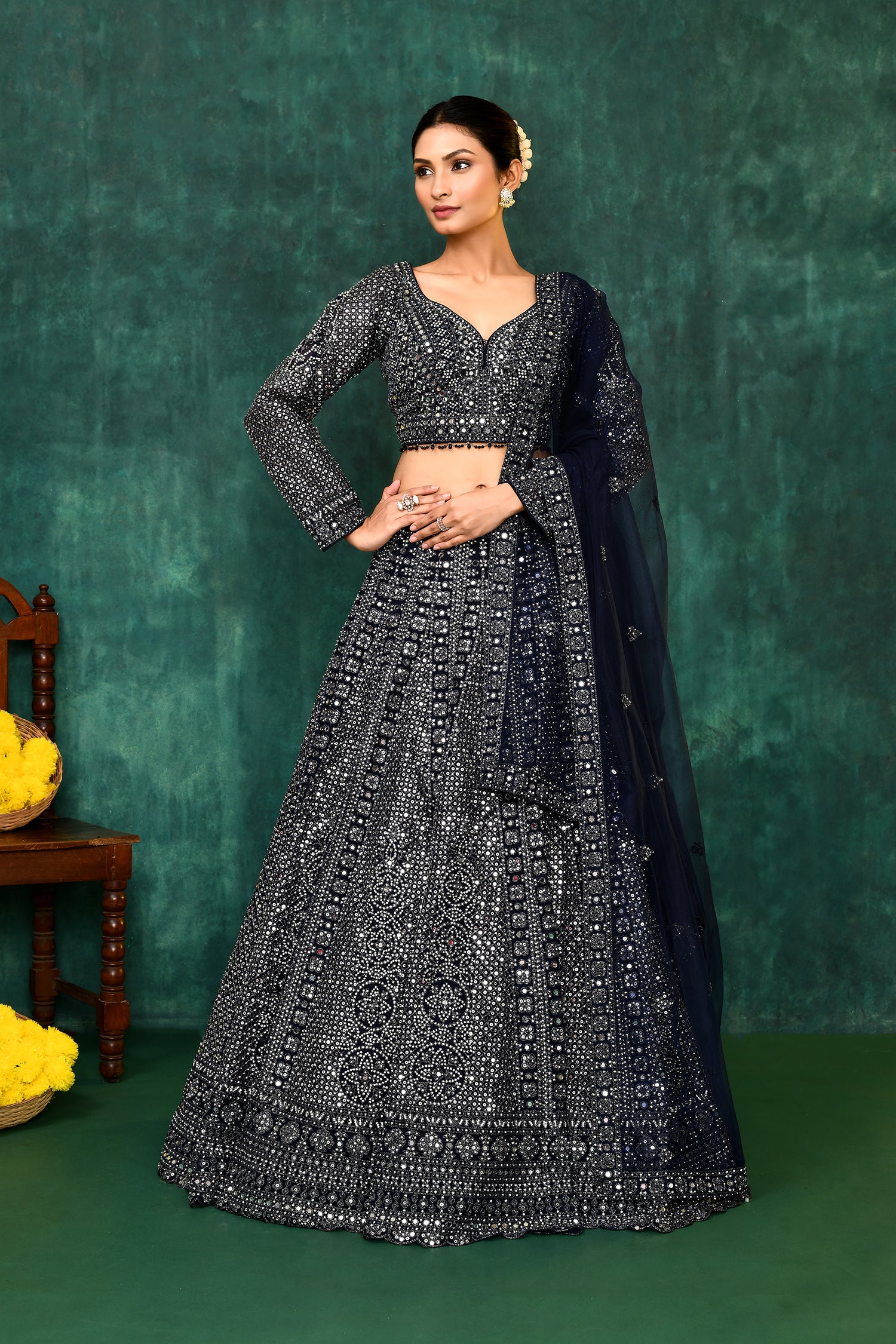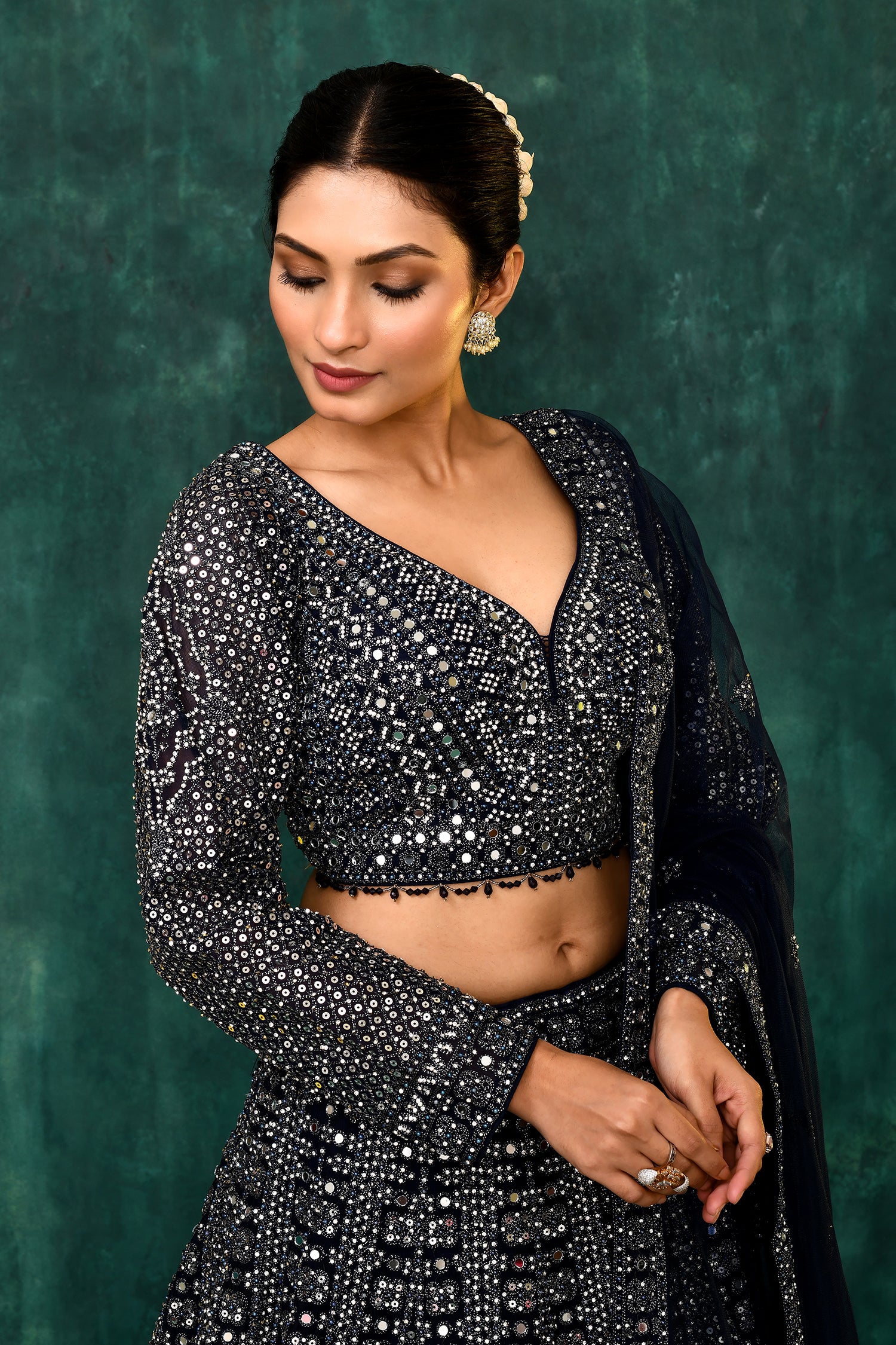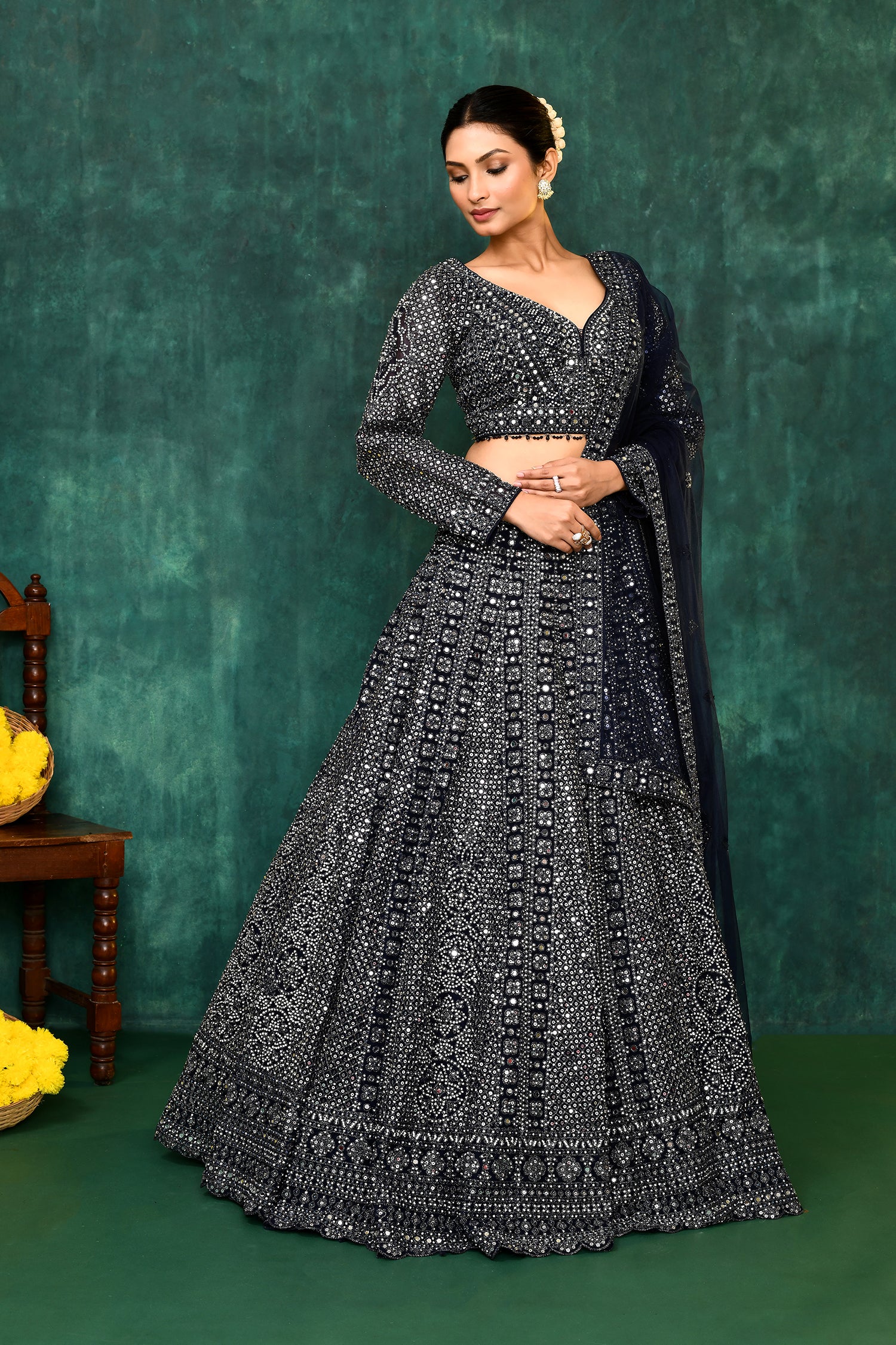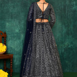 The navy blue georgette embroidered lehenga set with matching dupatta and blouse with sequin work for a rich ethnic look with gorgeous appearance.
