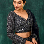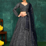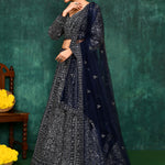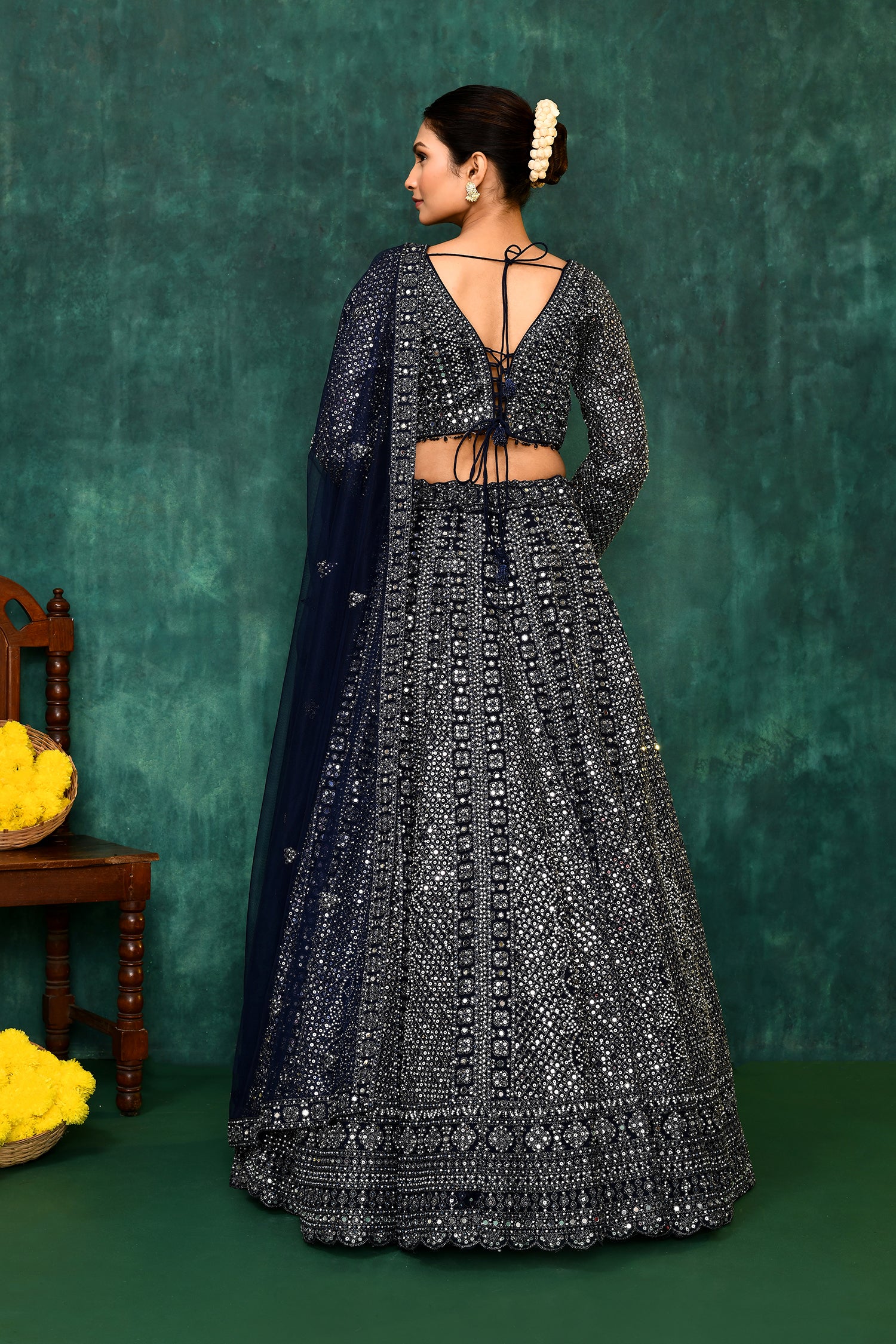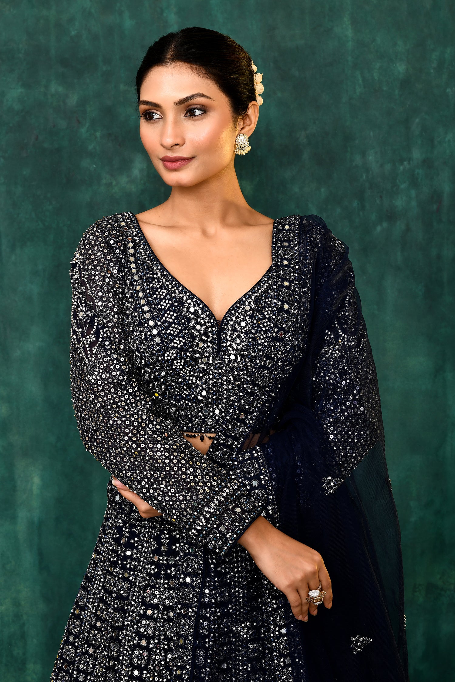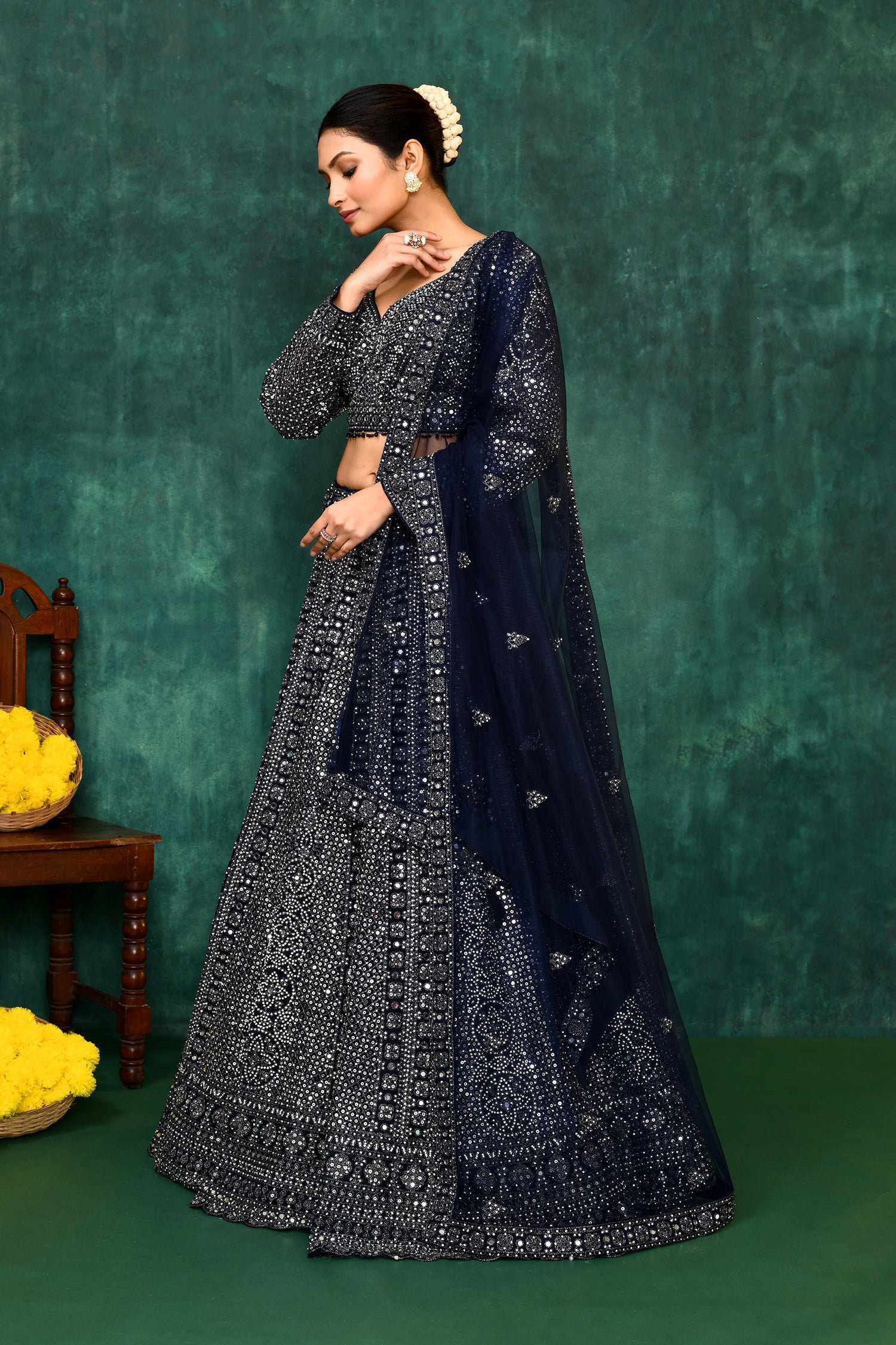 The navy blue georgette embroidered lehenga set with matching dupatta and blouse with sequin work for a rich ethnic look with gorgeous appearance.