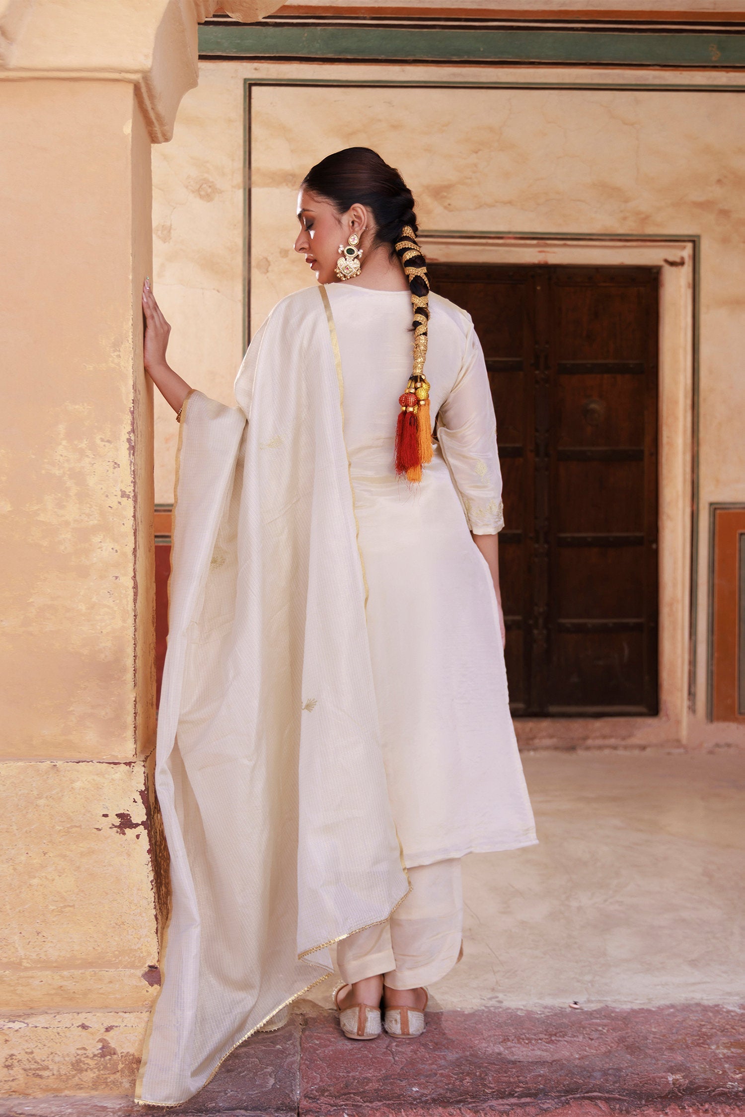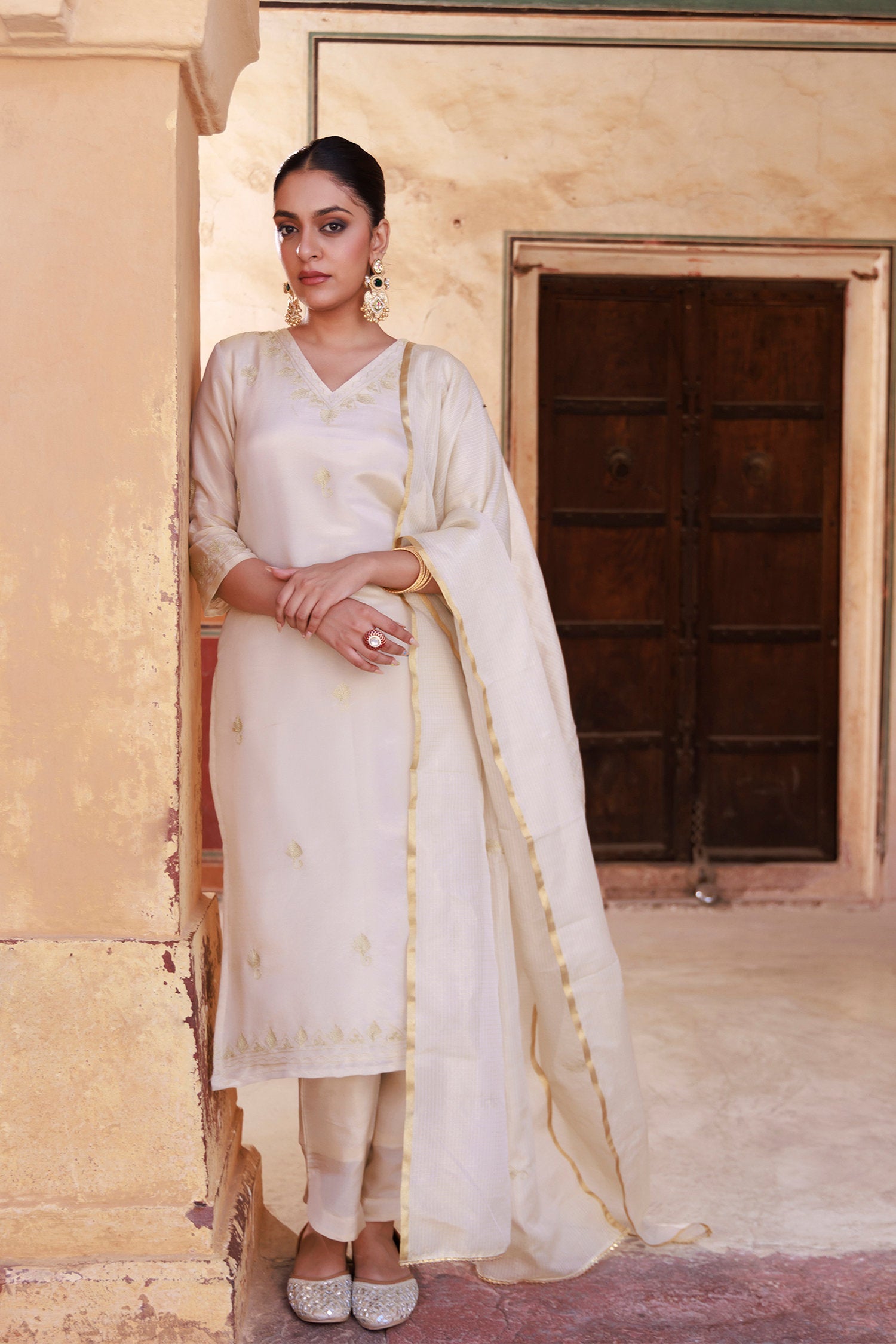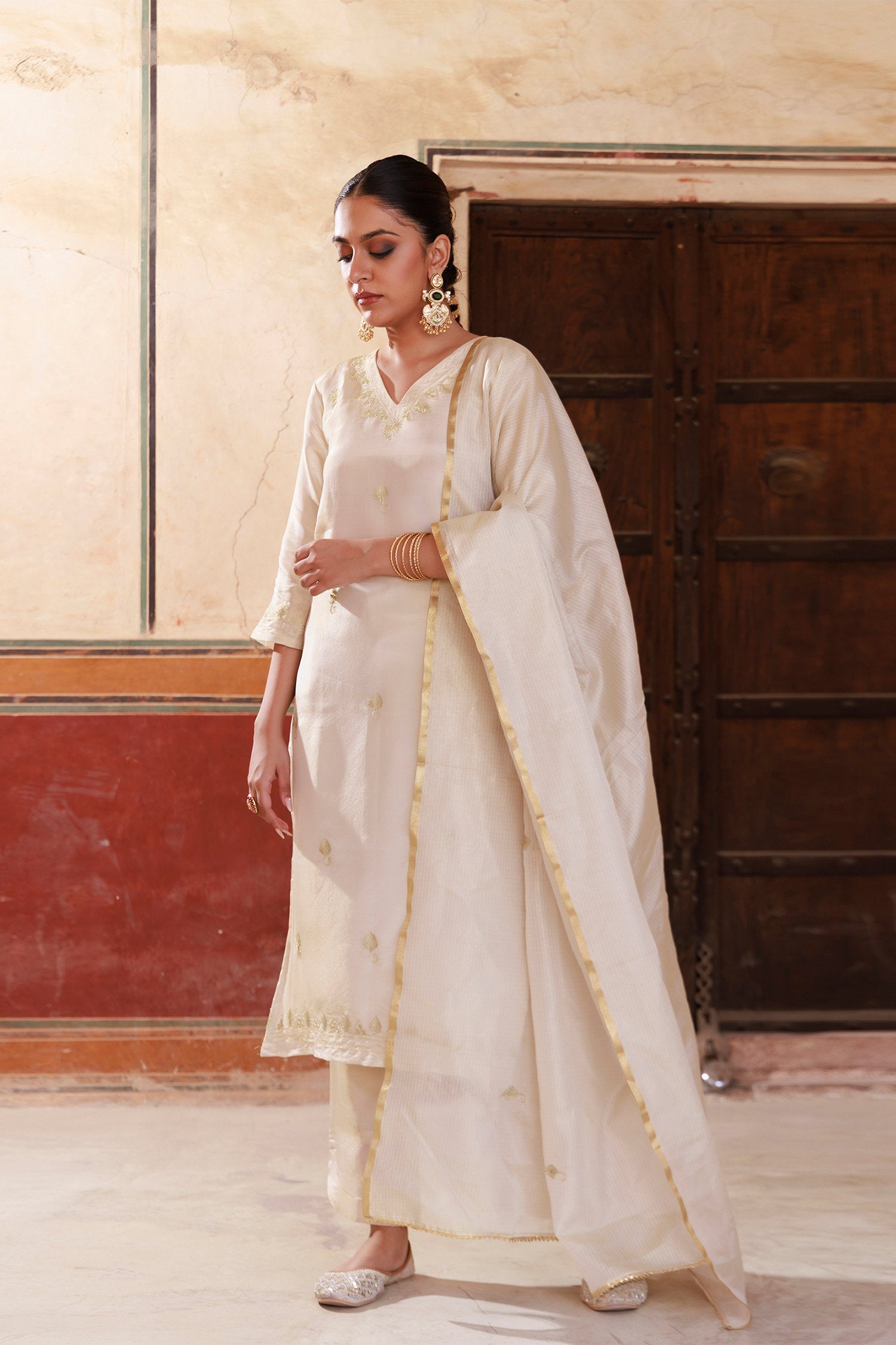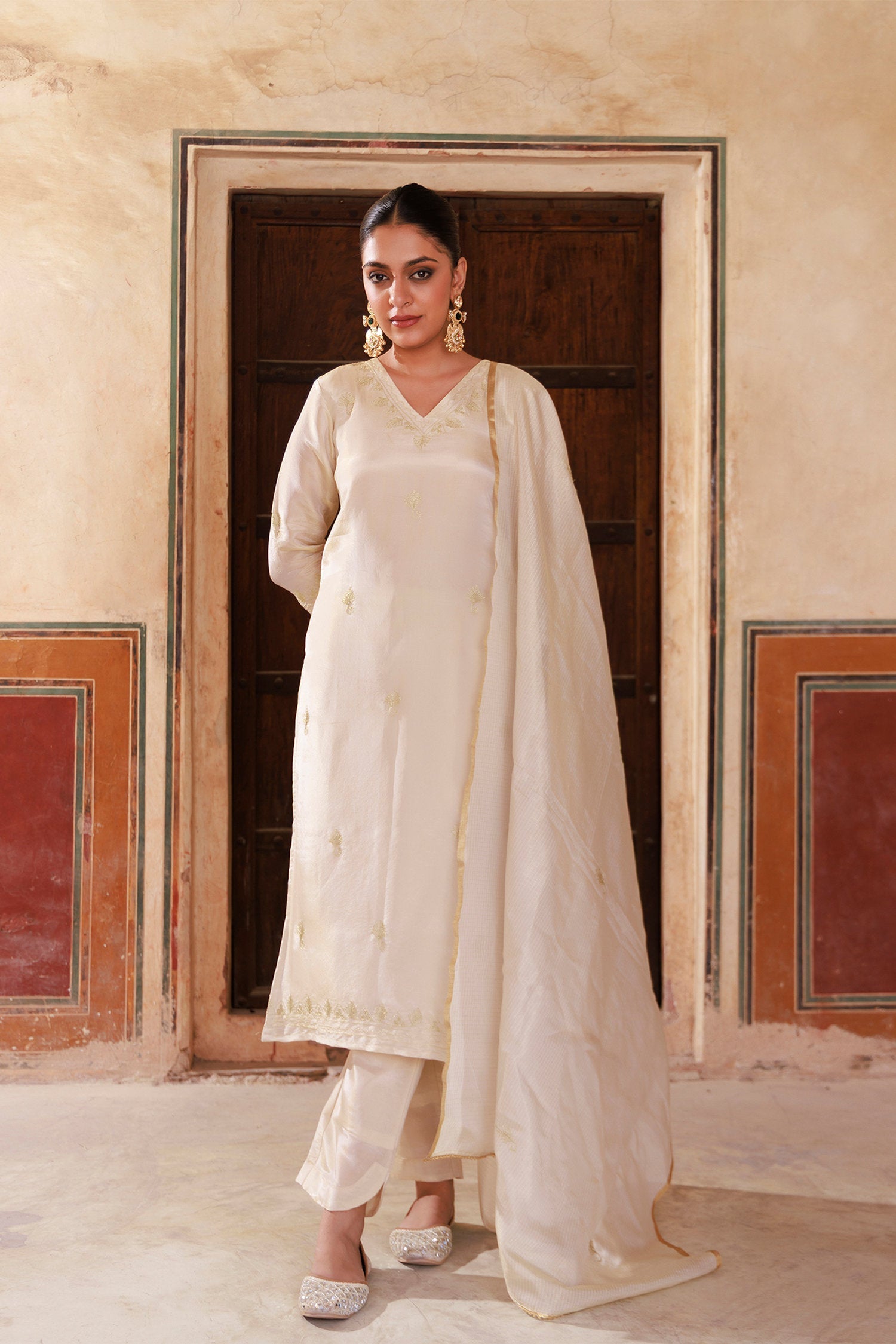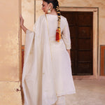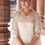Off-white tissue georgette kurta set features V neckline and mid-forearm sleeves complemented with dupatta and matching pants reflects grace and elegance suitable for any occasions