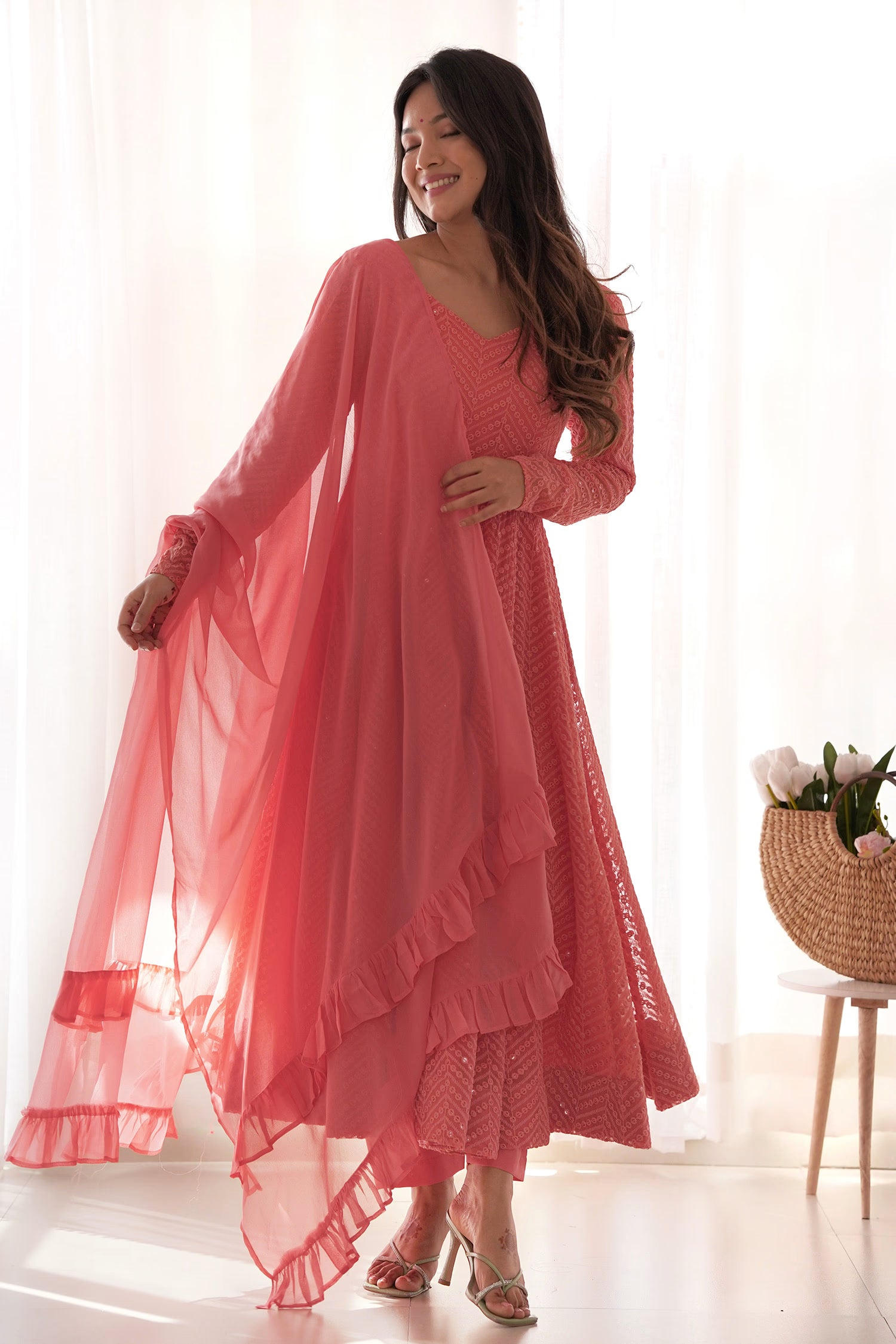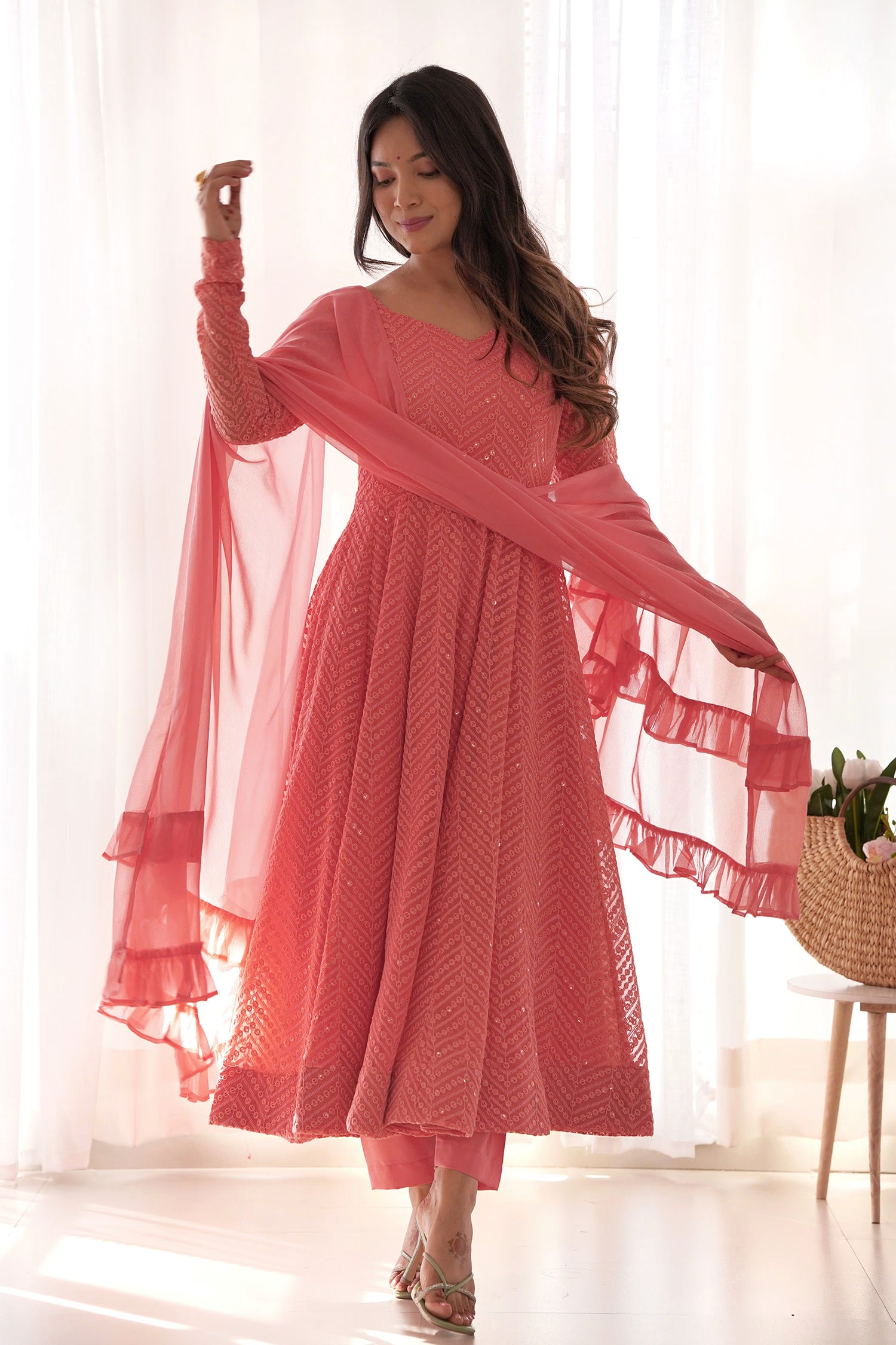 Peach Georgette Sequin Embroidered Anarkali Set