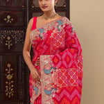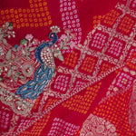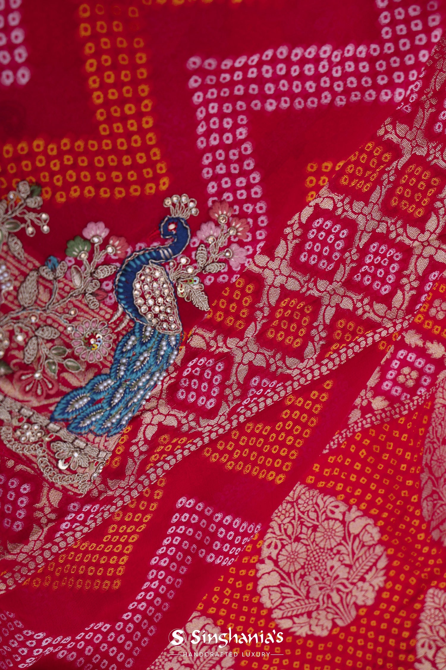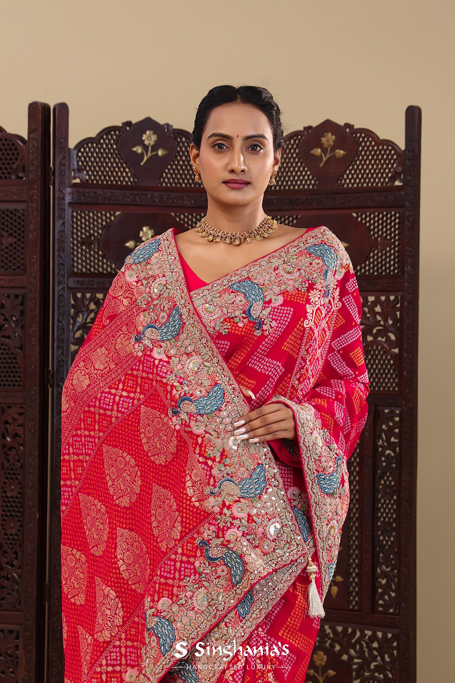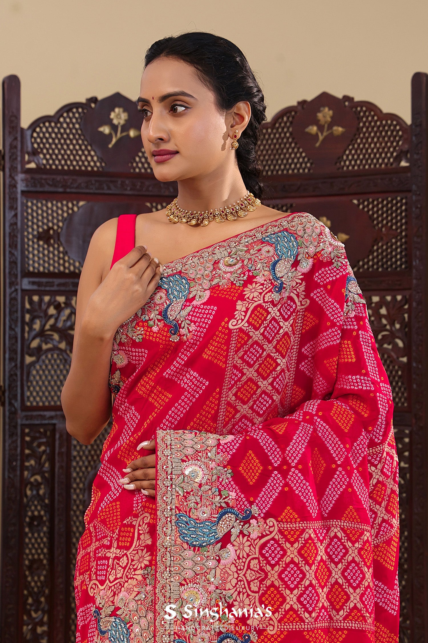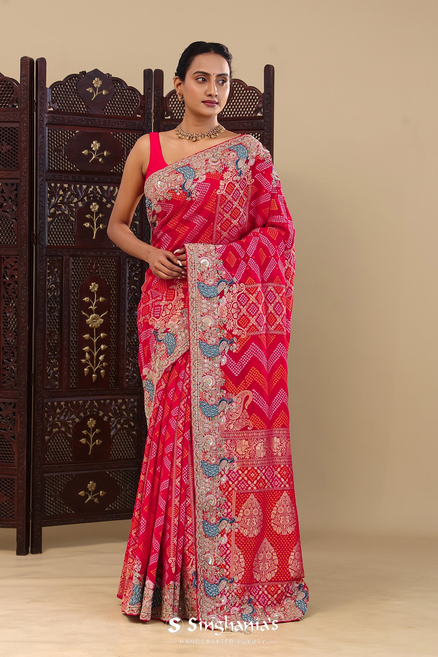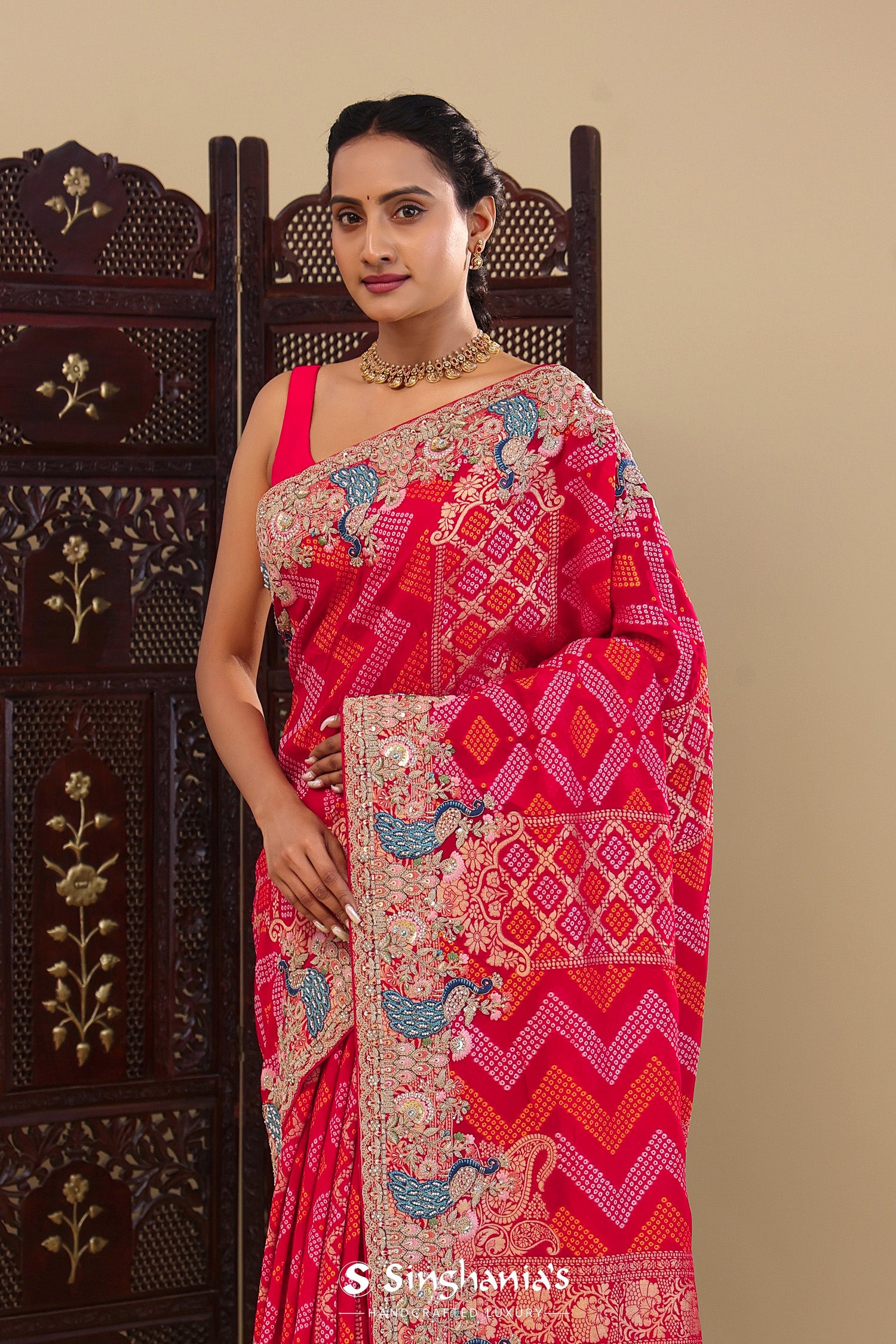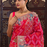 This bandhani pattern forming zig-zag pattern on the body of saree complemented with fancy border adorned with zari embroidery and sequins work
