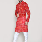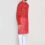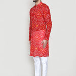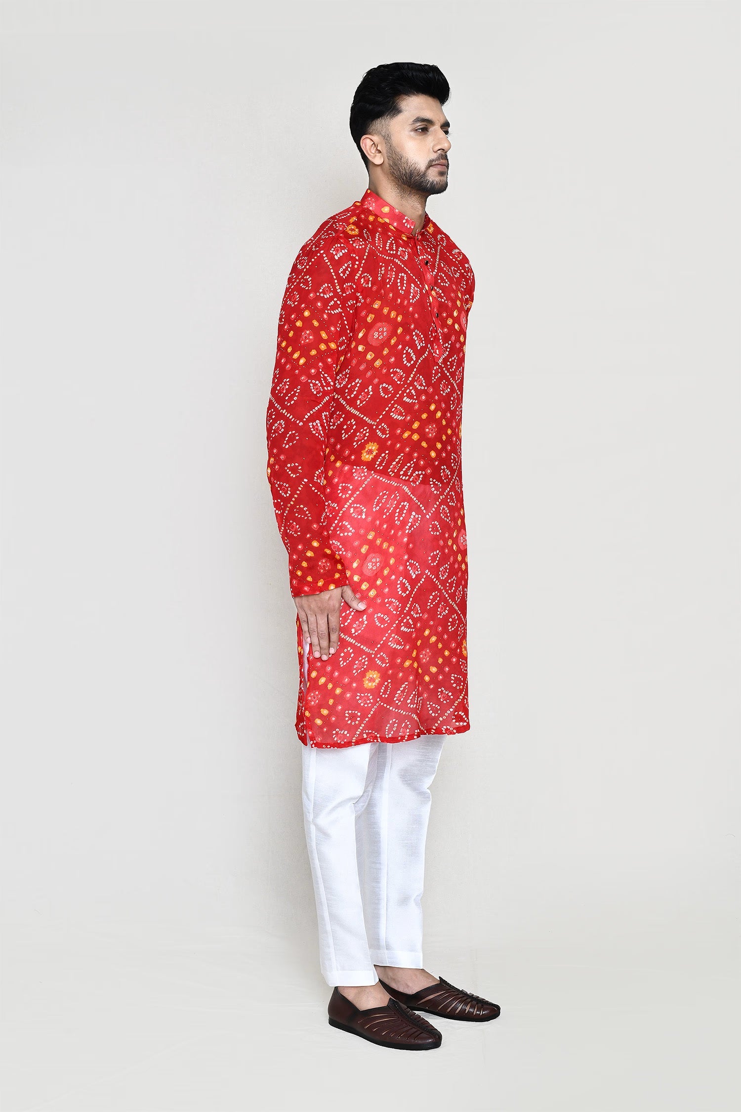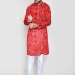 Vibrant red kurta set has georgette base with collar neck and chundari printed kurta paired with white silk pant . This looks eye catching and sophisticated to wear it at any occasion