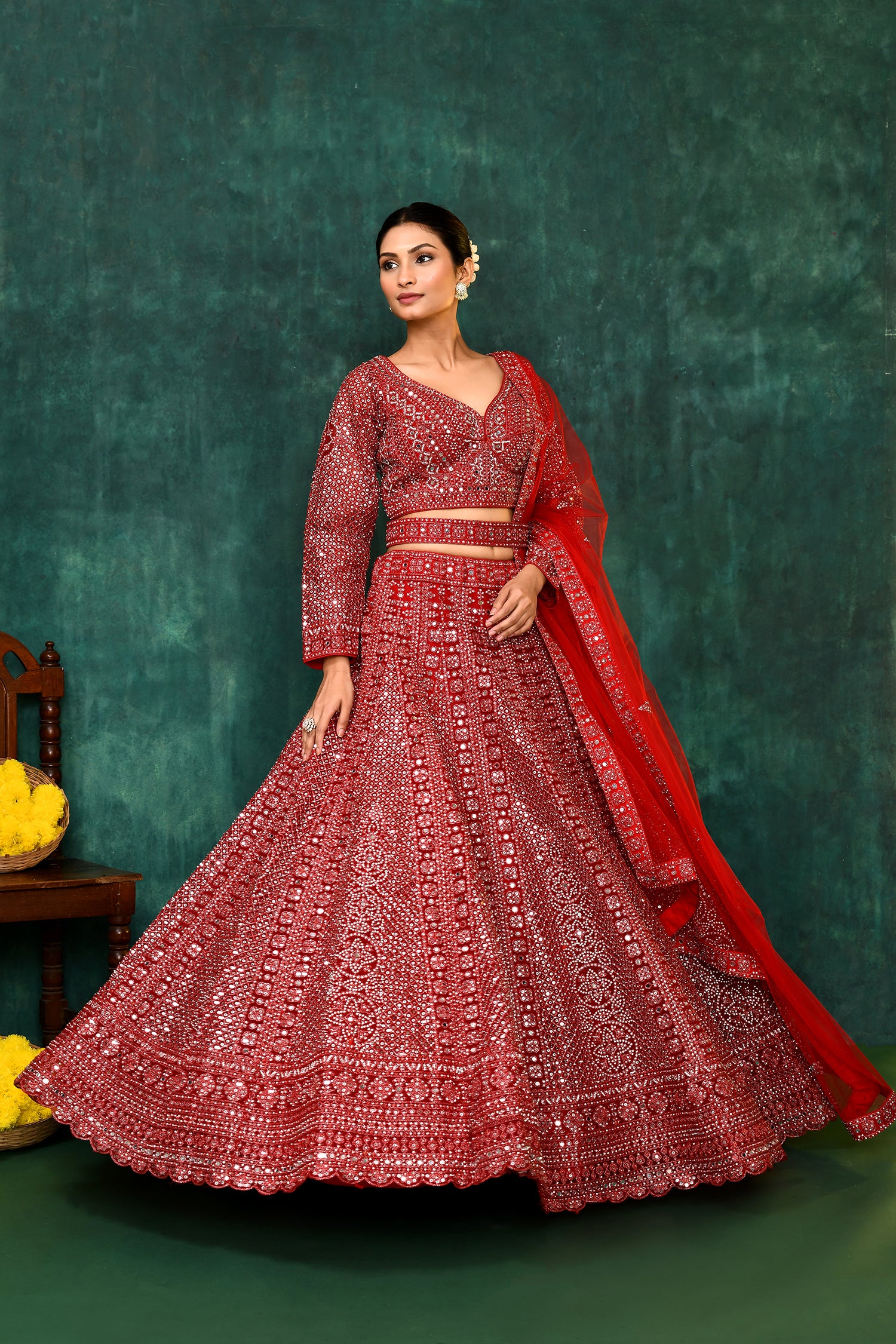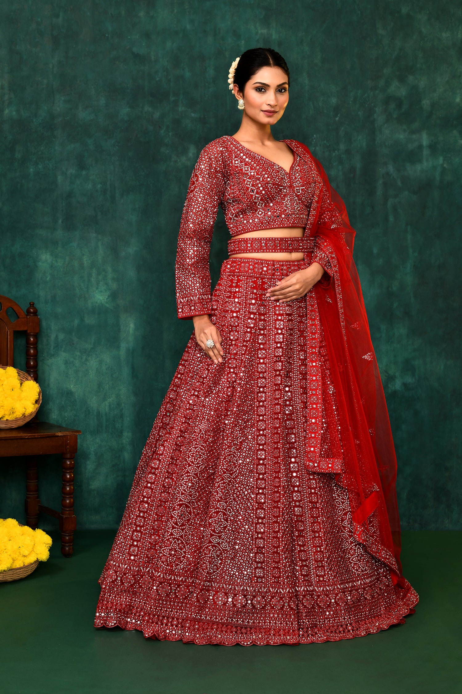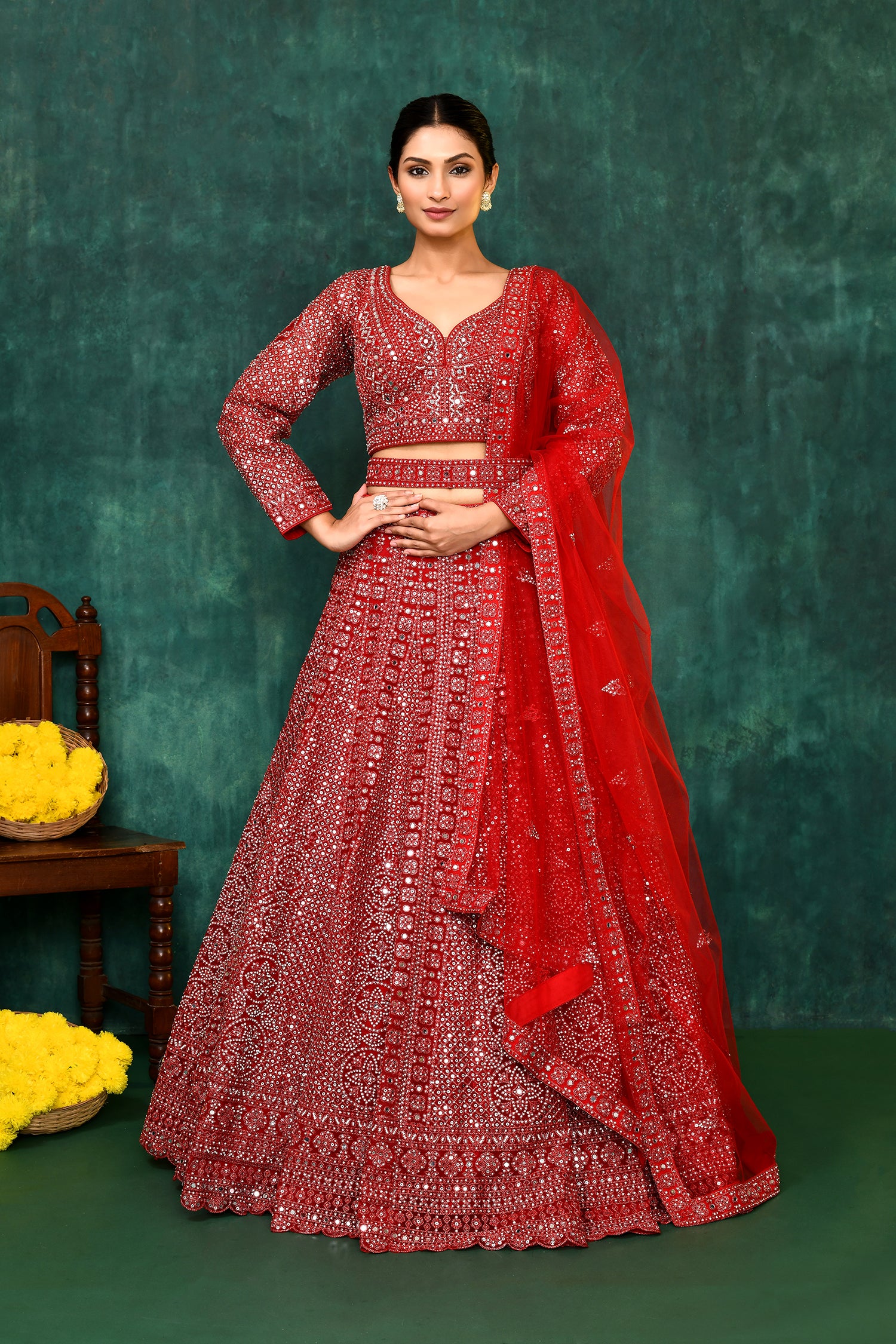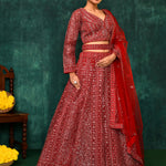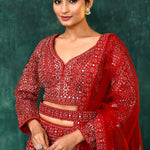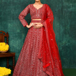 The rose red georgette embroidered lehenga set with matching dupatta and blouse with sequin work for a rich ethnic look with gorgeous appearance.