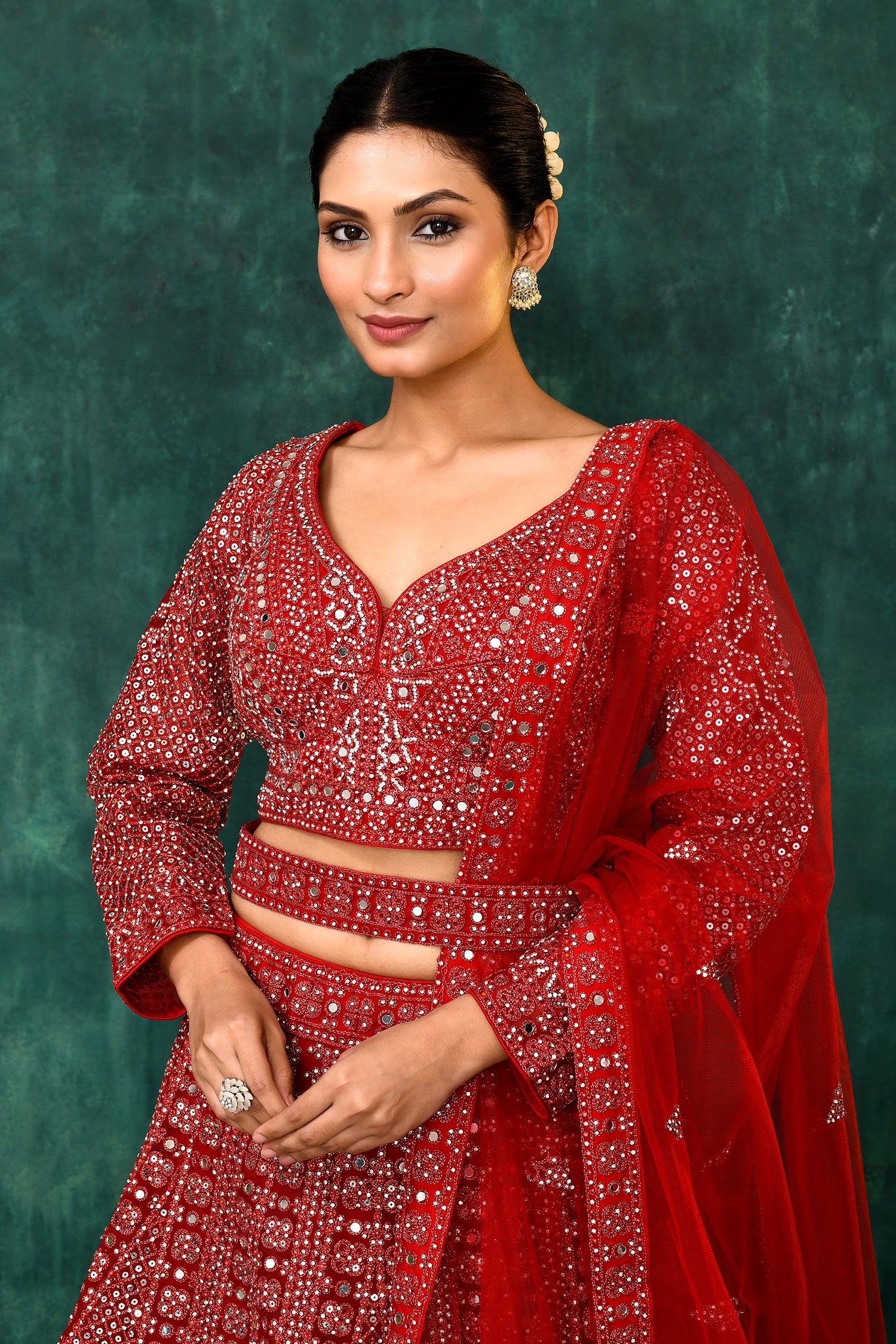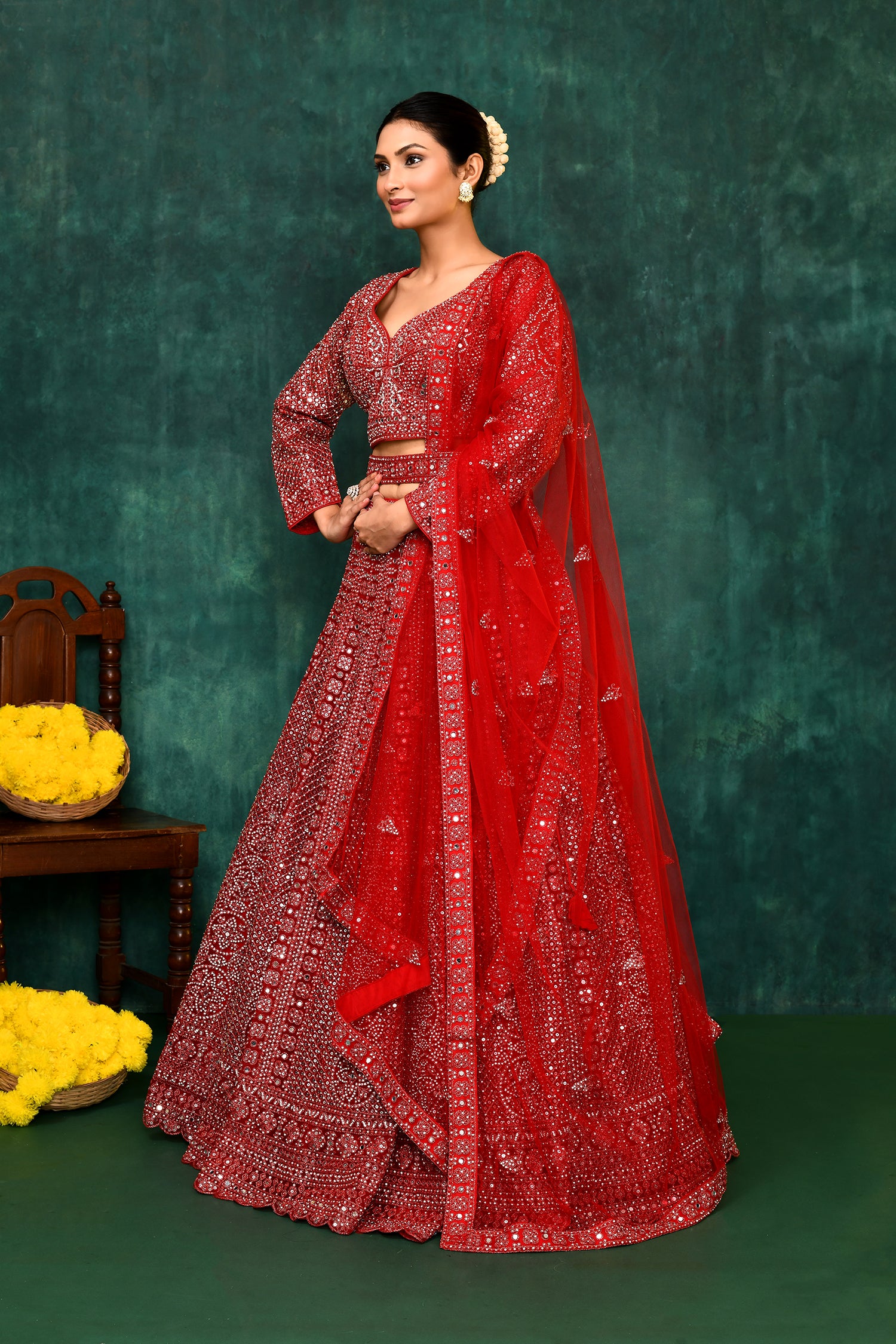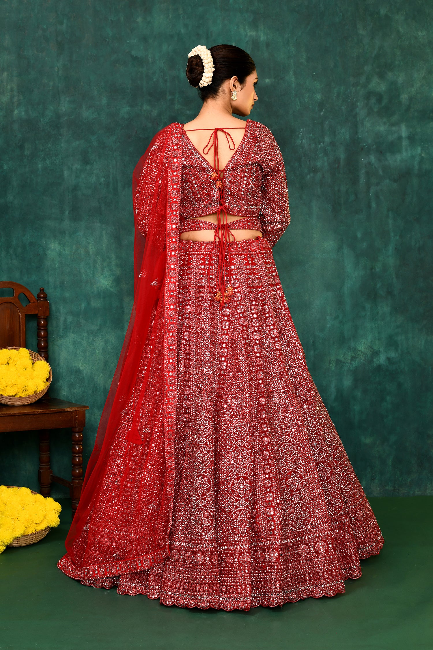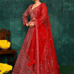The rose red georgette embroidered lehenga set with matching dupatta and blouse with sequin work for a rich ethnic look with gorgeous appearance.