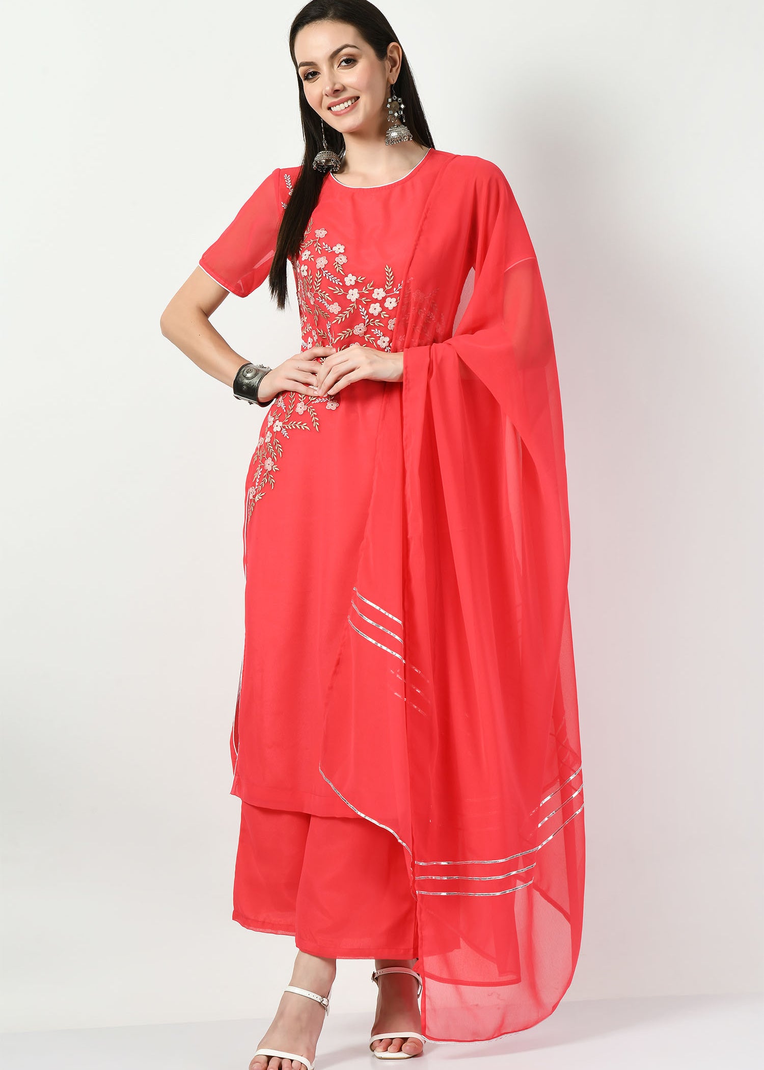 Decadent, versatile, and breathable, georgette sarees have a way of seeping into a woman’s fashion game and taking over her wardrobe. What was introduced as a fun choice in the 1970s has now become a way of life.Pure georgette sarees became popular in India during the 1970s and 1980s. They were introduced as a lighter, more comfortable alternative to traditional silk sarees. Initially, georgette sarees were only available in a limited range of colours and designs. However, over time, they became more popular and were produced in a wider range of colours, prints, and embellishments. Today, georgette sarees, “designer wear,” are popular among women of all ages and are worn for various occasions. They are available in a range of designs, from simple and elegant to heavily embellished and embroidered. In recent years, designers have experimented with different styles and fabrics to create contemporary georgette sarees that are suitable for modern fashion trends.