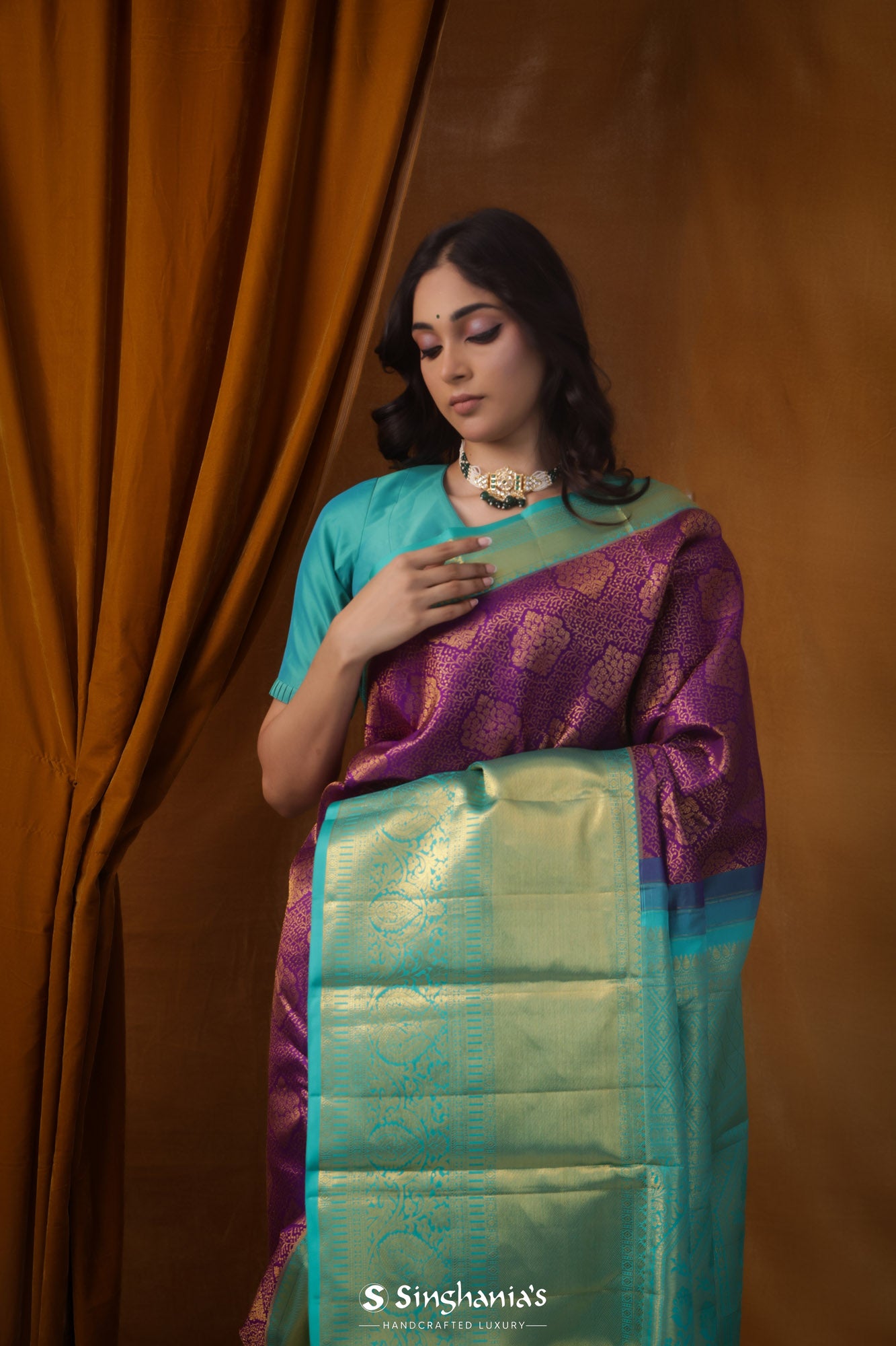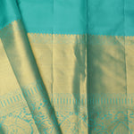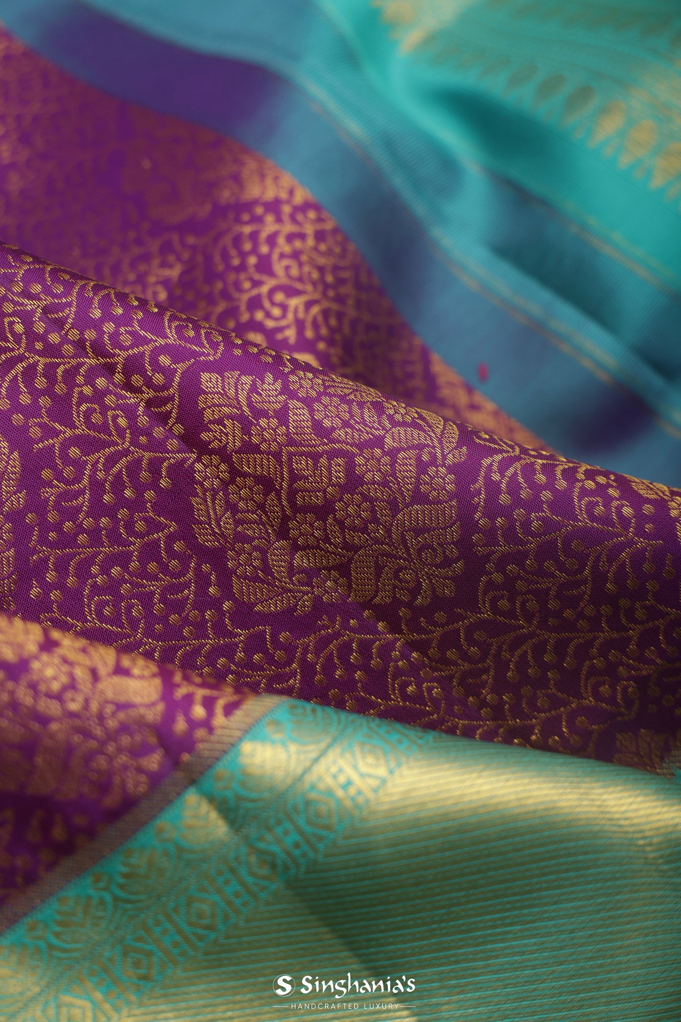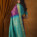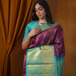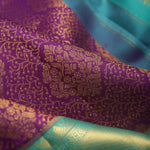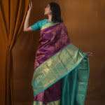 Exude royalty in this rich Dark Magenta Purple Kanjivaram Silk Saree ornamented with intricate gold zari woven floral jaal design. The contrasting aqua blue border with floral and kaddi pattern elevates the elegance. Perfect for festive celebrations.