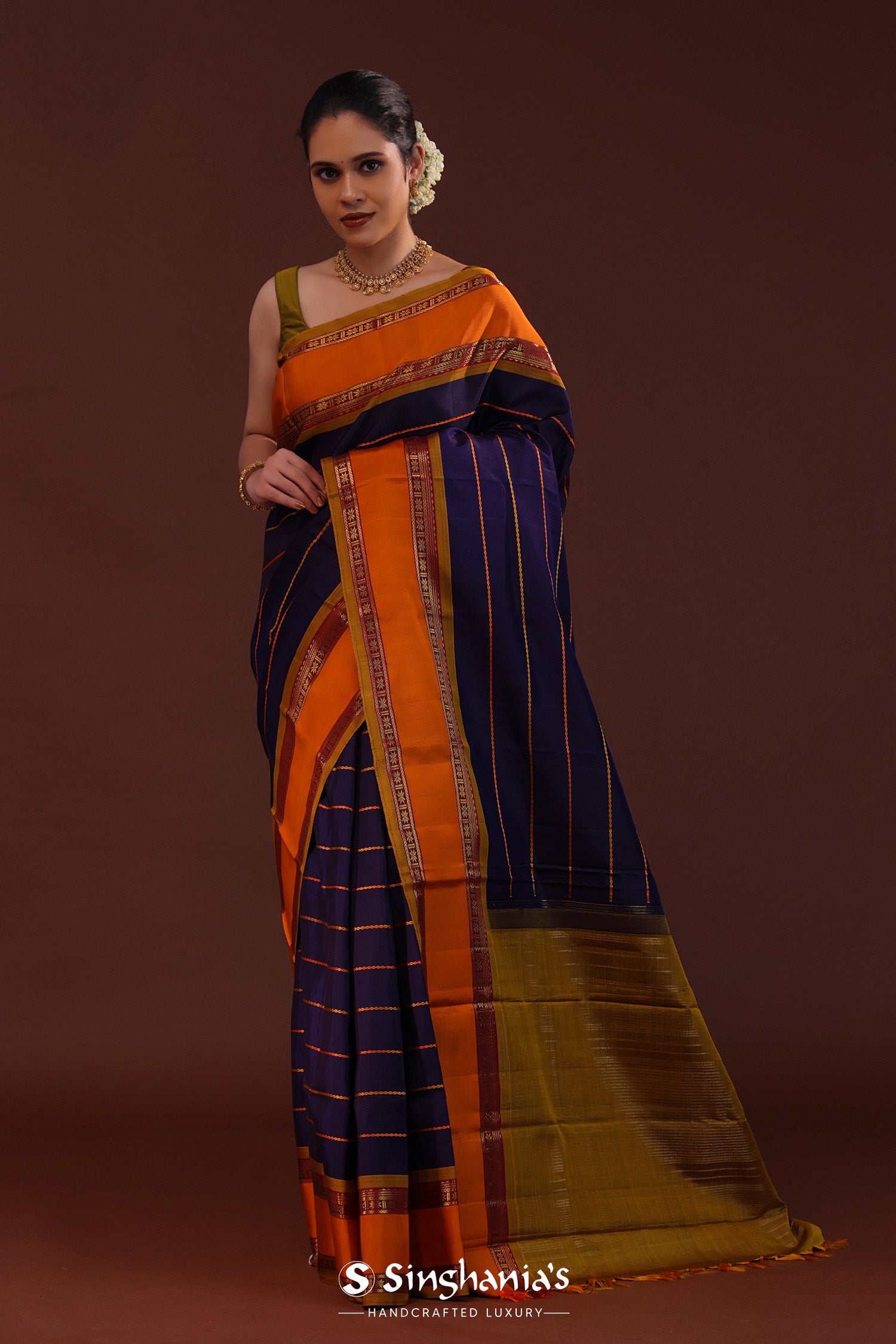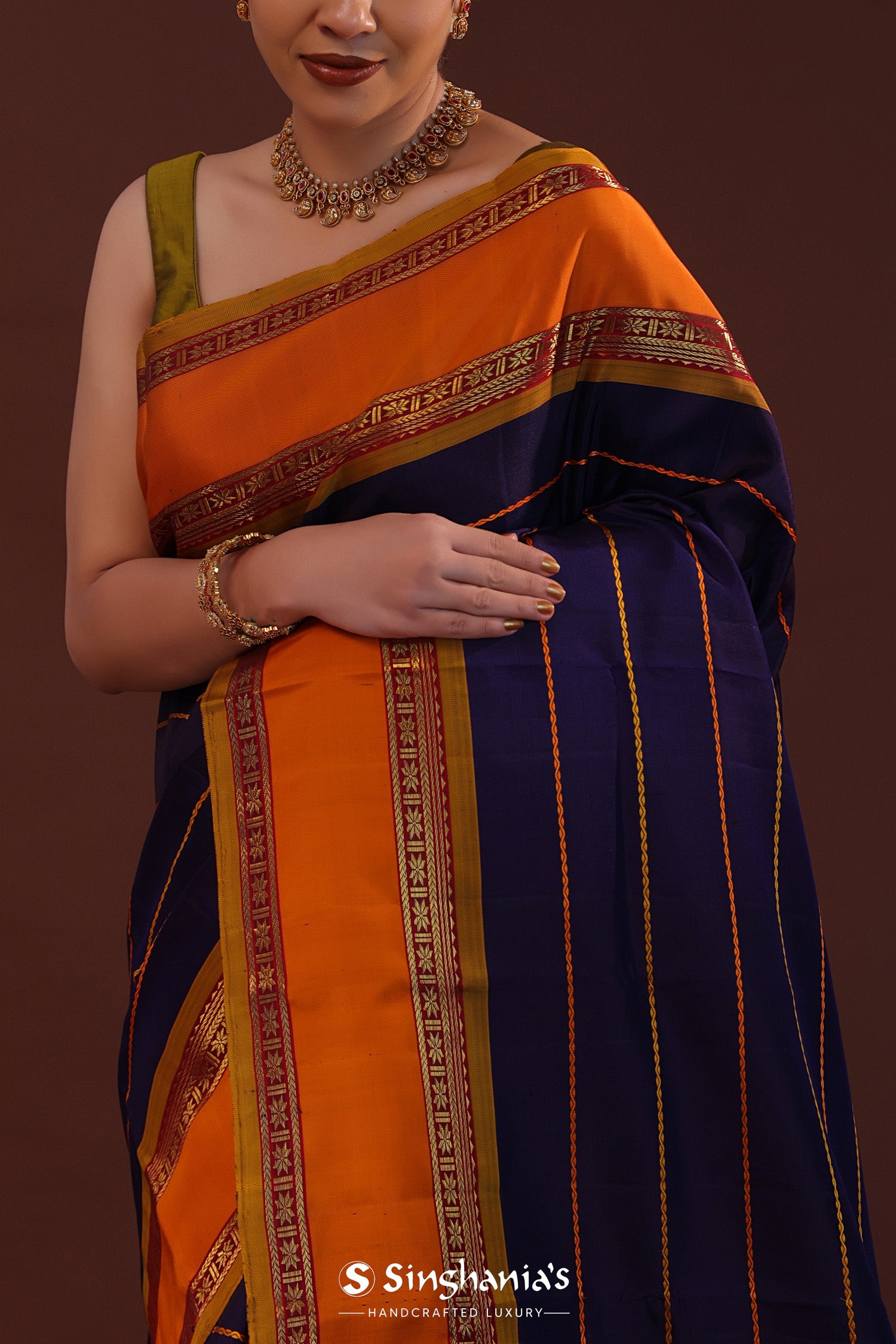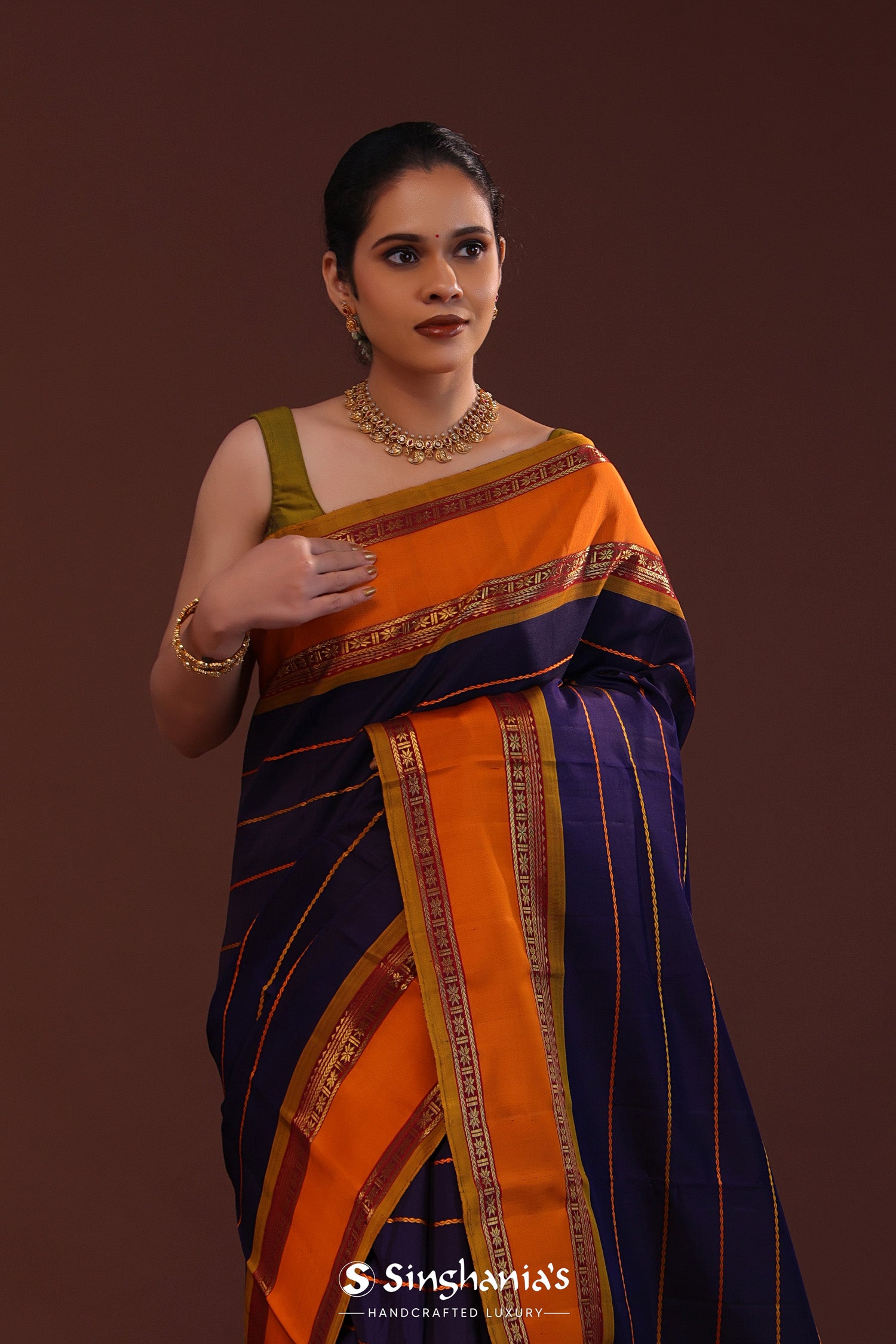 Deep Violet Kanjivaram Silk Saree With Horizontal Stripes