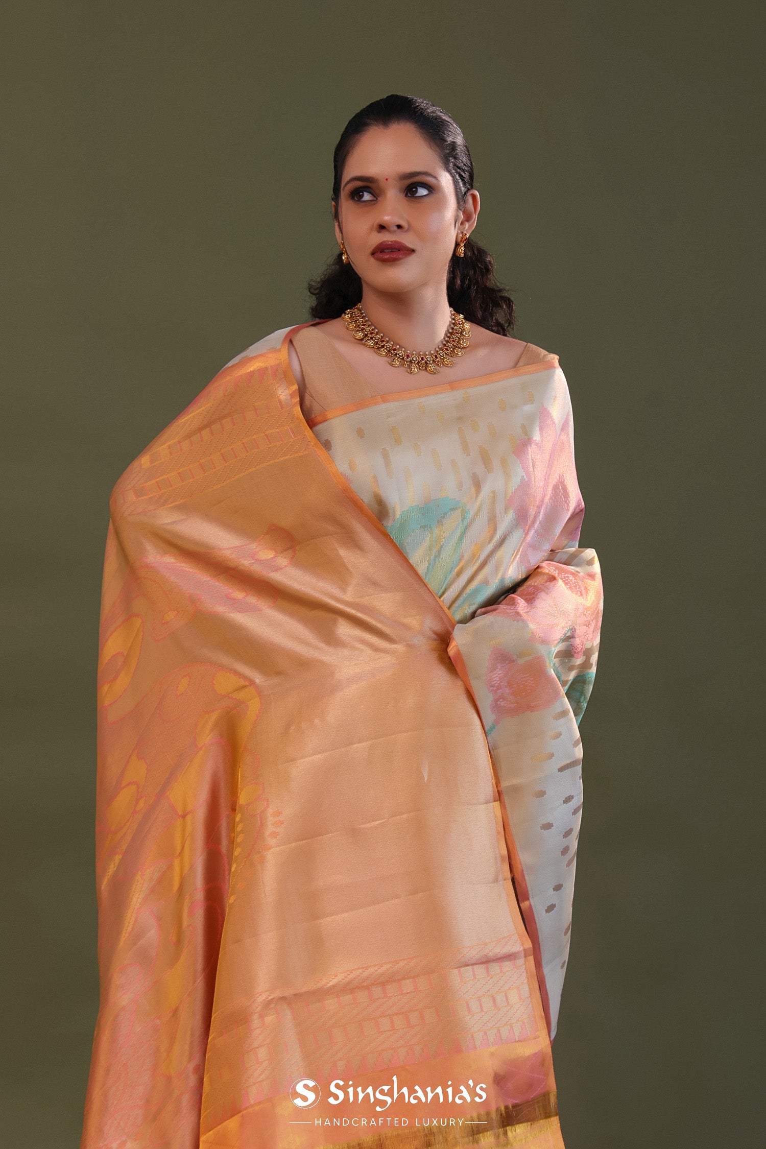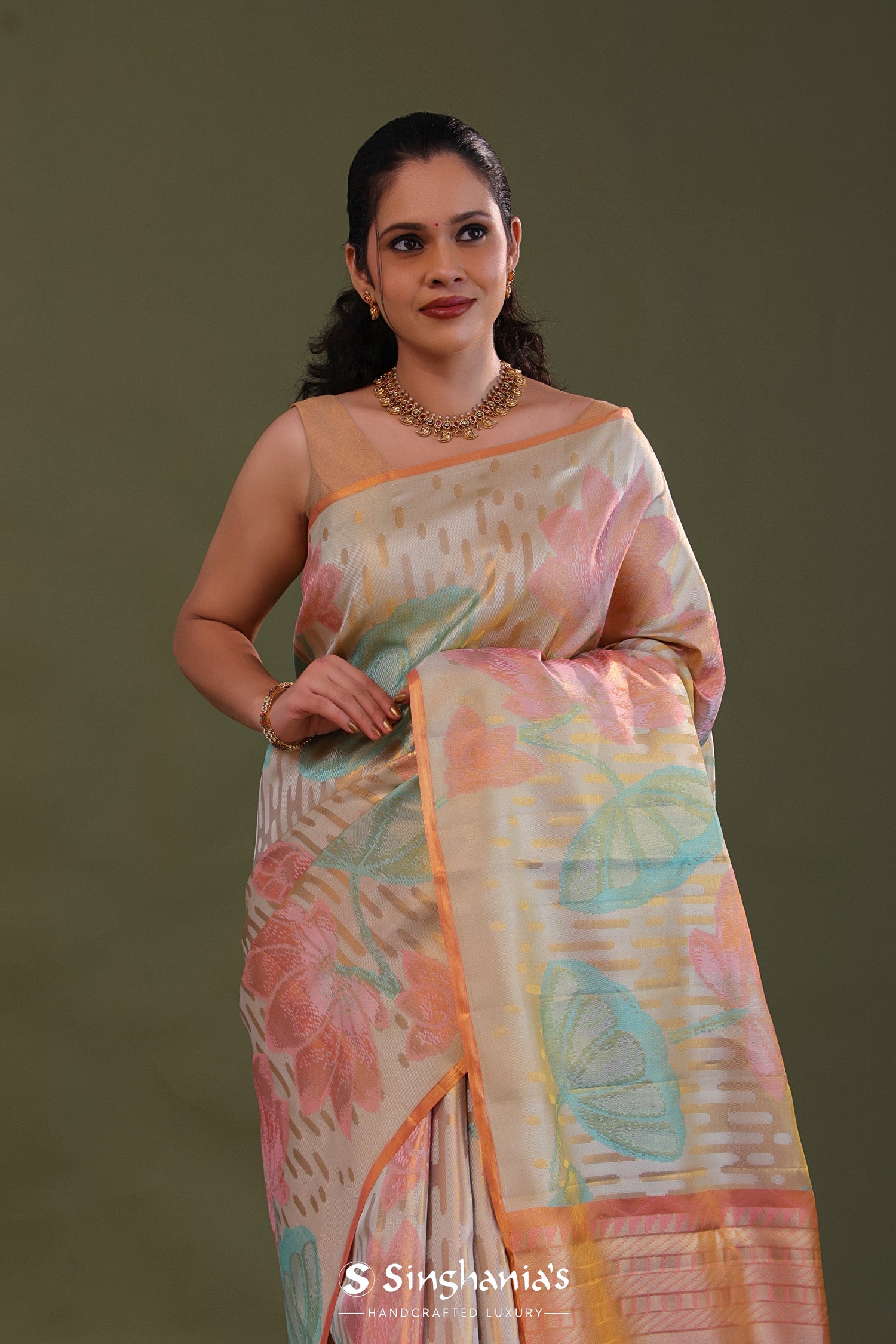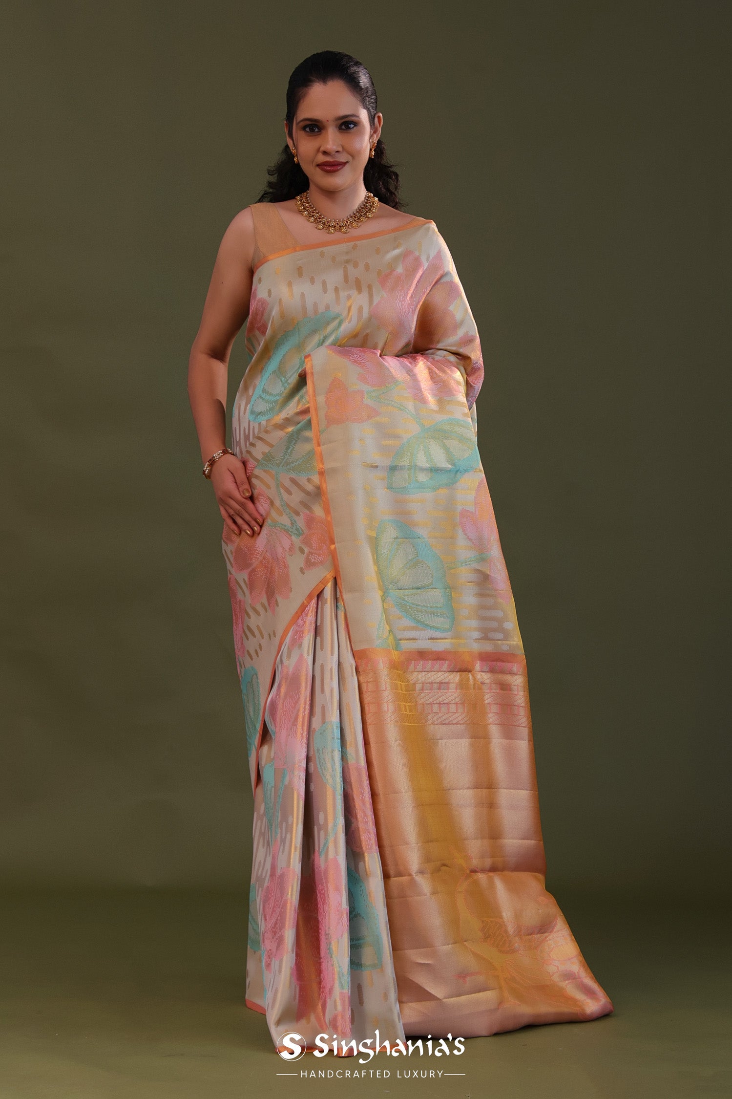 The floral woven design in vibrant colors on the body of Golden kanjivaram tissue designer saree complemented with golden edge and contrast unstitched blouse