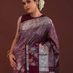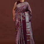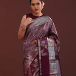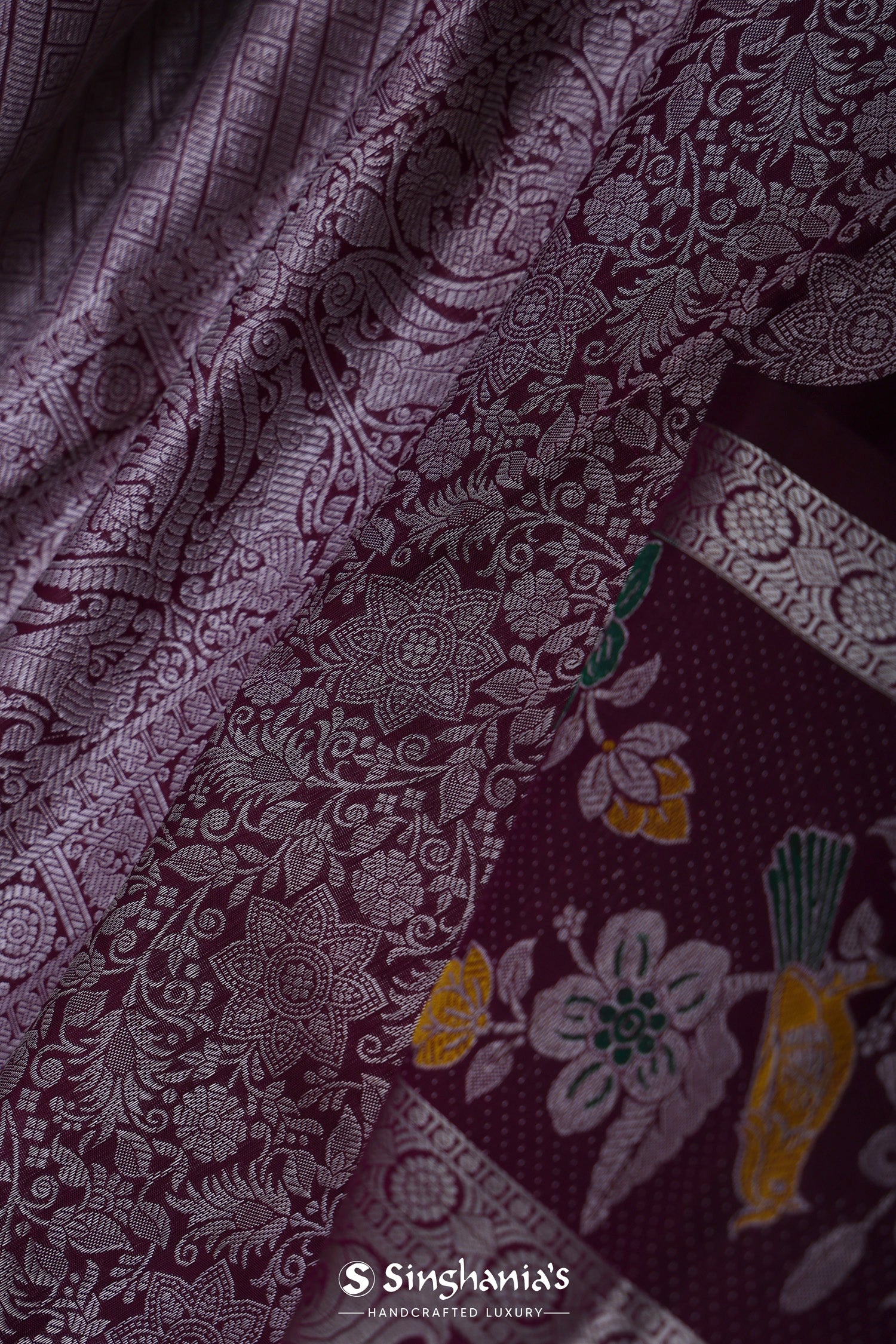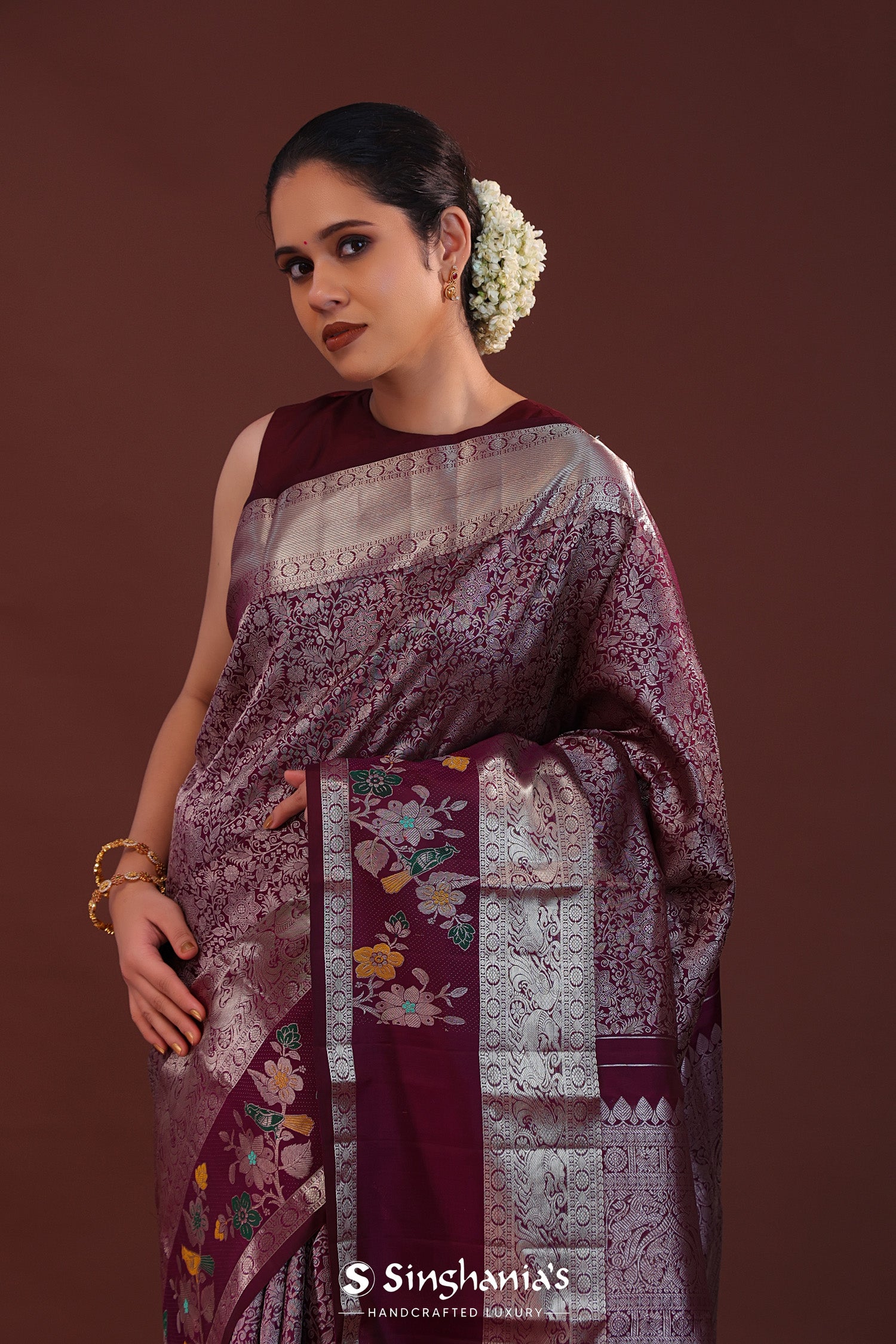 The floral jaal with silver jaal of the Gondola magenta red kanjivaram silk saree complemented with meenakari border and unstitched blouse