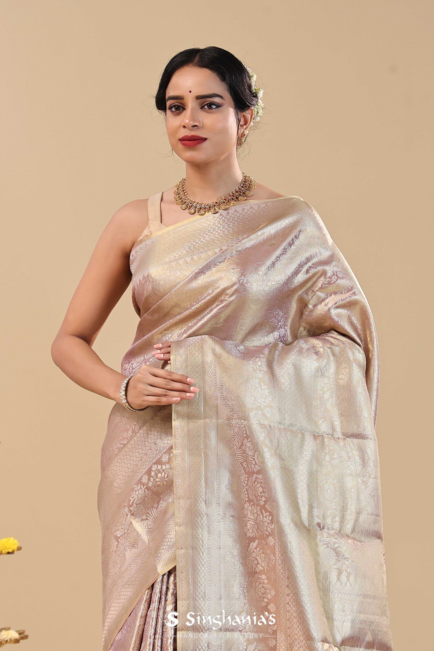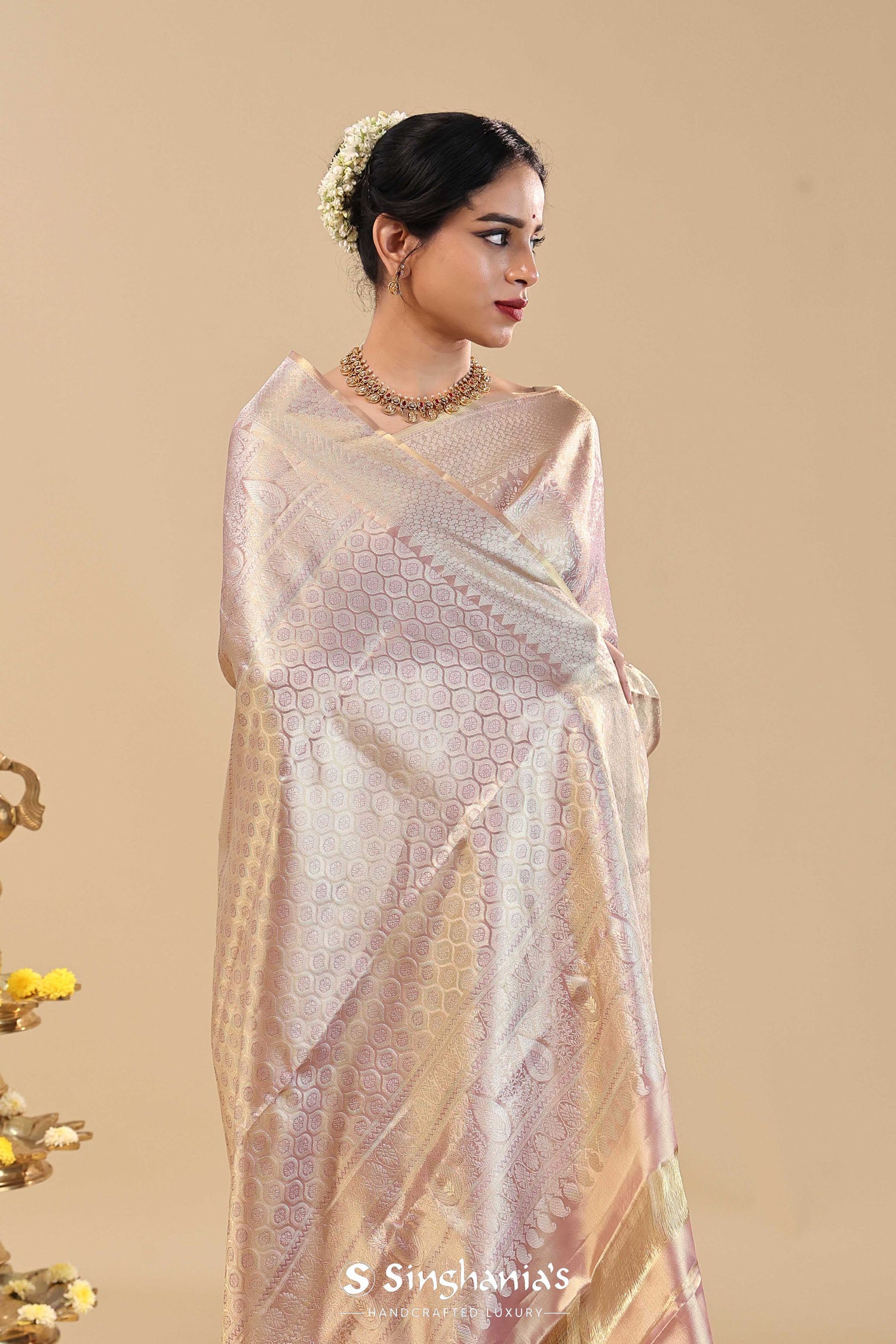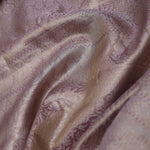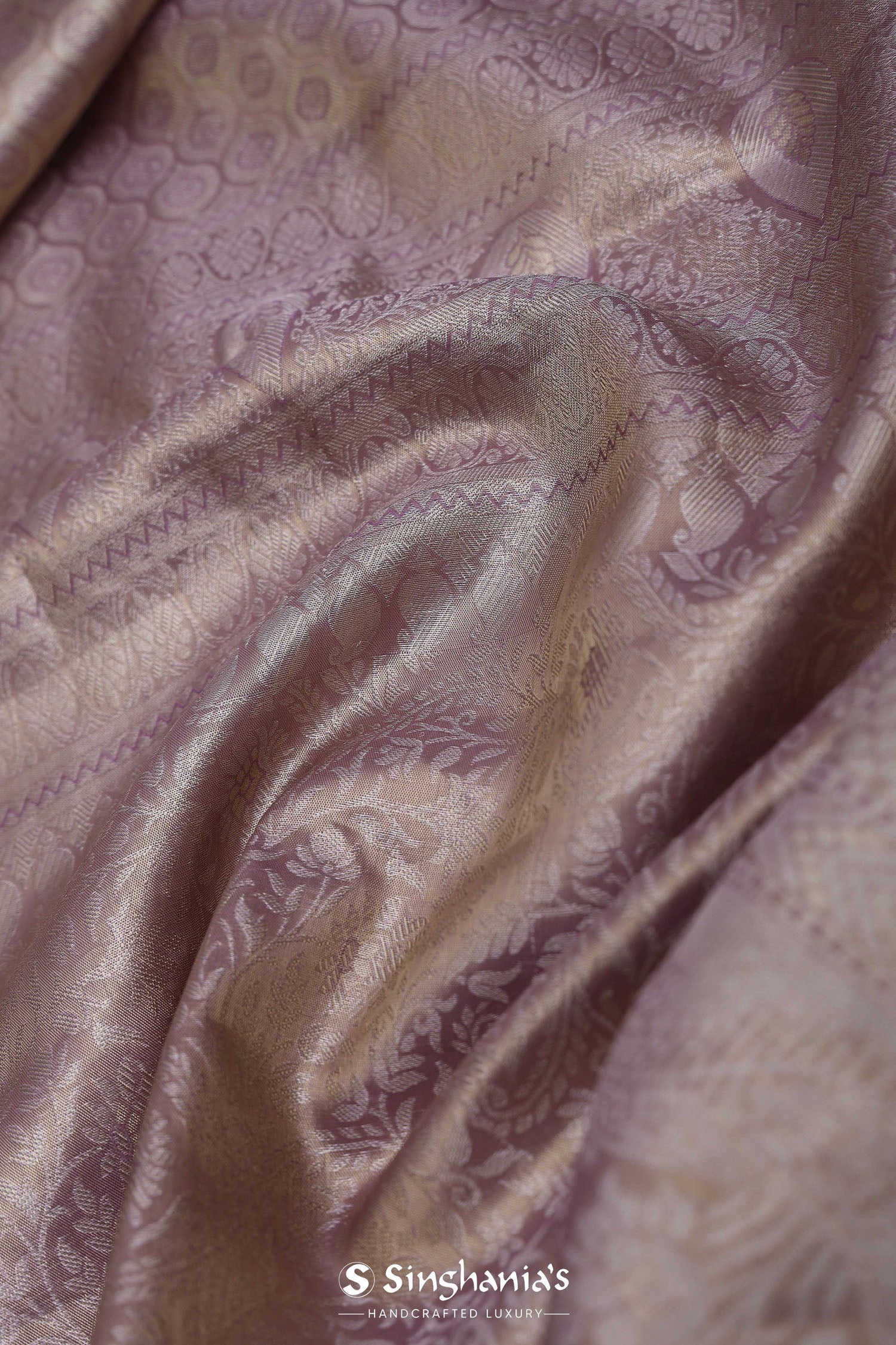 Lilac kanjivaram saree features intricate floral jaal woven with silver zari along with designer border with is adorned with silver zari creating a wave and repeated floral pattern making it look elegant and traditional for any special occasions like festive and wedding